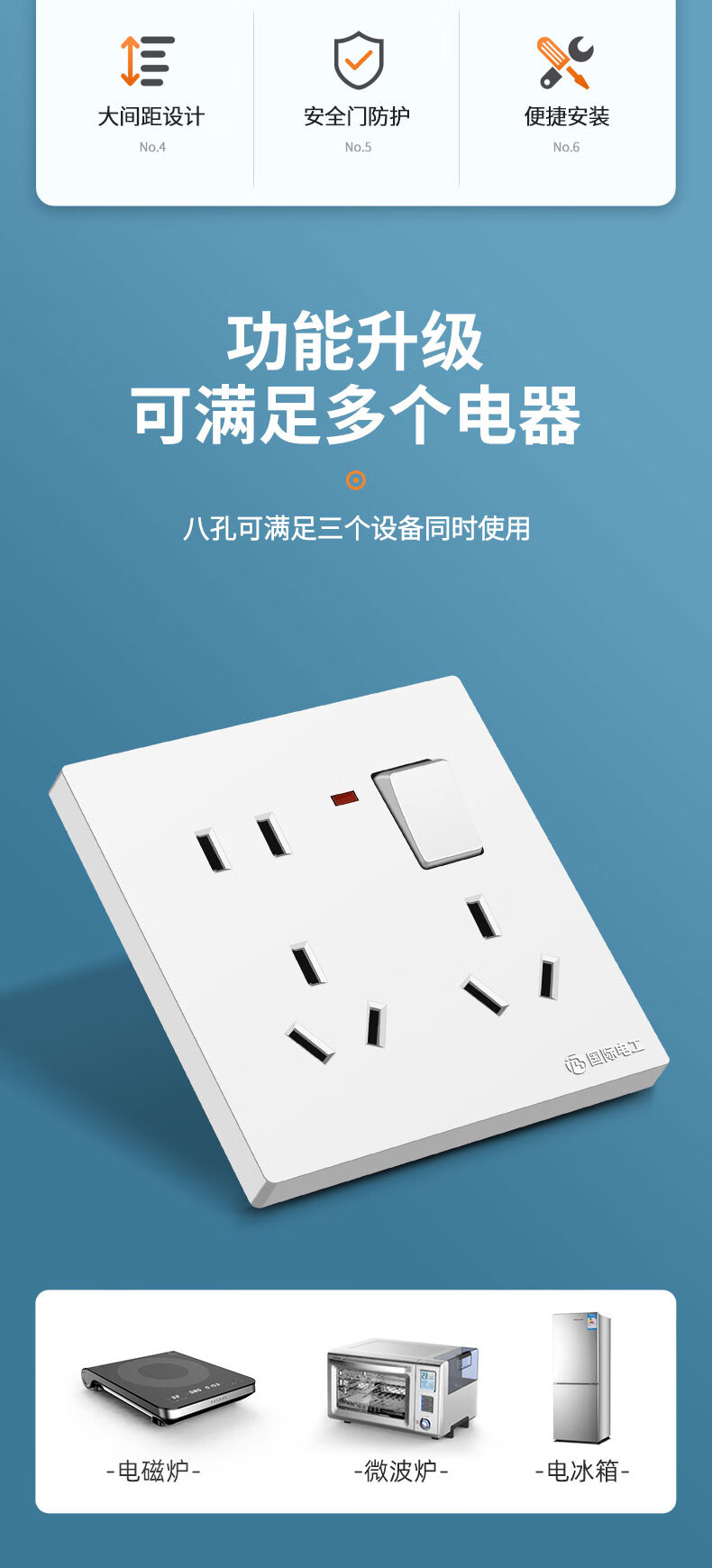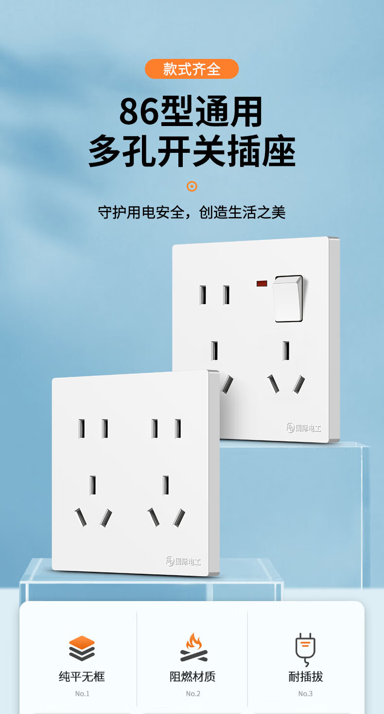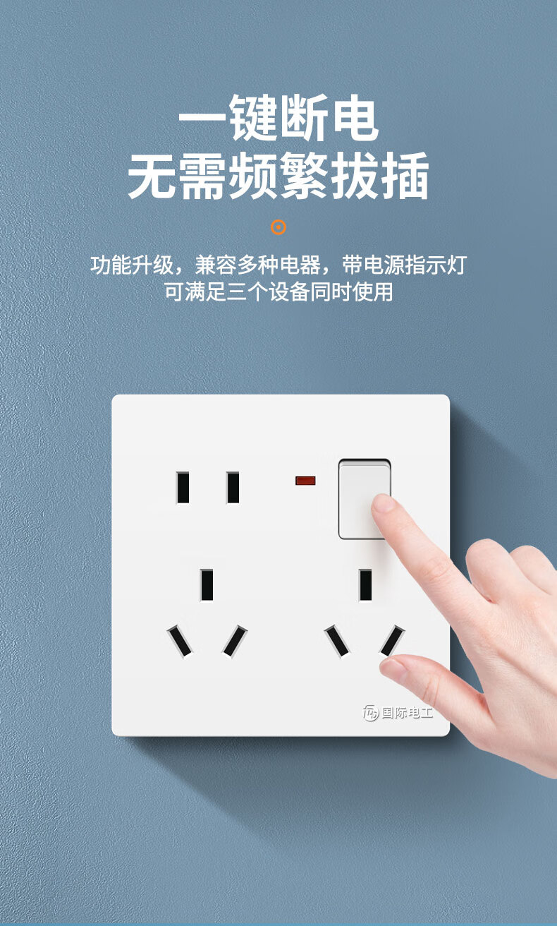 国际电工86型一开八孔插座带开关暗装墙壁多功能面板多孔白色电源二三插 一开单控带五孔