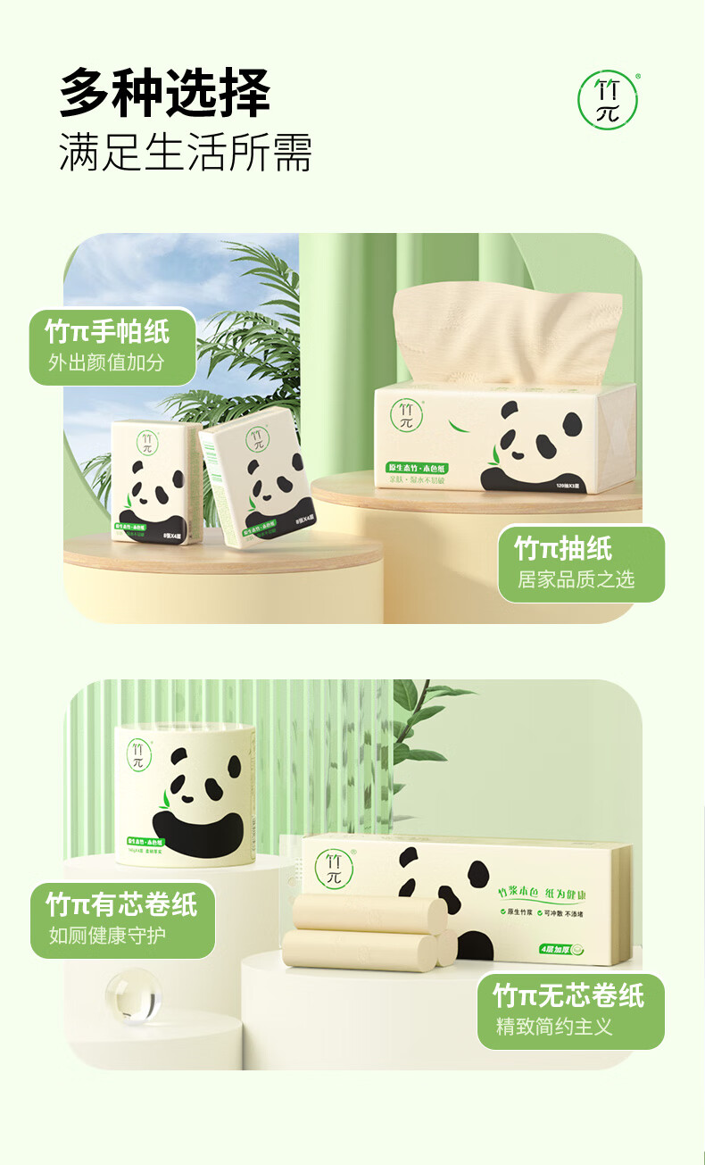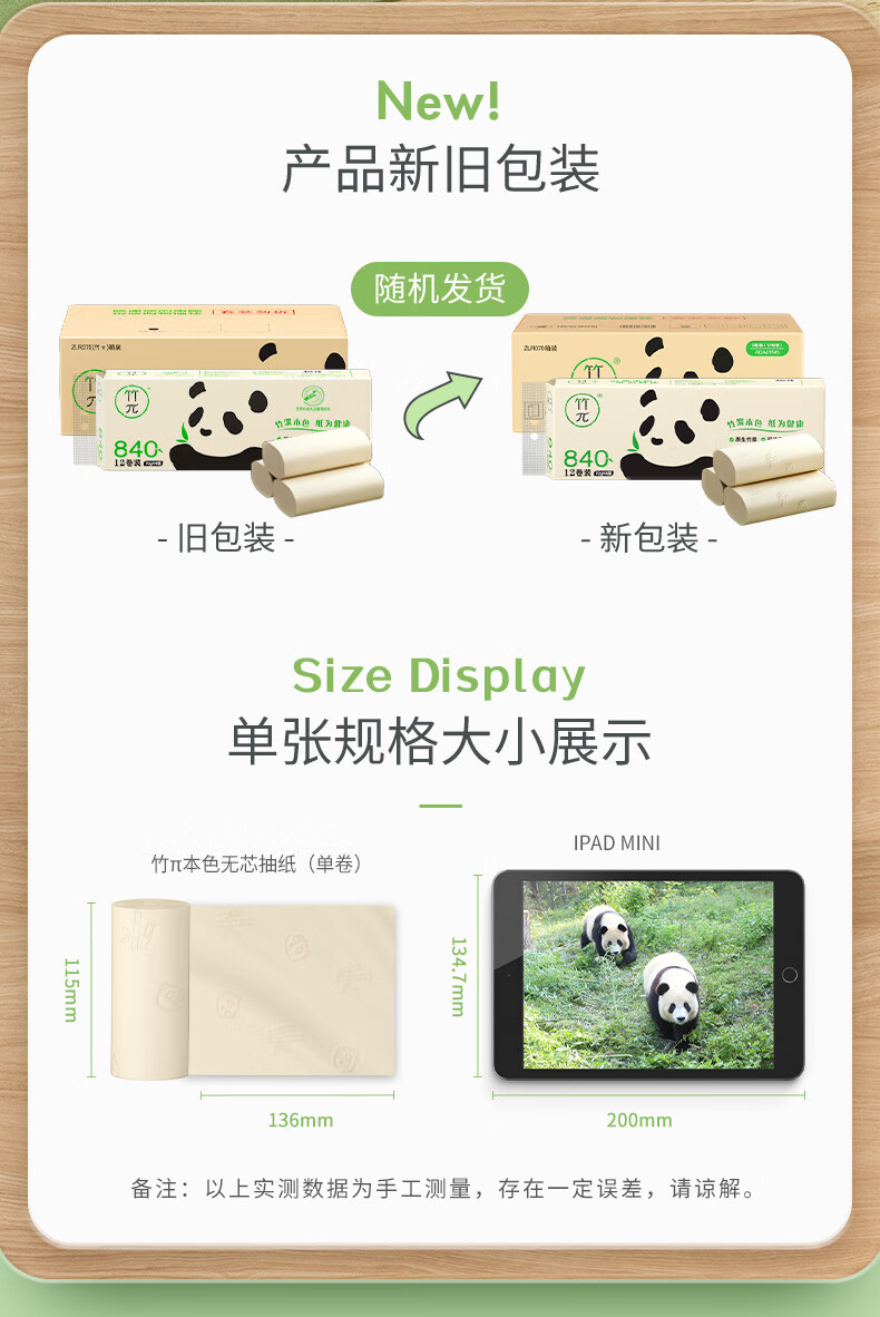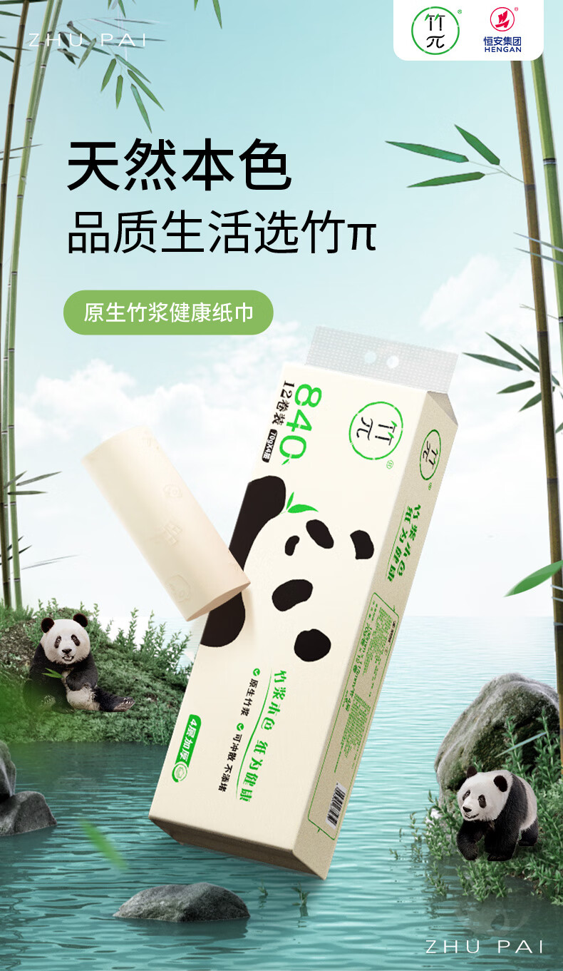 竹π无芯卷纸 竹浆本色纸4层70克12卷*3提 层数升级无漂白纸巾