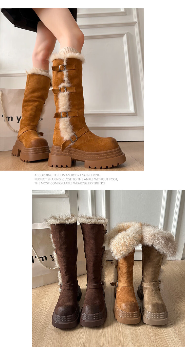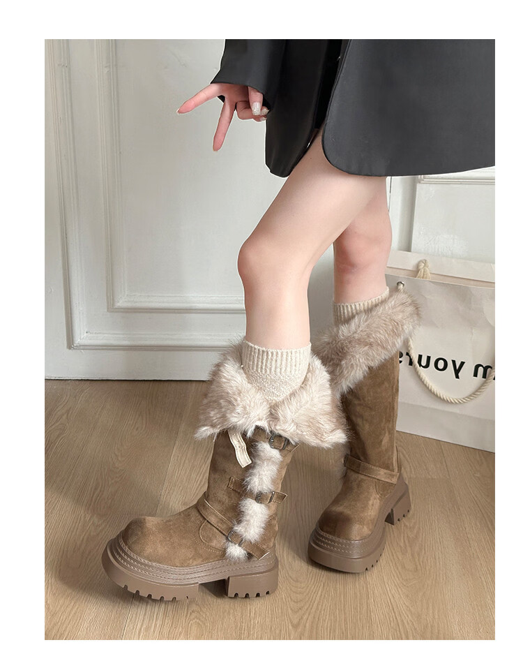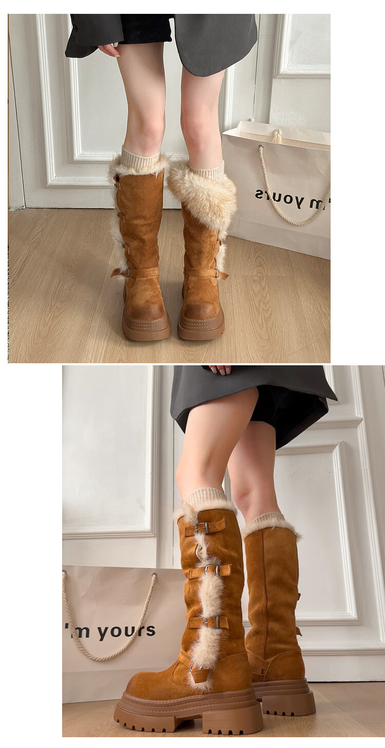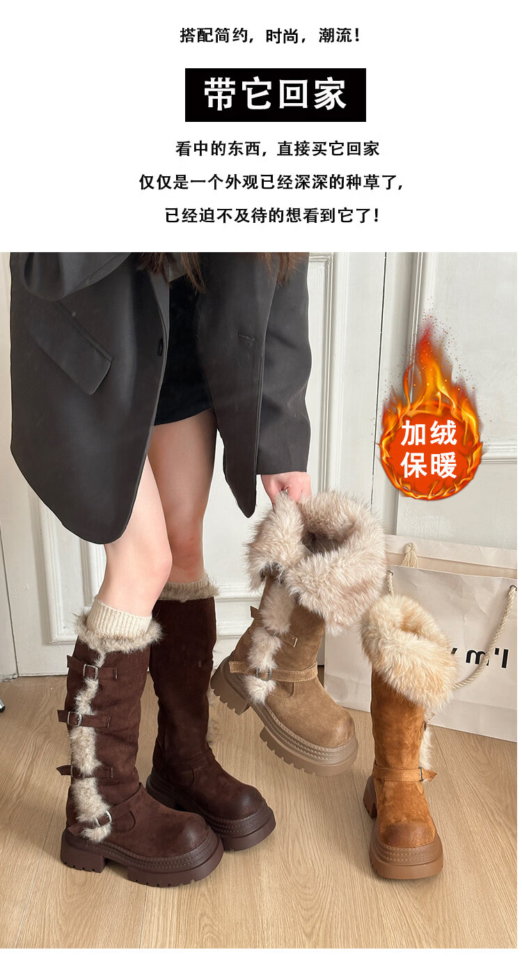 稻草人(MEXICAN)美拉德厚底皮带扣长筒雪地靴女2026年新款冬季加绒保暖粗跟骑士靴 卡其色【精品版】 35