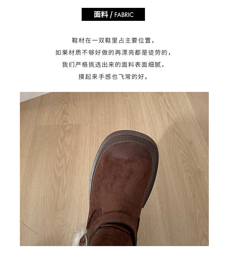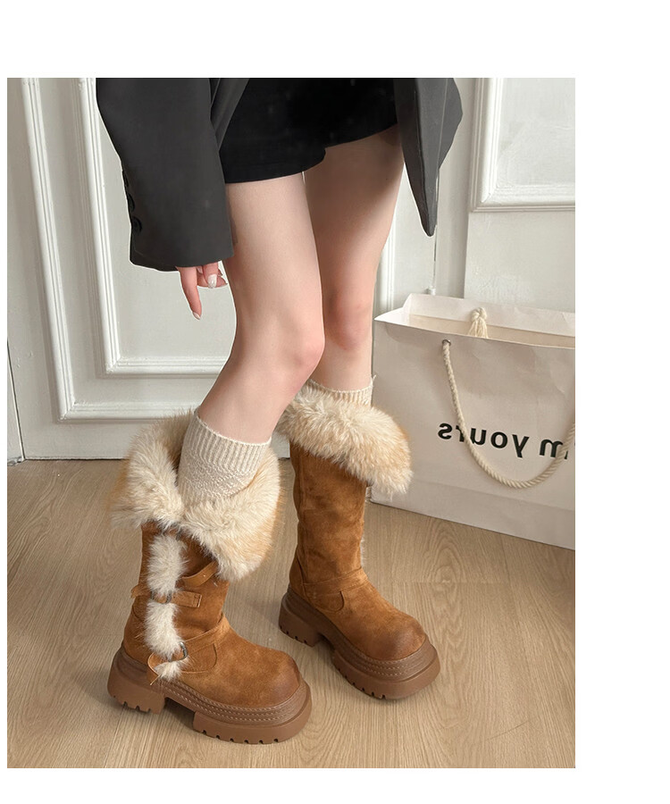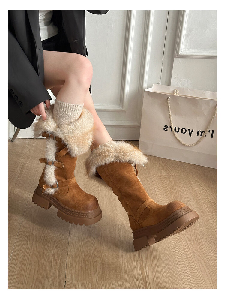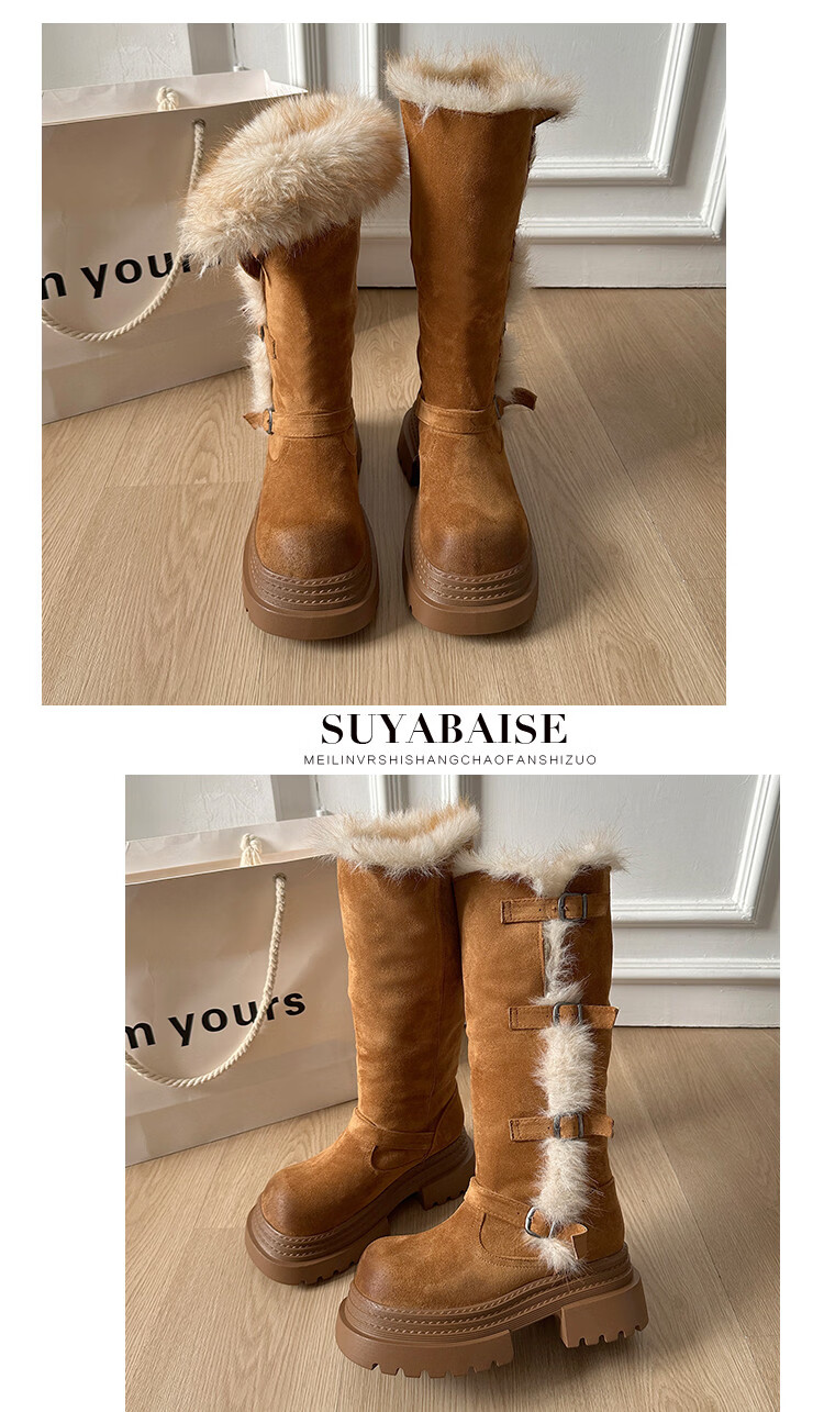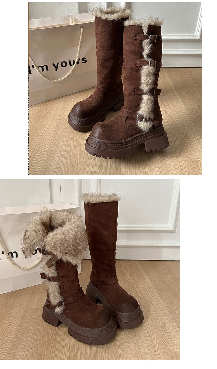 稻草人(MEXICAN)美拉德厚底皮带扣长筒雪地靴女2026年新款冬季加绒保暖粗跟骑士靴 卡其色【精品版】 35