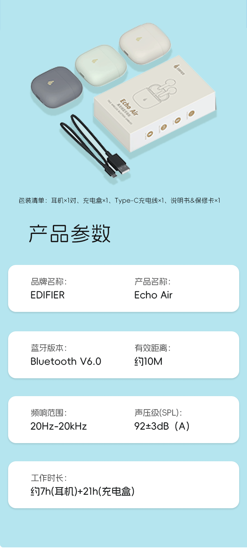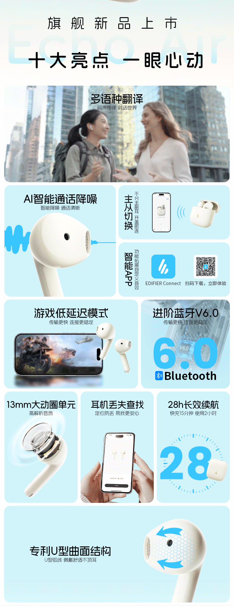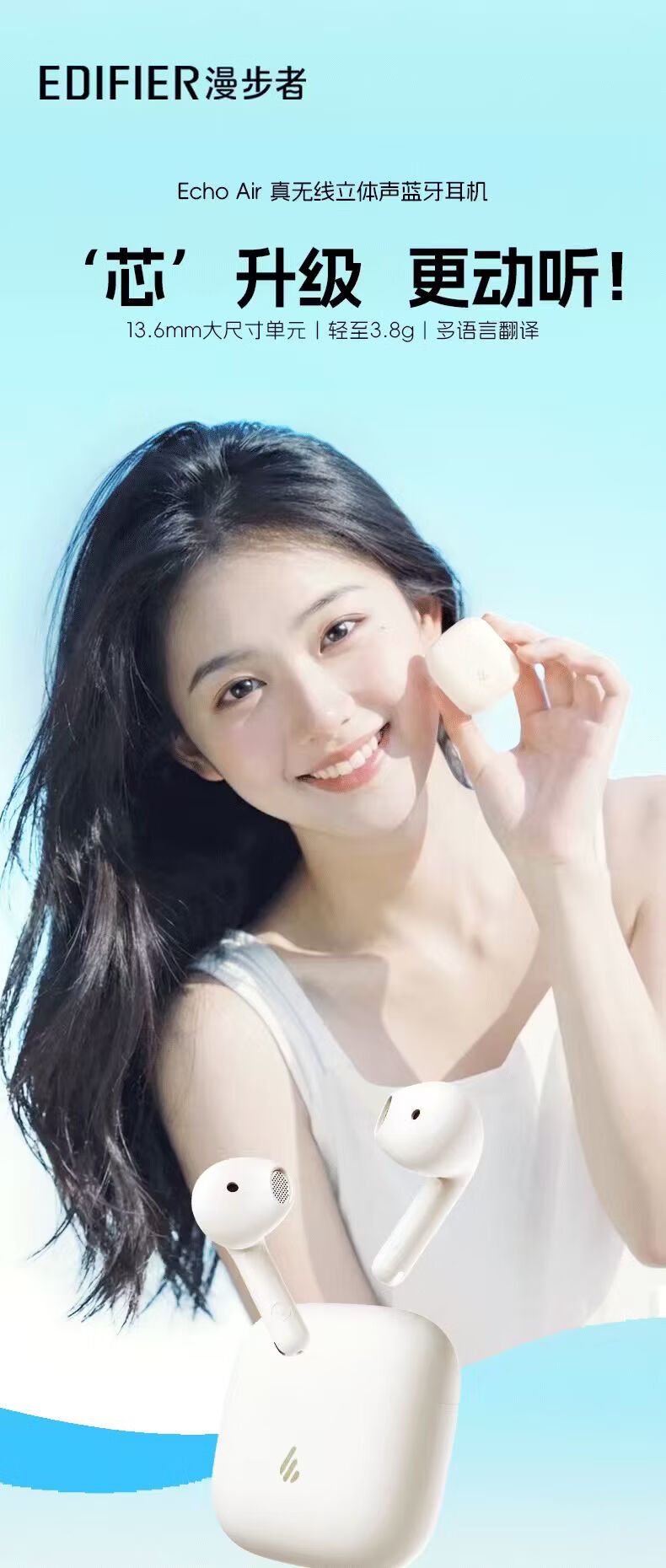 漫步者Echo Air真无线蓝牙6.0耳机半入耳式降噪长久续航久戴不痛同声传译适用华为小米OPPO苹果手机耳机 Echo Air青雾砂【升级蓝牙6.0+晒图有礼】