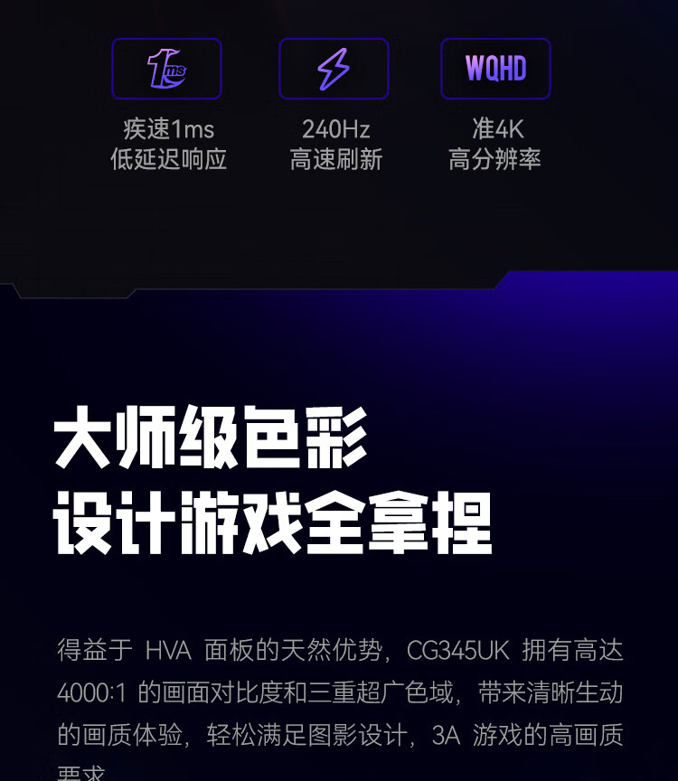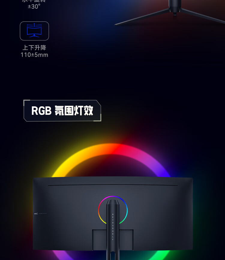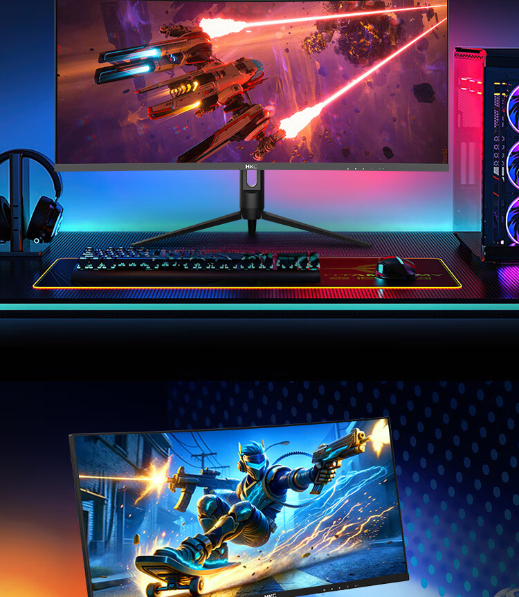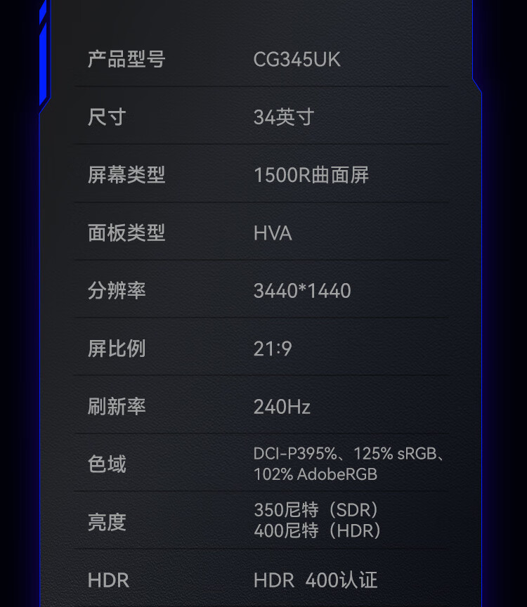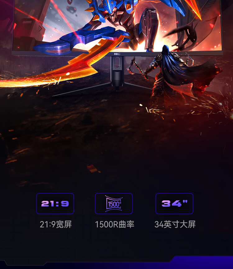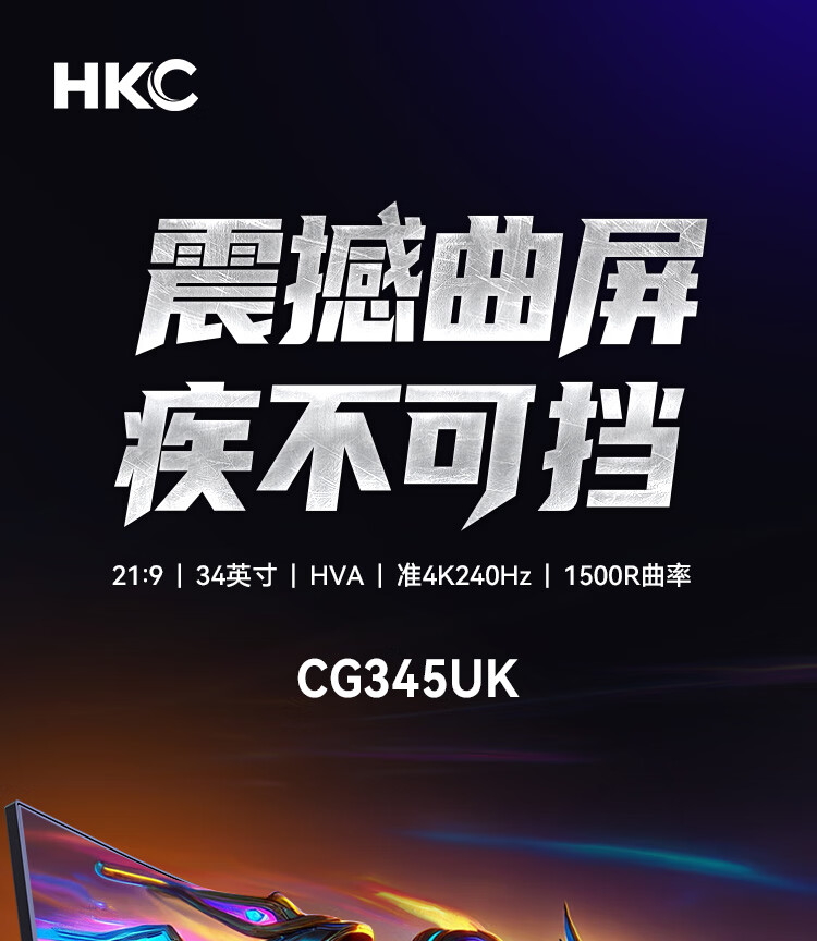 HKC 34英寸21:9带鱼屏WQHD准4K超清240Hz HDR400认证1500R曲面1ms游戏电竞HDMI2.1升降显示器CG345UK