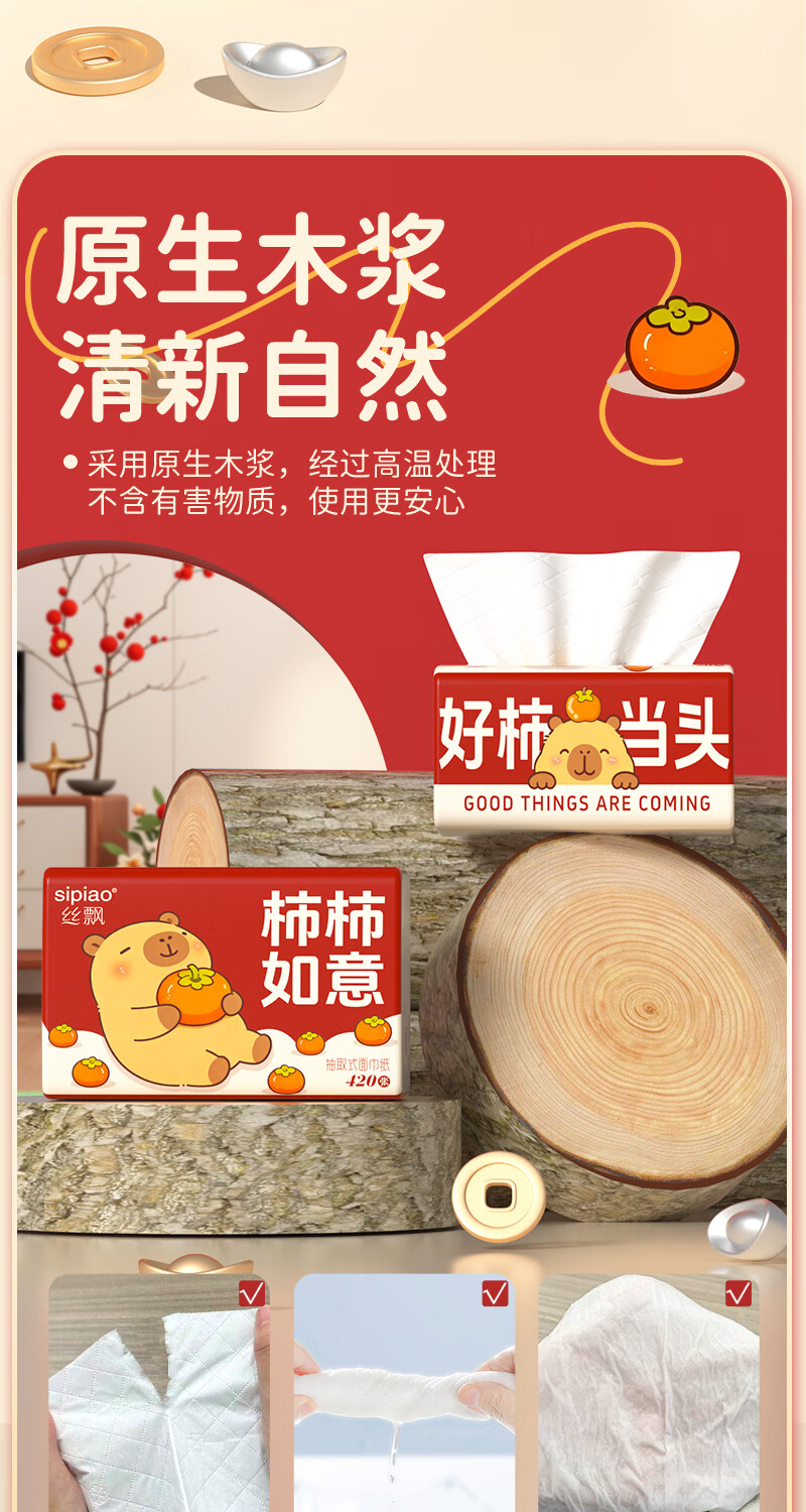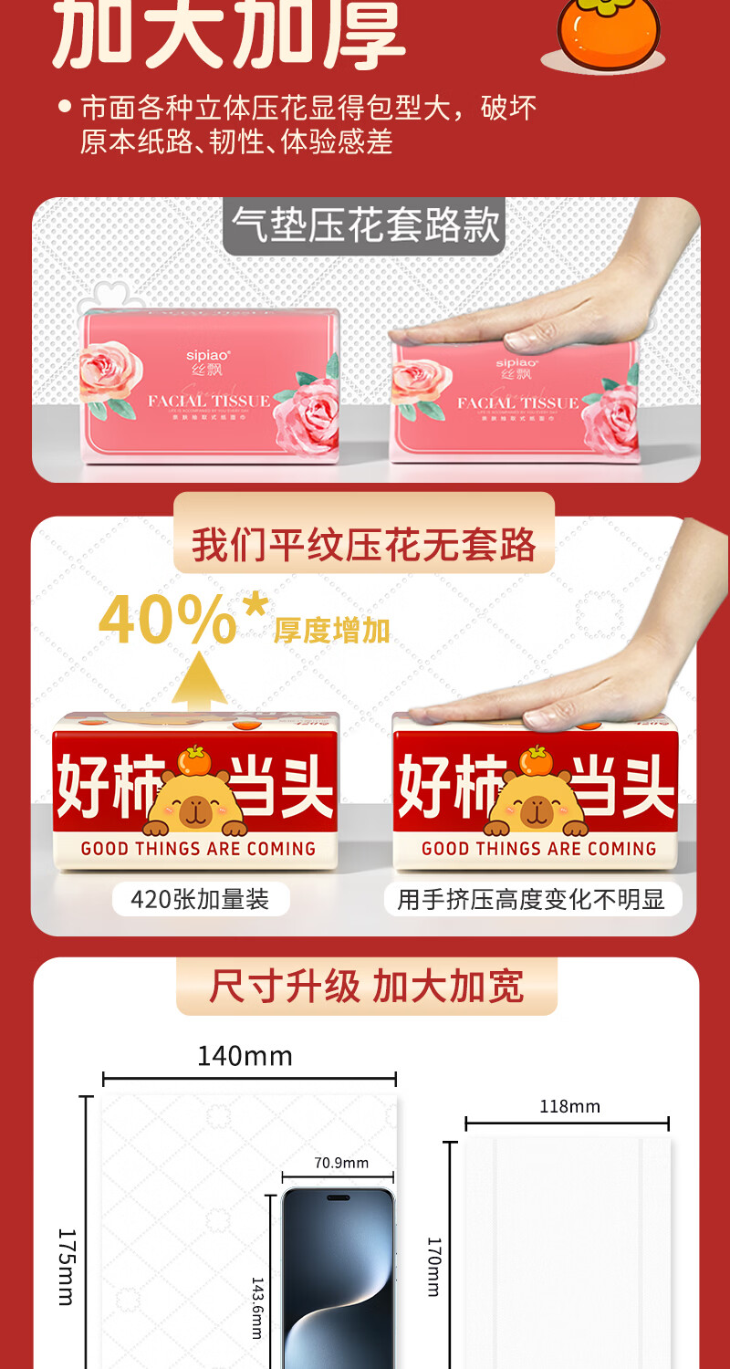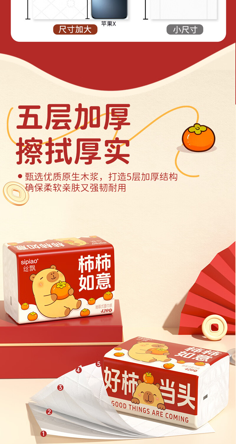 丝飘抽纸餐巾纸家用大包面巾纸卫生纸优等品纸巾家庭用纸整箱批发装 5层 420张*20包【囤货装】
