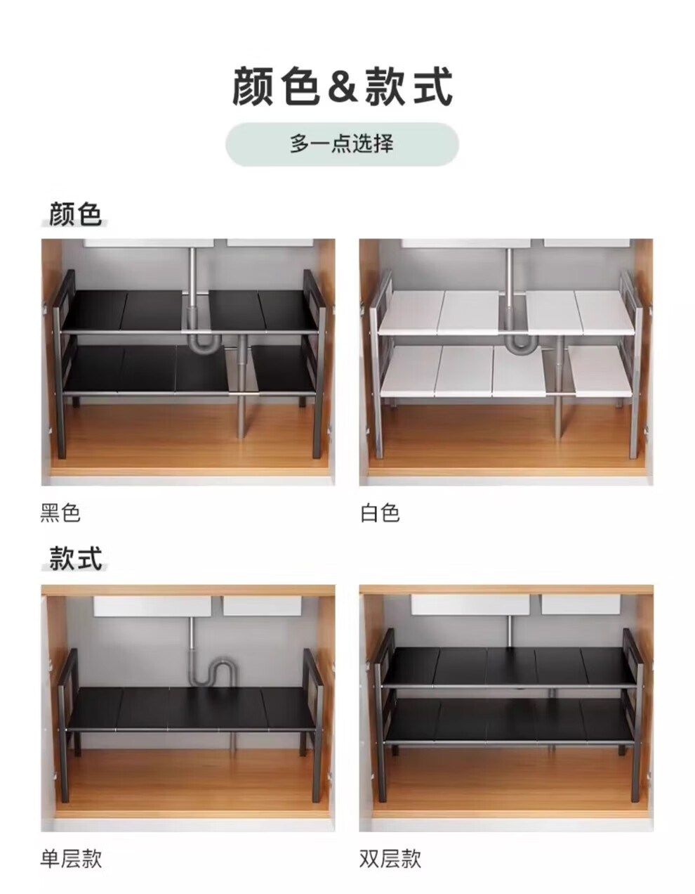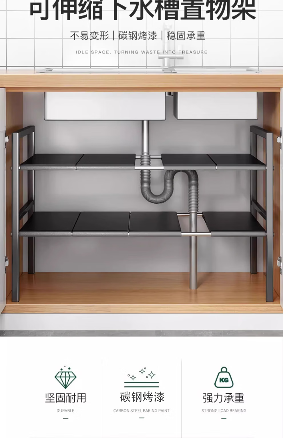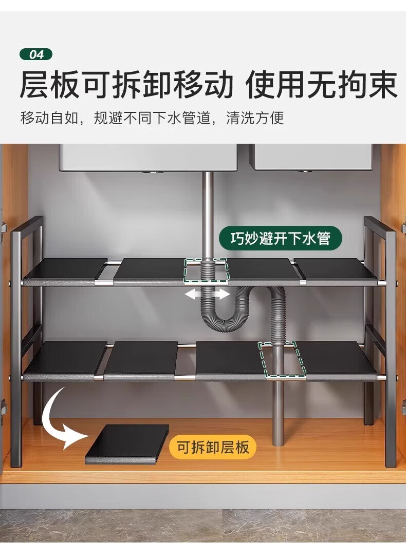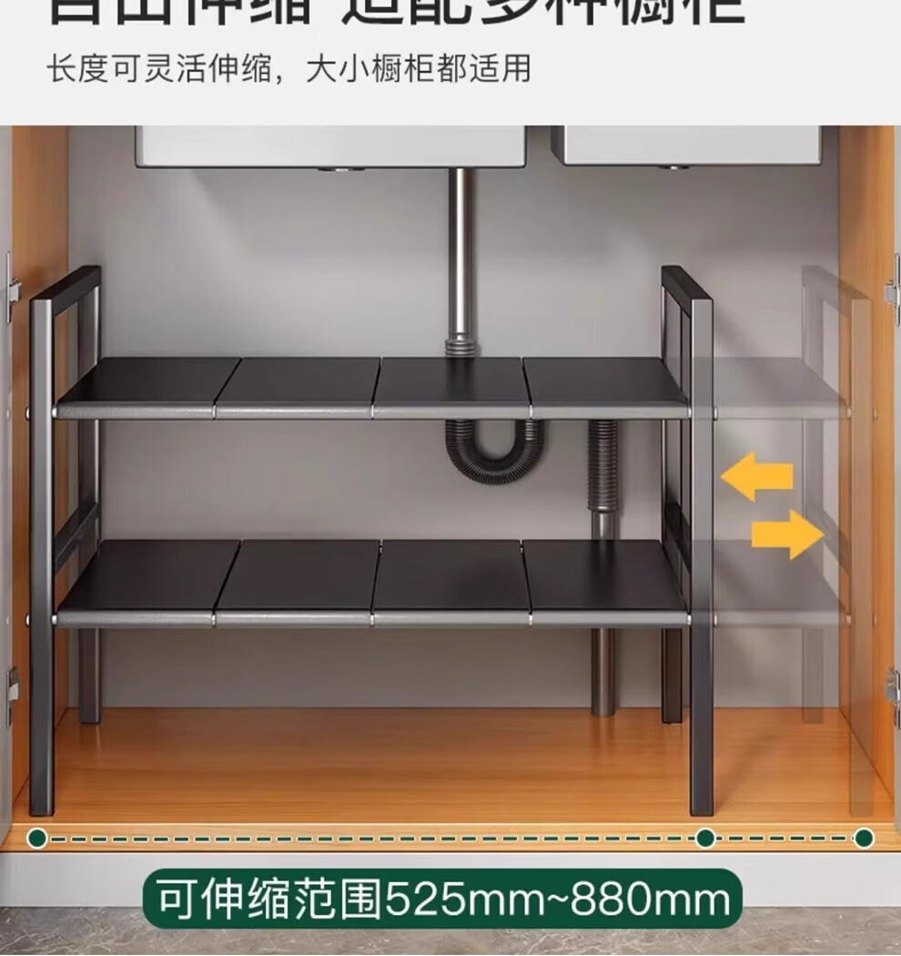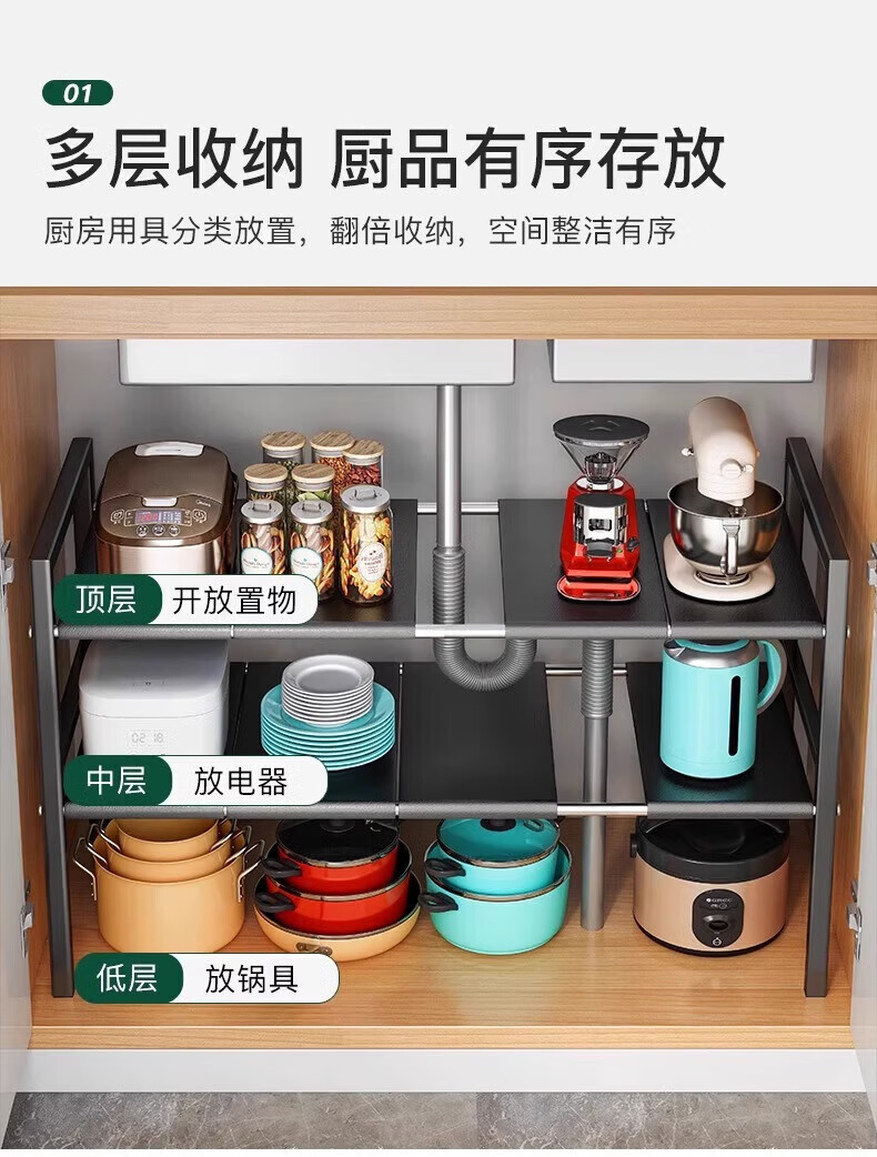 馨婺家厨房可伸缩下水槽置物架整理水池下收纳架子橱柜多功能锅架储物架 黑色-单层可伸缩【3板无网】加粗加厚