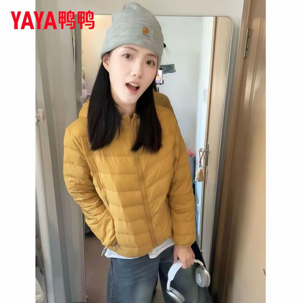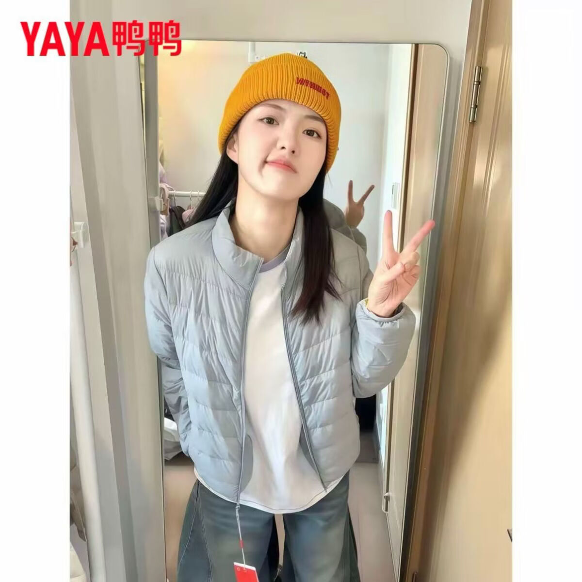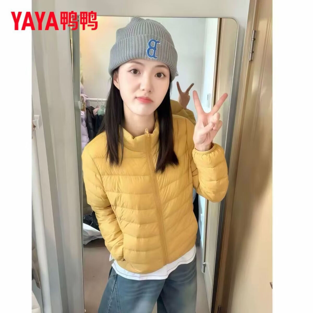 鸭鸭(YAYA)轻薄排骨羽绒服女短款秋冬新款保暖百搭时尚纯色立领外套 黄色(立领) S 80-90斤
