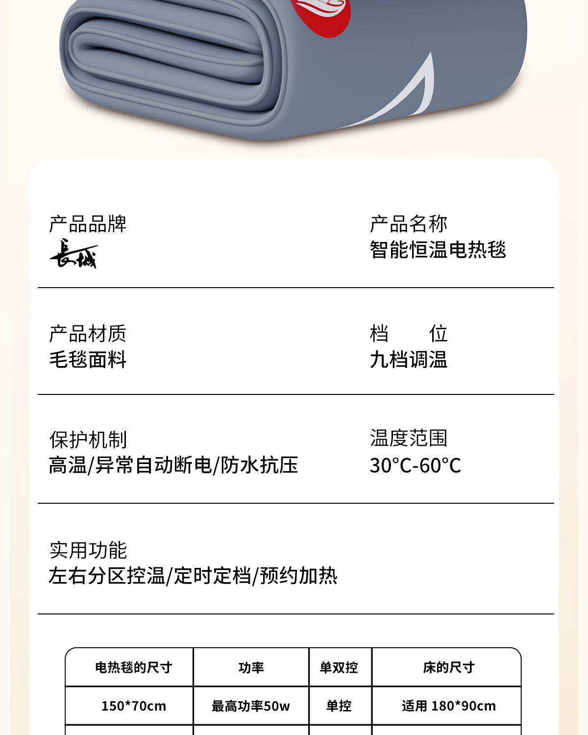 长城石墨烯电热毯双控智能调温除螨加热毯自动断电暖床学生宿舍单人 加厚豪华德绒款180*90cm【一键除螨】