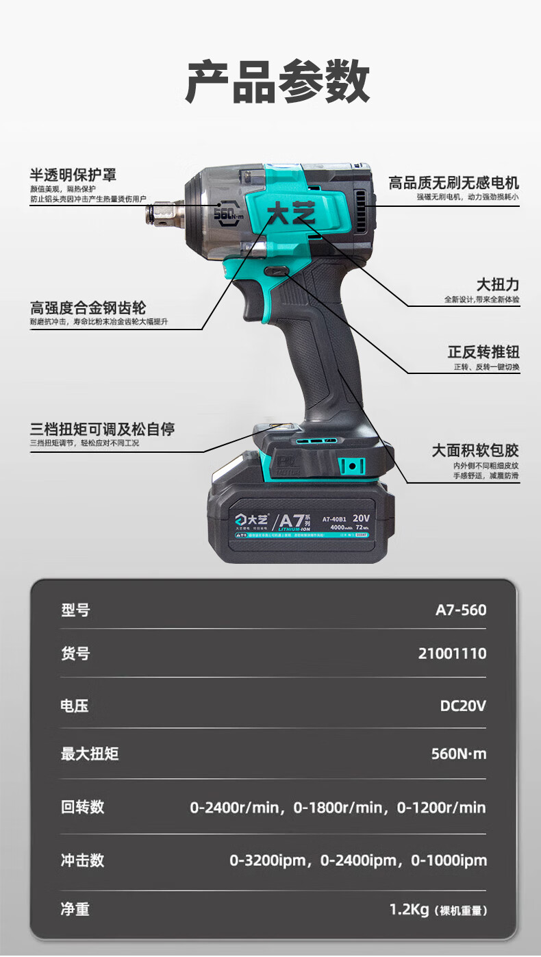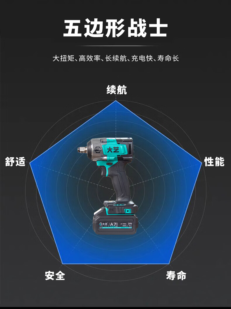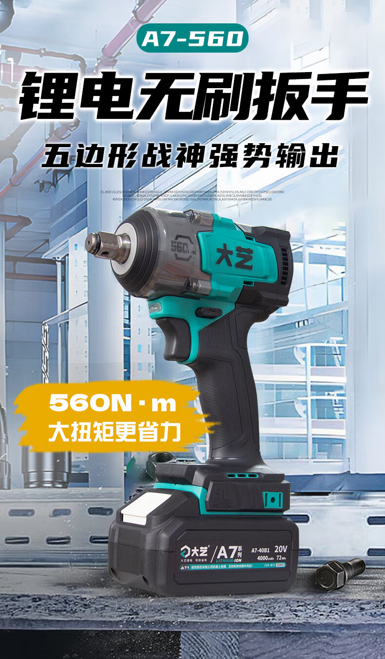 大艺560N电扳手无刷大扭力20V冲击汽修专用锂电池电动风炮A7-560 A7-560裸机【不含电池充电器】