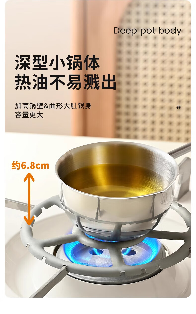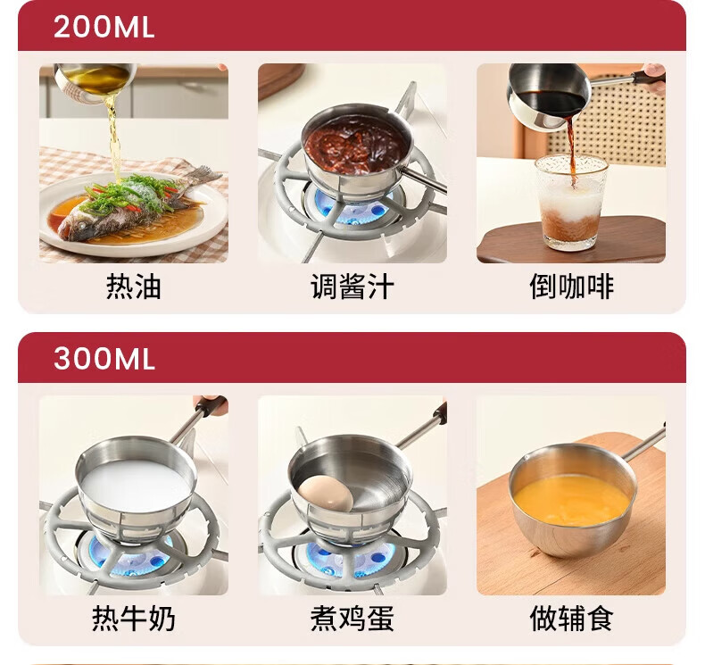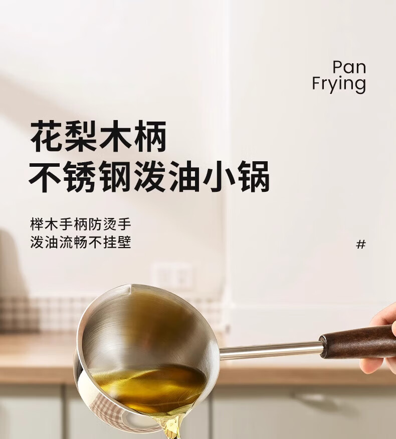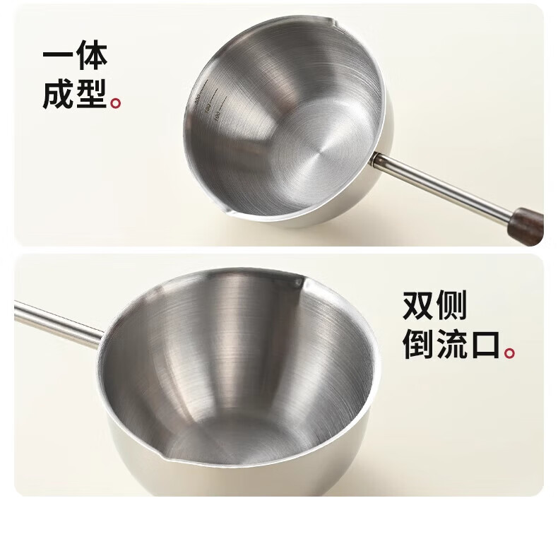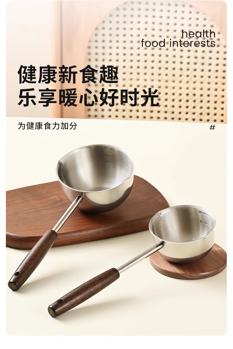 热油小锅泼油锅加厚不锈钢木柄防烫带刻度双倒流口不挂油无涂层 【木柄】爆款300ml
