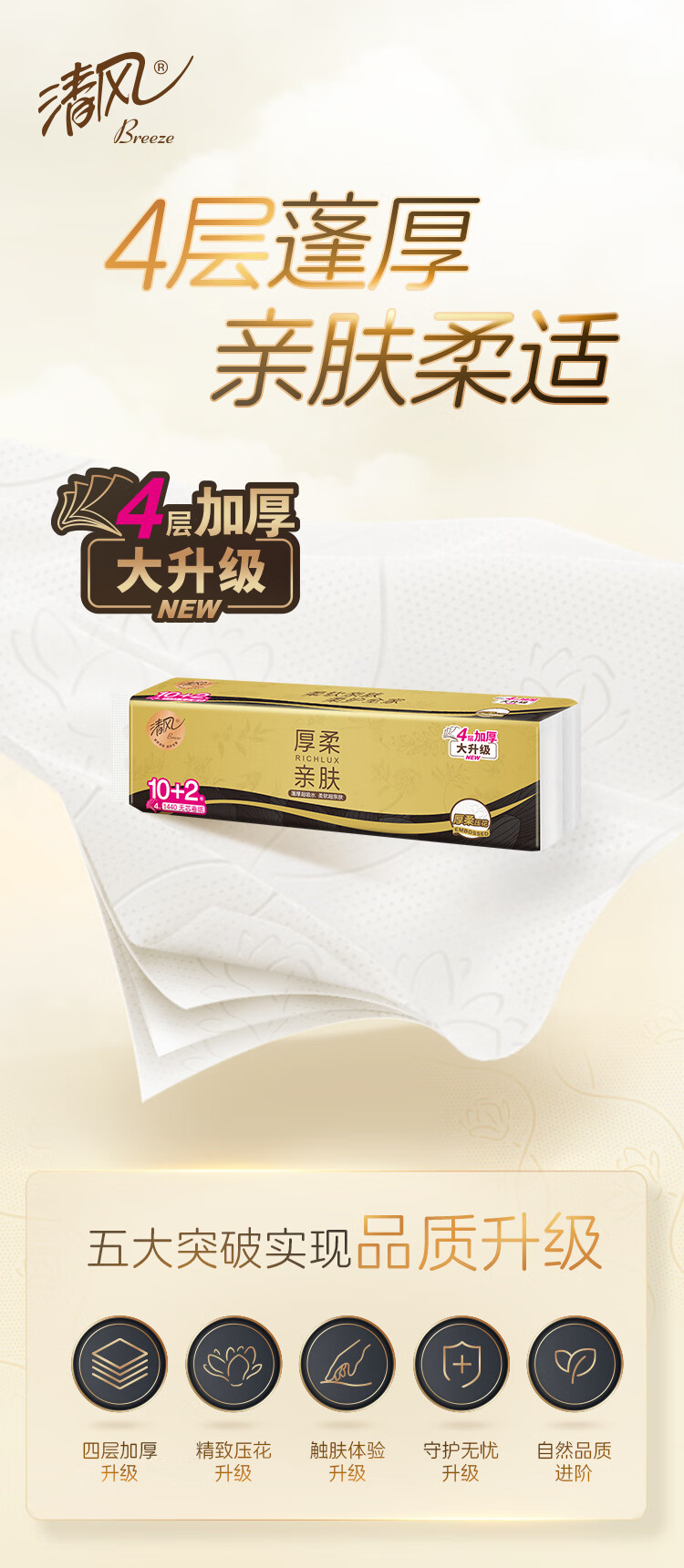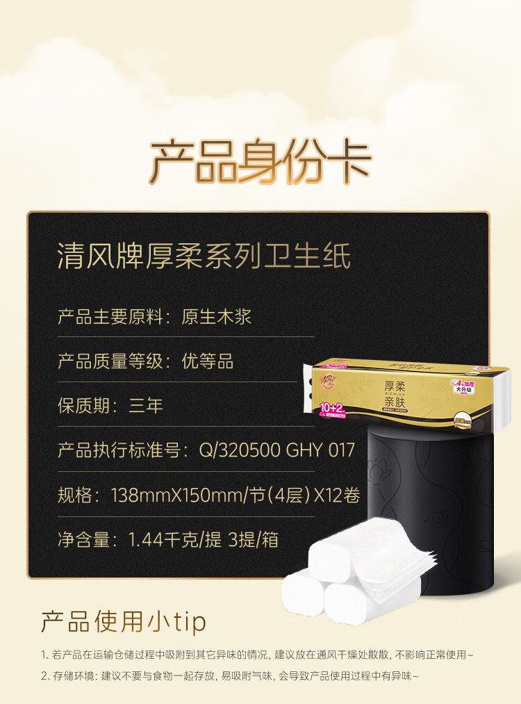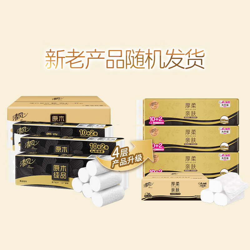 清风【李昀锐同款】无芯卷纸 黑金厚韧4层加厚120克*36卷 卫生纸整箱