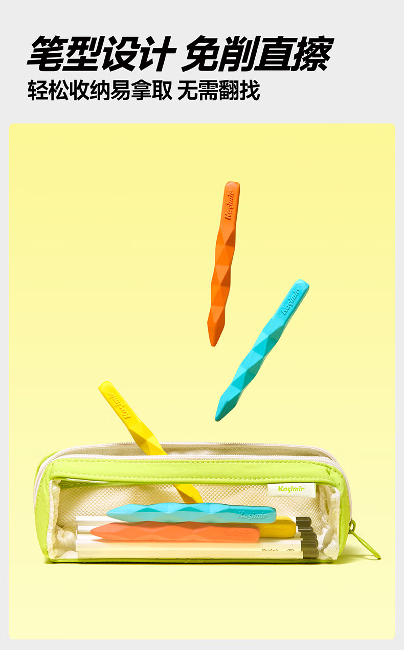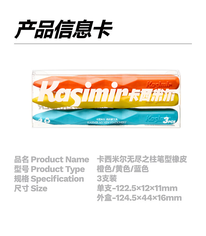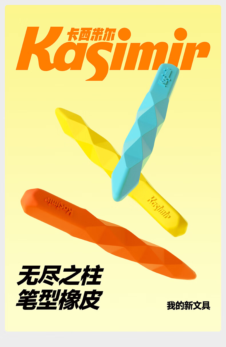 卡西米尔无尽之柱笔型橡皮-橙黄蓝-3支装干净不掉渣小学生专用简约美术不易留痕考试橡皮擦彩色橡皮