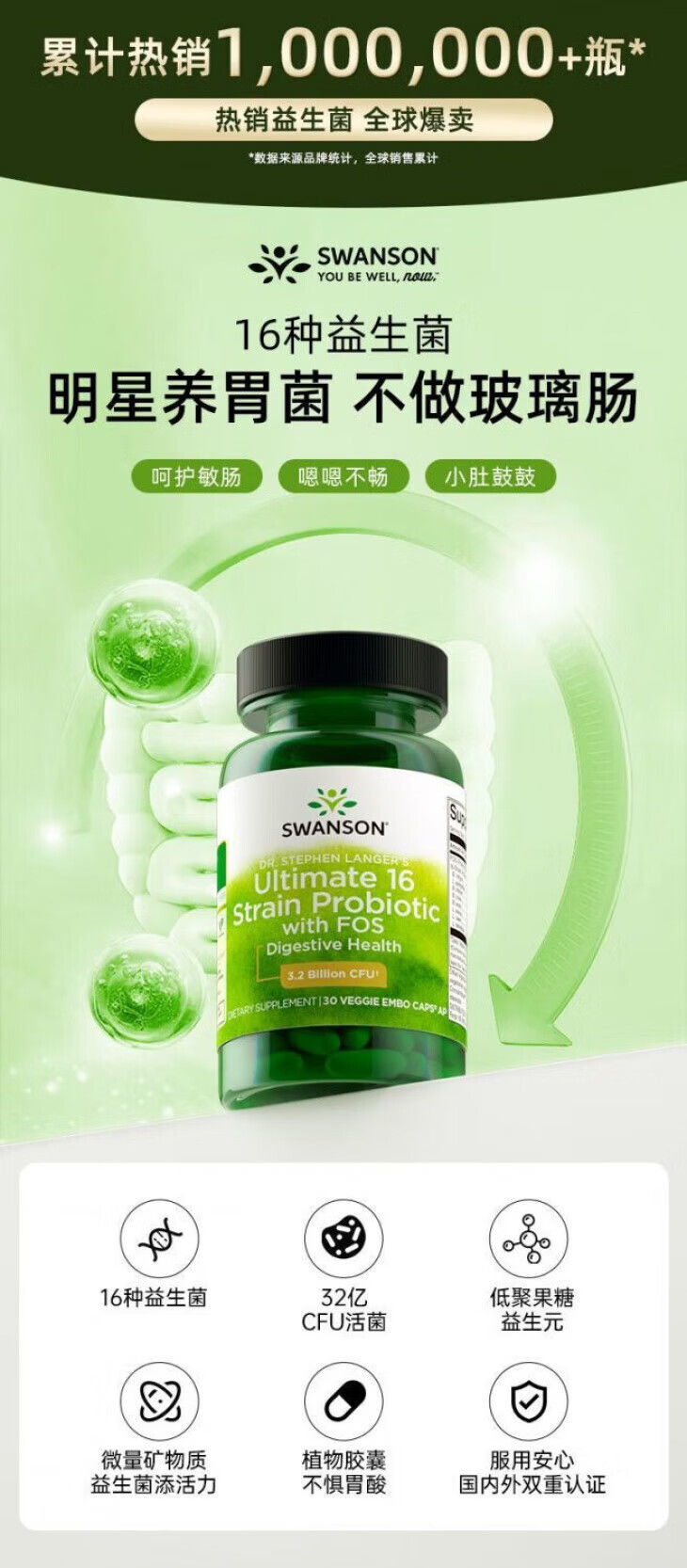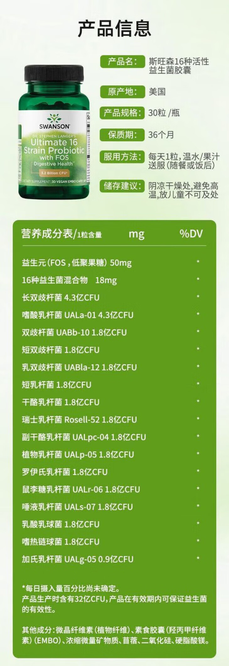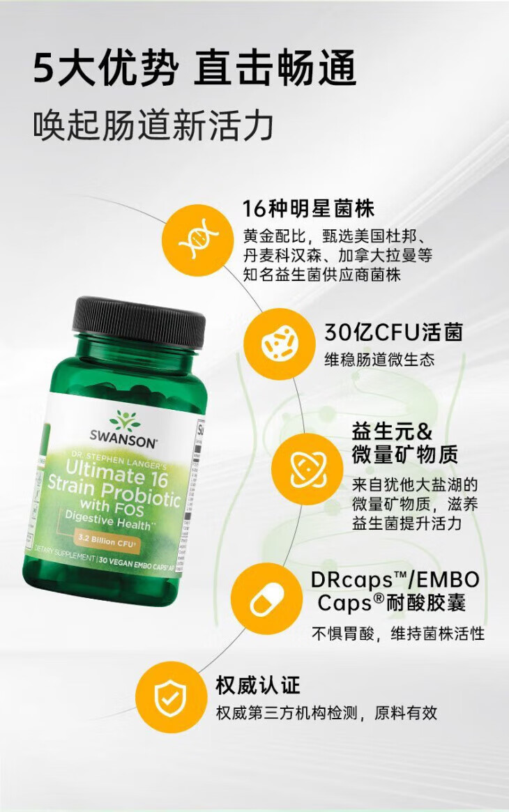 斯旺森(SWANSON)16种益生菌胶囊 30亿CFU活菌 70+矿物质改善成人肠胃调理肠道健康 【专利耐酸胶囊 活菌到肠才有效】 30粒*1瓶