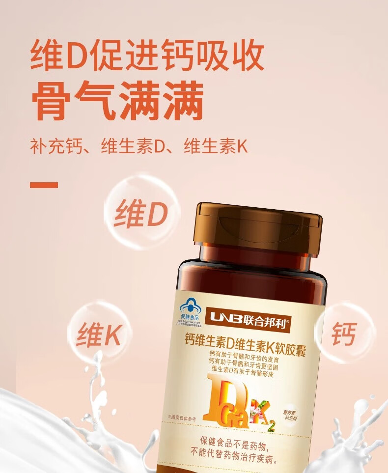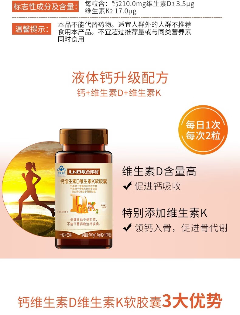 联合邦利钙维生素D维生素K软胶囊100粒/瓶助于骨骼和牙齿发育补充维生素D 100粒*1瓶 【药店直发】