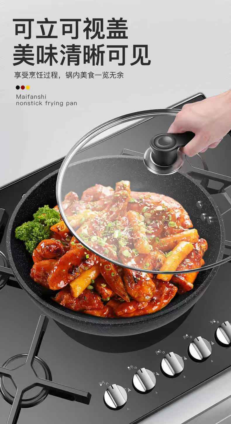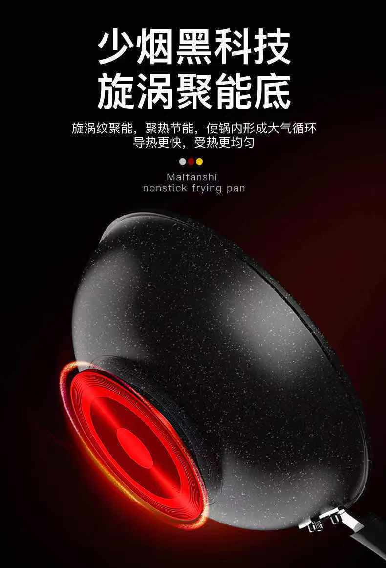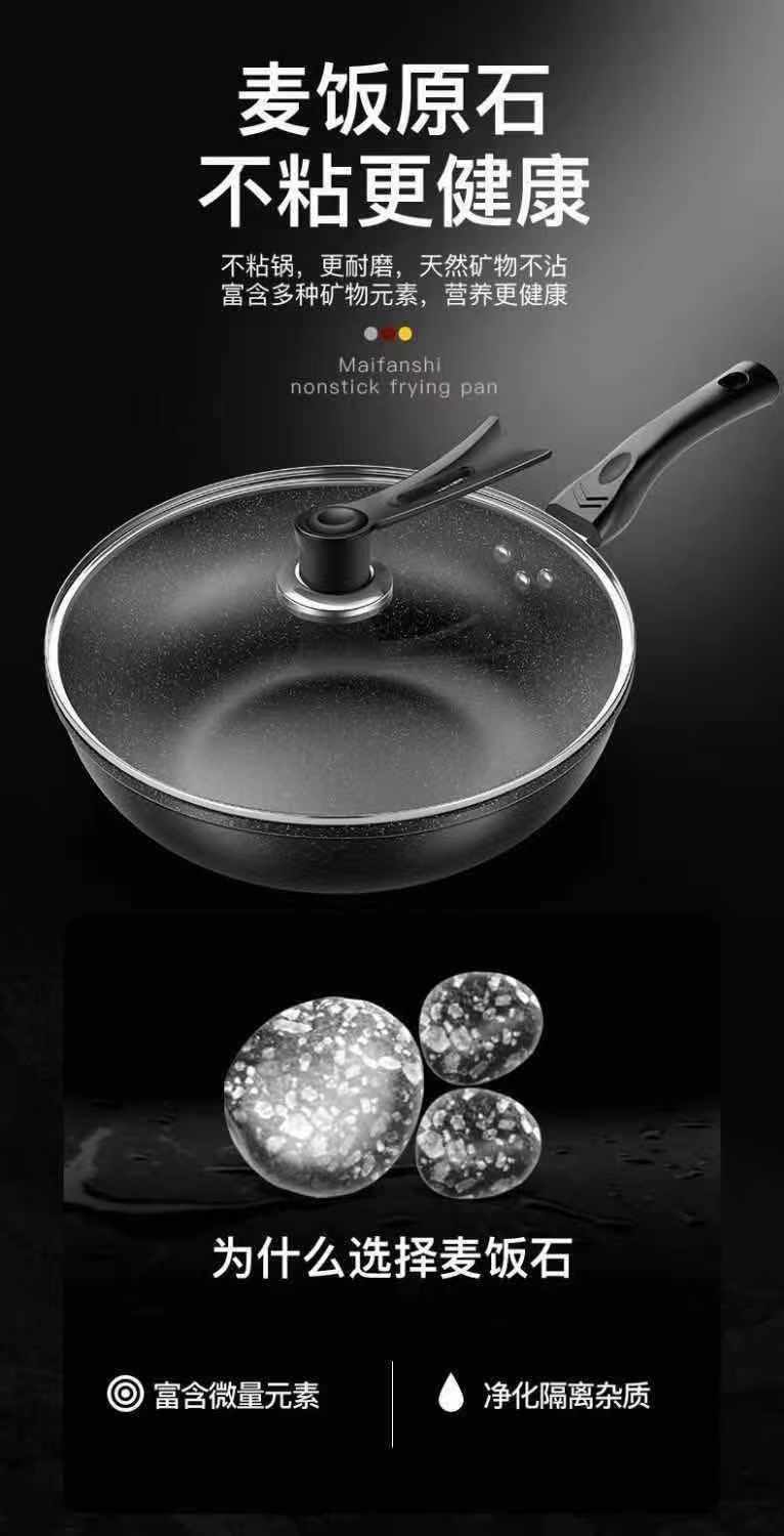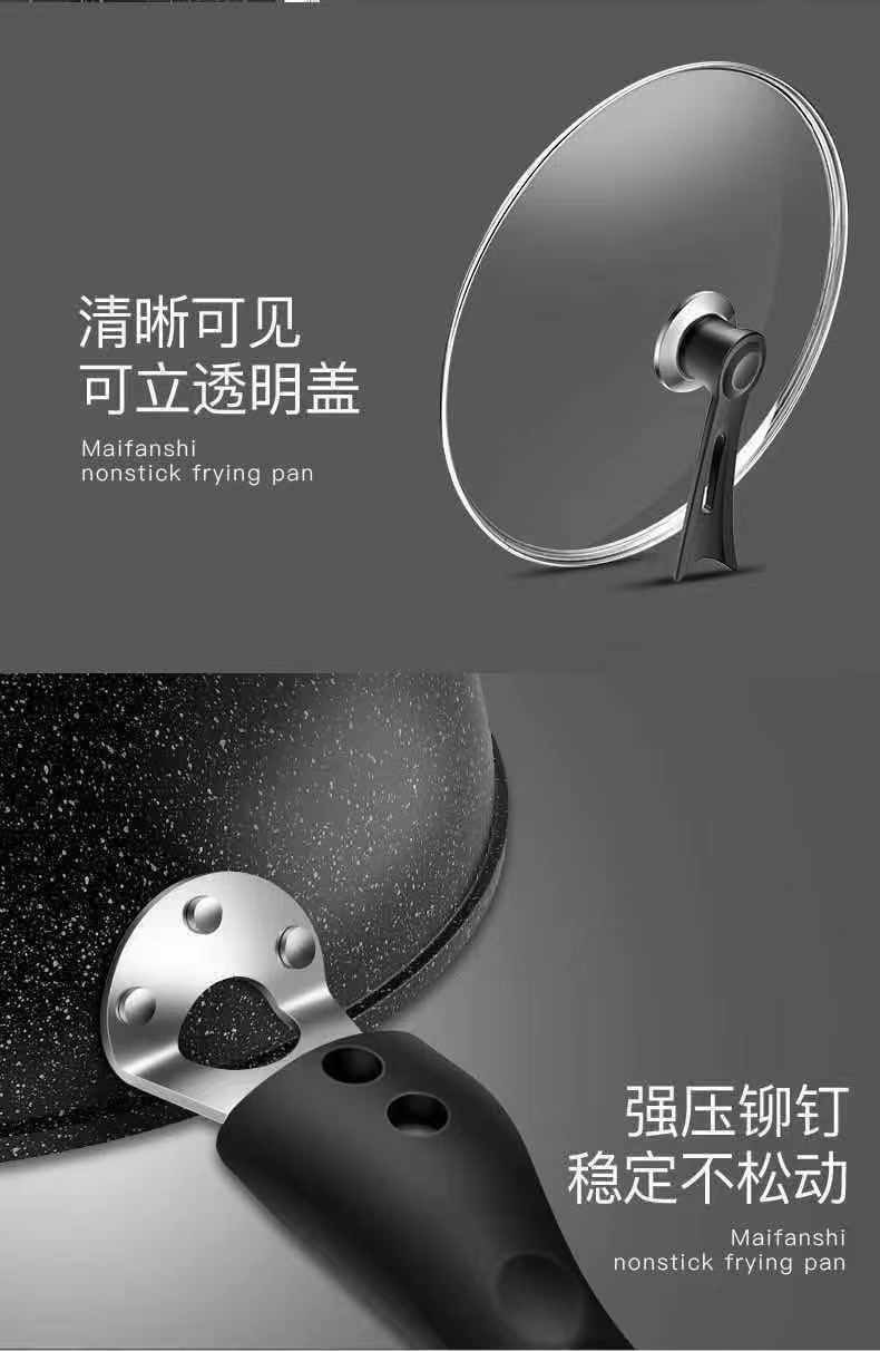 萌依儿麦饭石不粘锅炒菜锅家用平底铁锅无油烟炒菜锅具电磁炉燃气通用的 加厚+盖+洁布 34cm