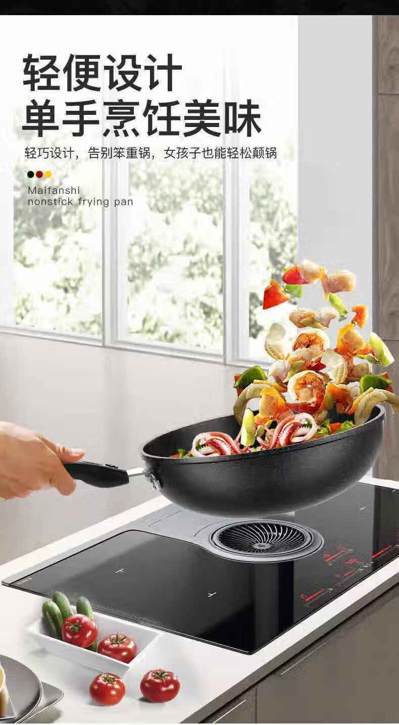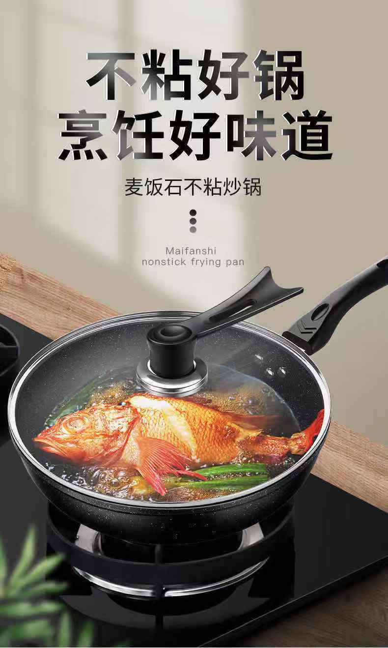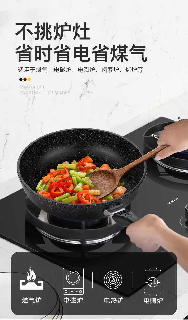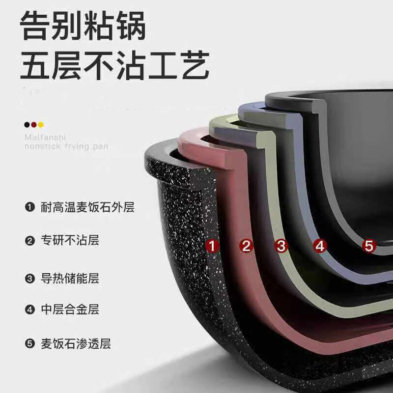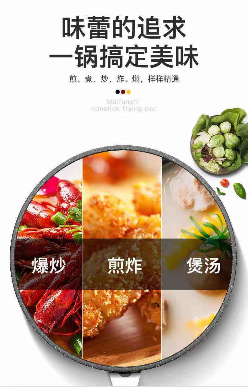 萌依儿麦饭石不粘锅炒菜锅家用平底铁锅无油烟炒菜锅具电磁炉燃气通用的 加厚+盖+洁布 34cm