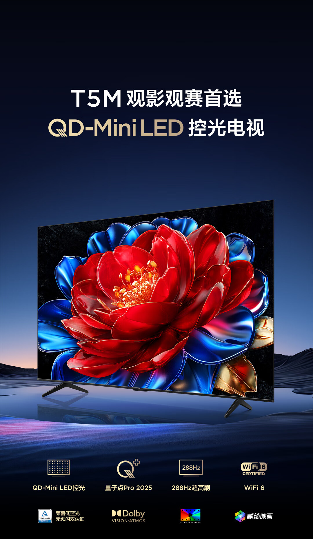 TCL电视 85T5M 85英寸 QD-Mini LED控光 288Hz高刷 QLED量子点 WiFi6 超薄 国家补贴