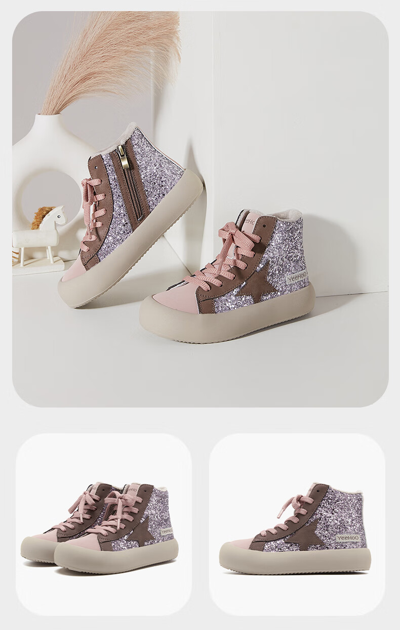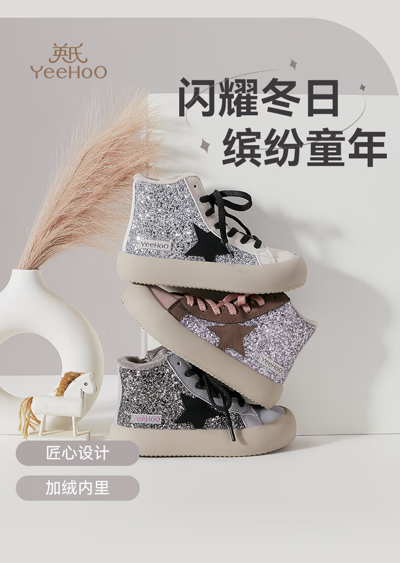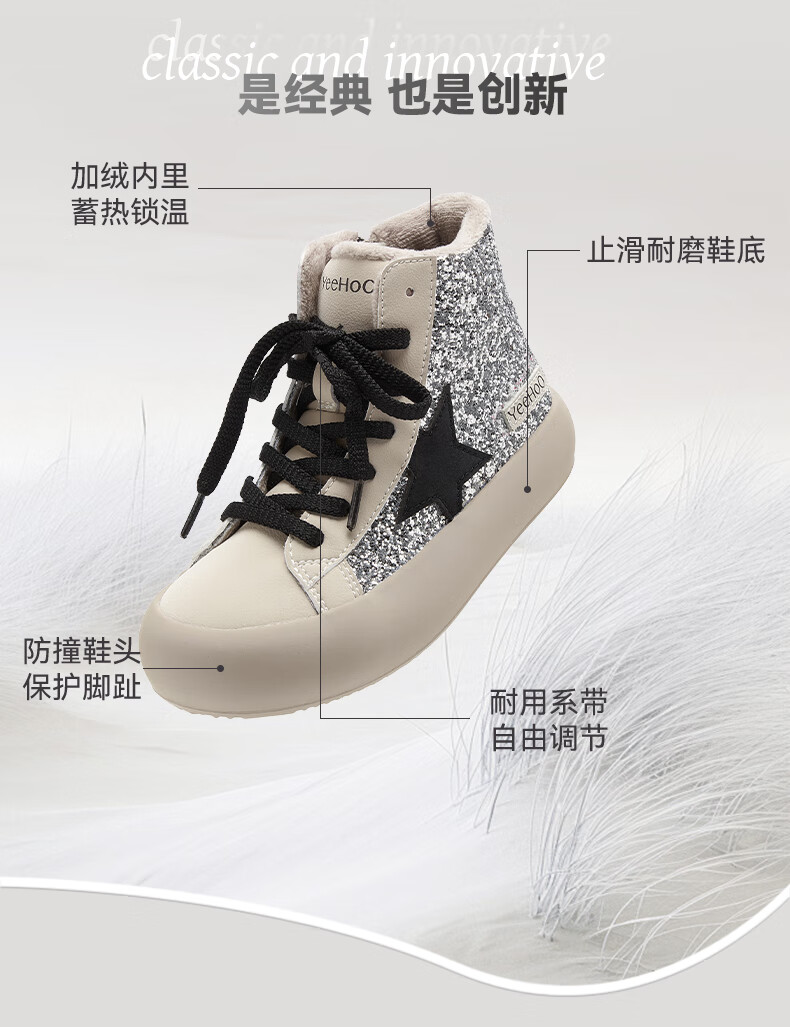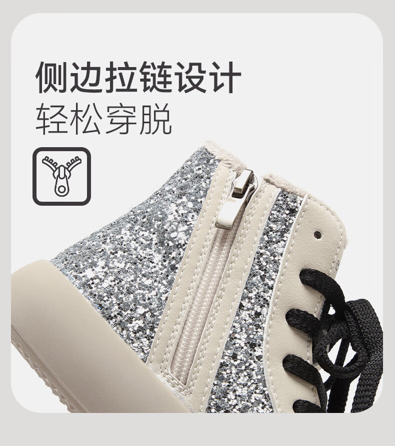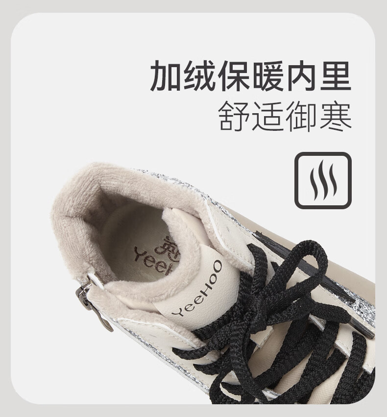 英氏(YEEHOO)童鞋儿童秋冬季轻便加绒保暖软底帆布鞋中大童运动鞋子板鞋男女童 银色 33