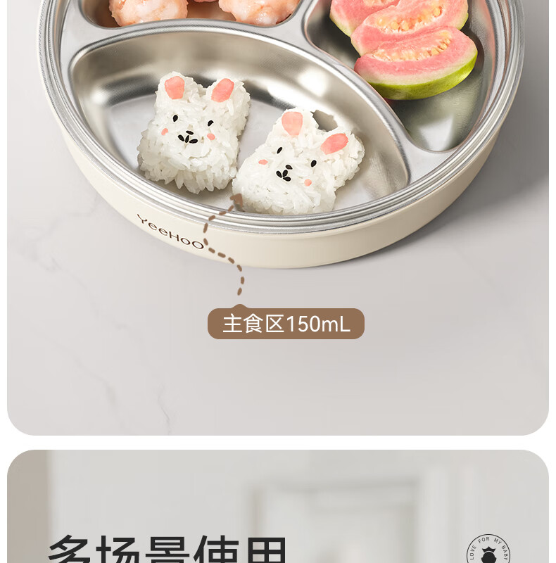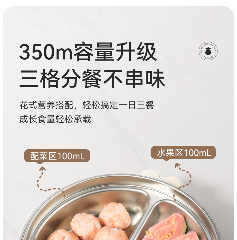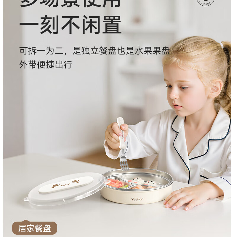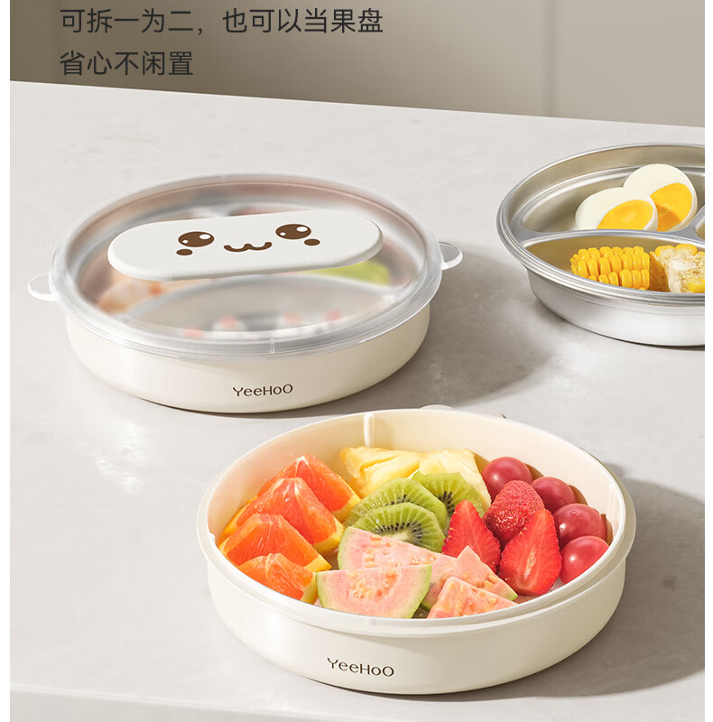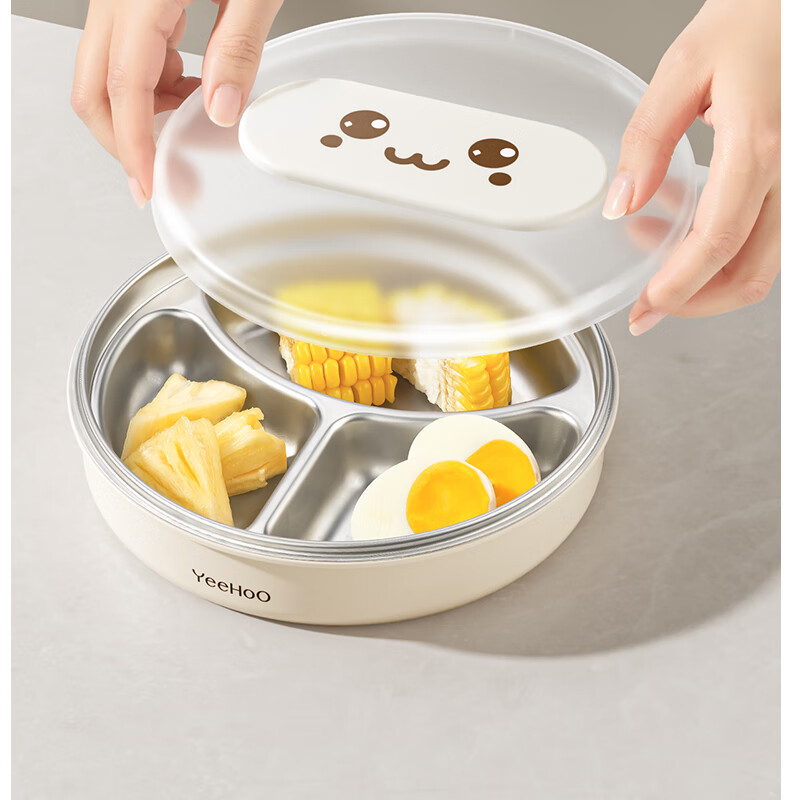 英氏(YEEHOO)宝宝餐盘婴儿分格餐盘自主进食餐盘宝宝辅食碗不锈钢儿童餐具 萌萌 | 不锈钢餐盘【升级大容量+食品级防尘盖】