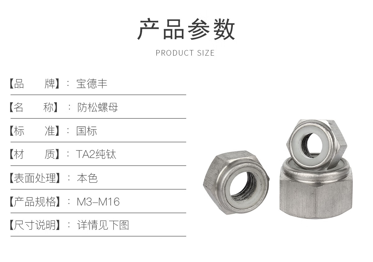 宝德丰TA2纯钛尼龙防松锁紧螺母防滑六角螺帽自锁尼龙螺丝帽M3M4M5M6M8 M3(1只)