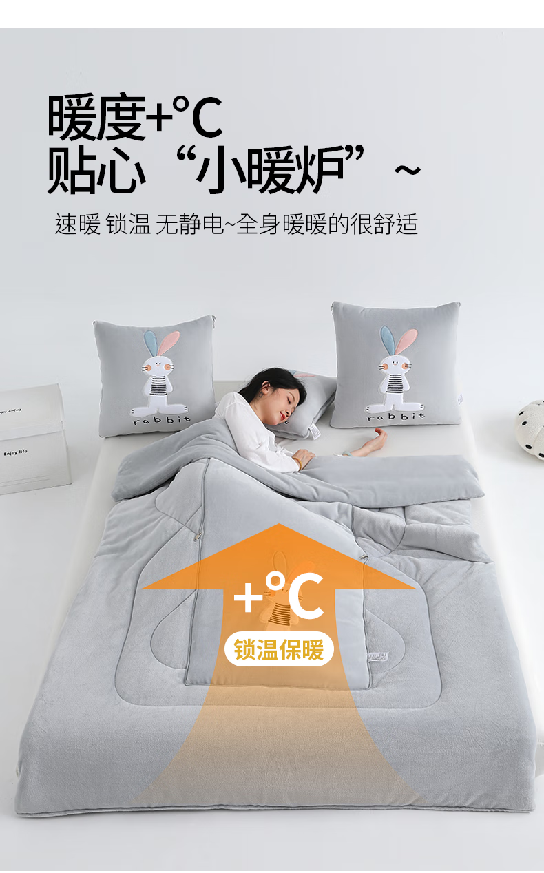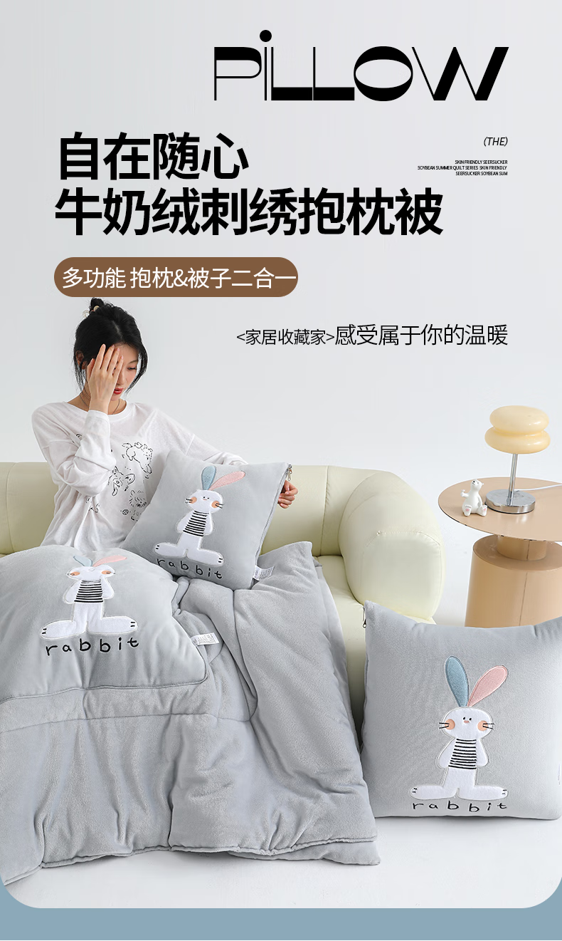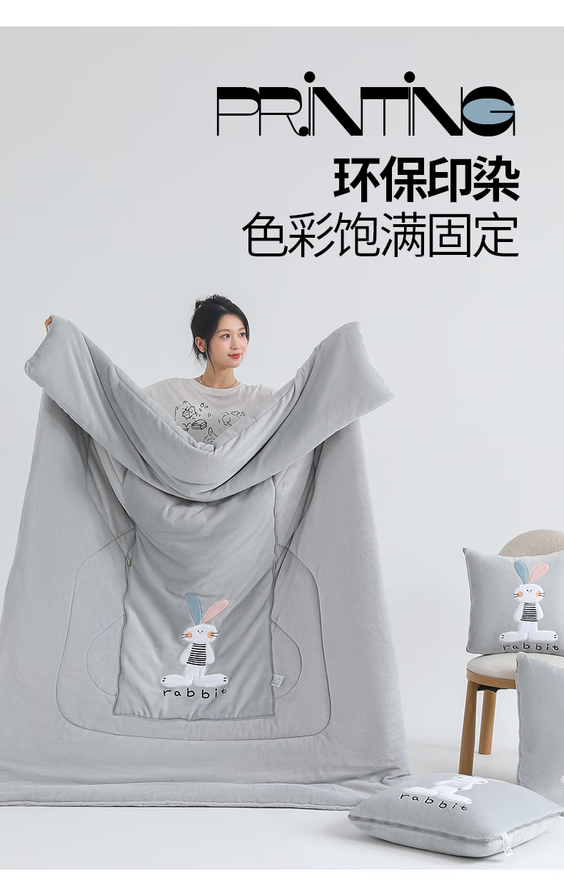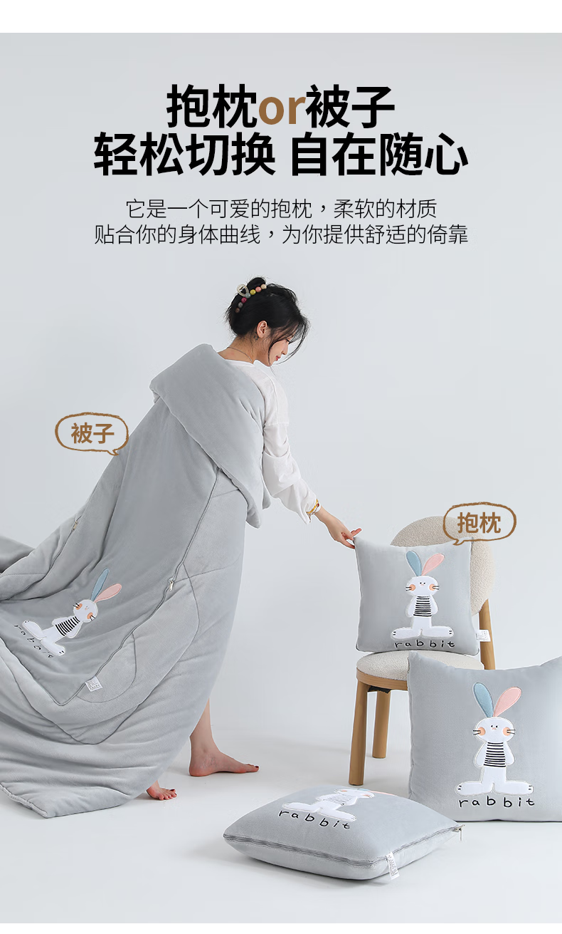 恒源祥卡通牛奶绒抱枕被梦幻兔办公室午睡毯枕头被子二合一小毯子午睡 梦幻兔-高级灰 40cm*40cm 展开105*155cm