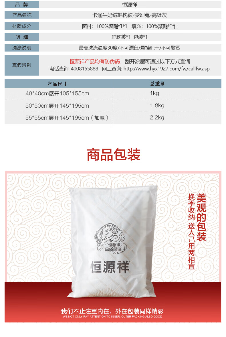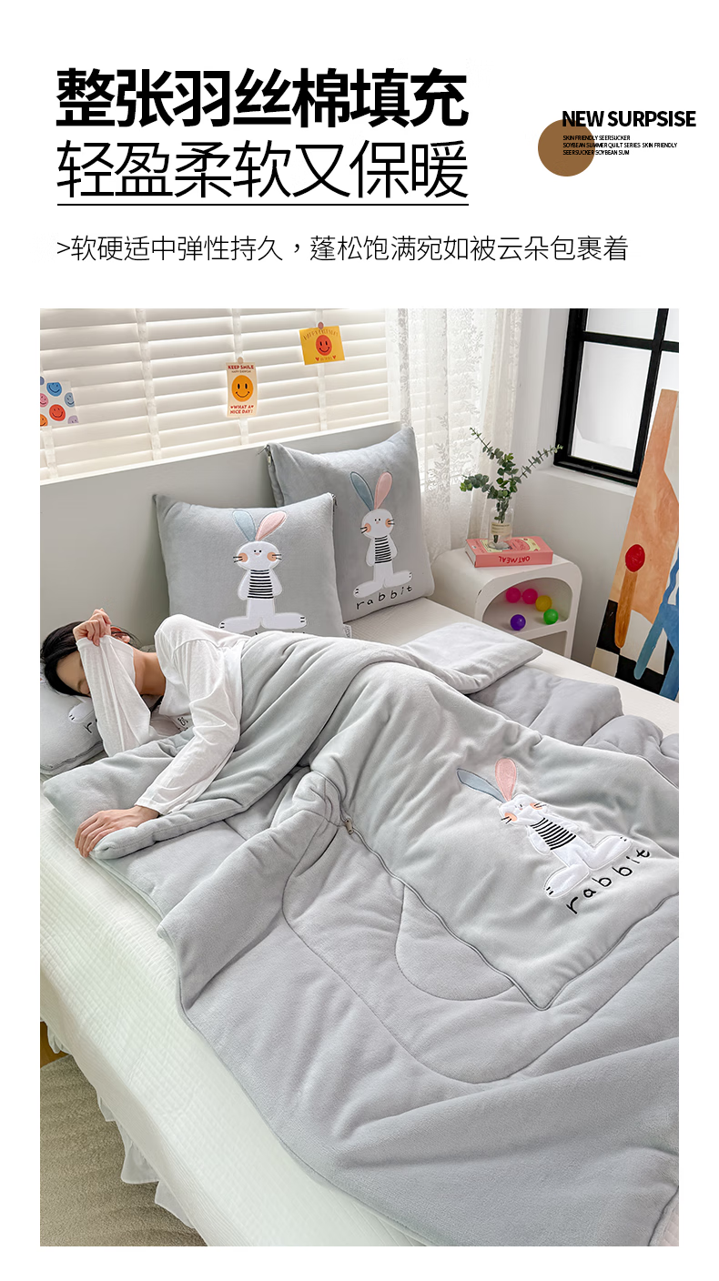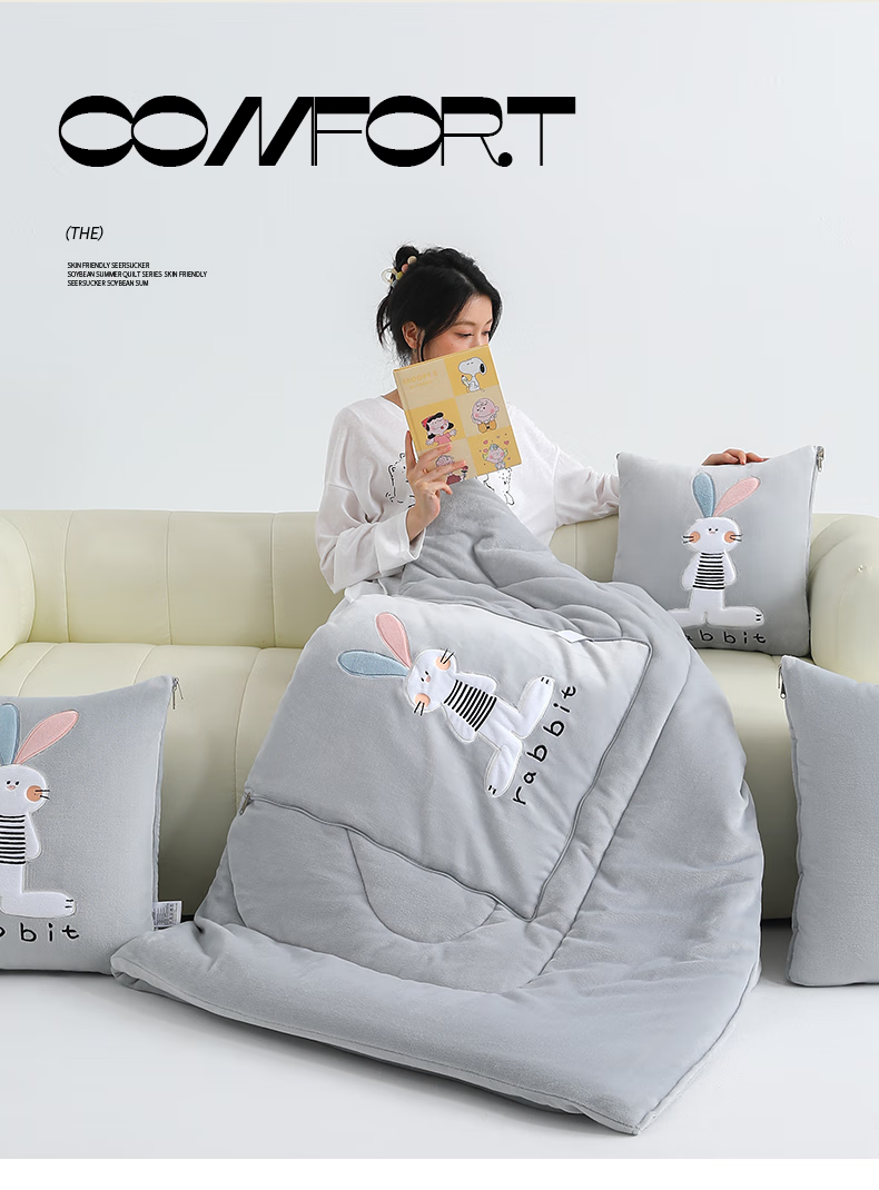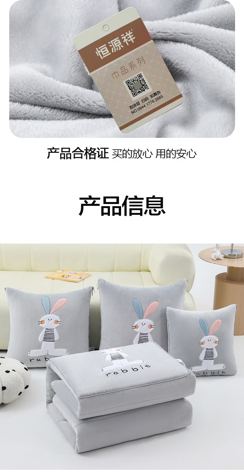 恒源祥卡通牛奶绒抱枕被梦幻兔办公室午睡毯枕头被子二合一小毯子午睡 梦幻兔-高级灰 40cm*40cm 展开105*155cm