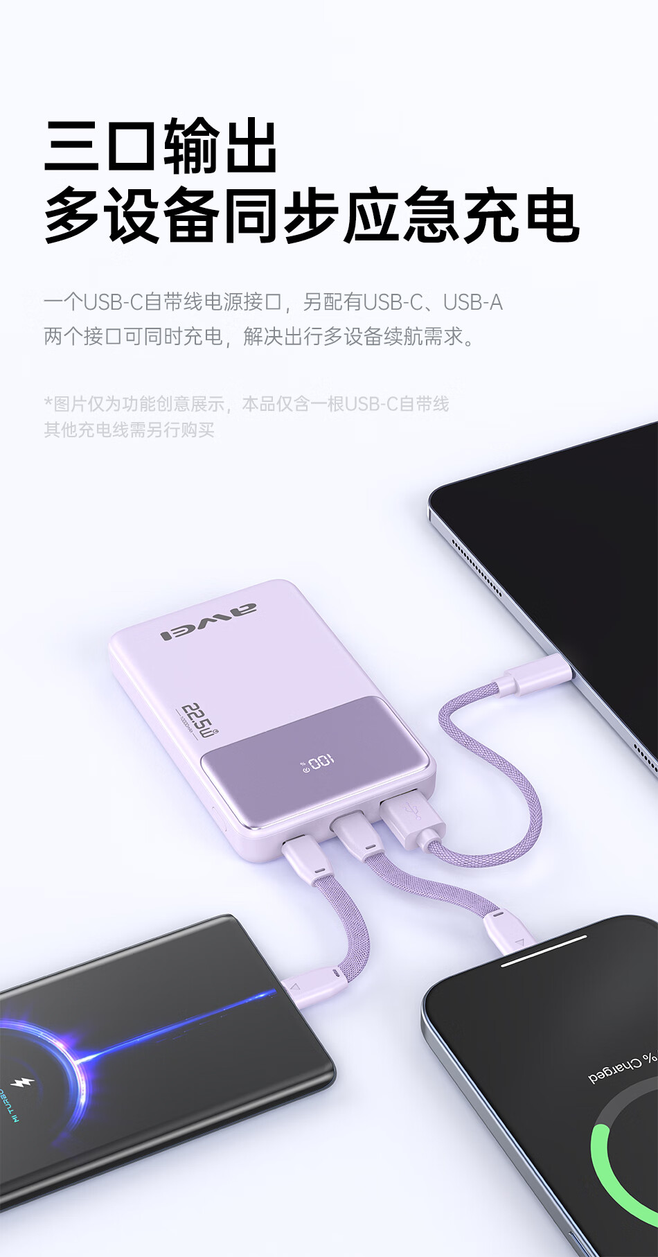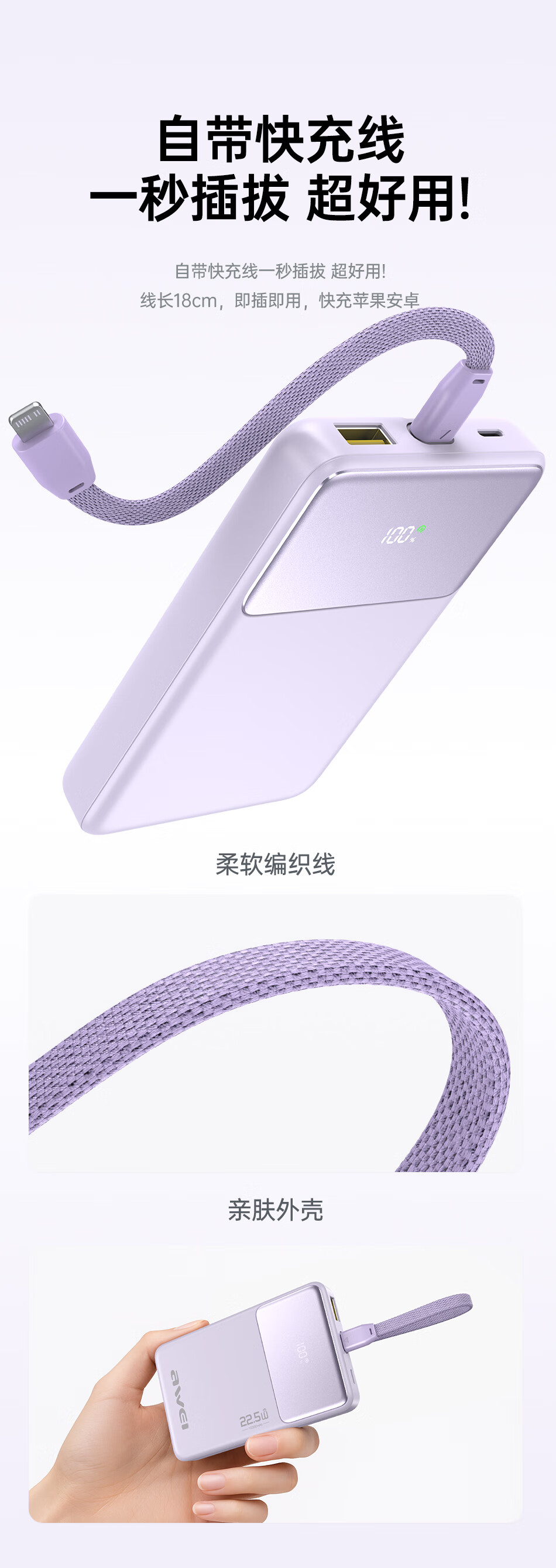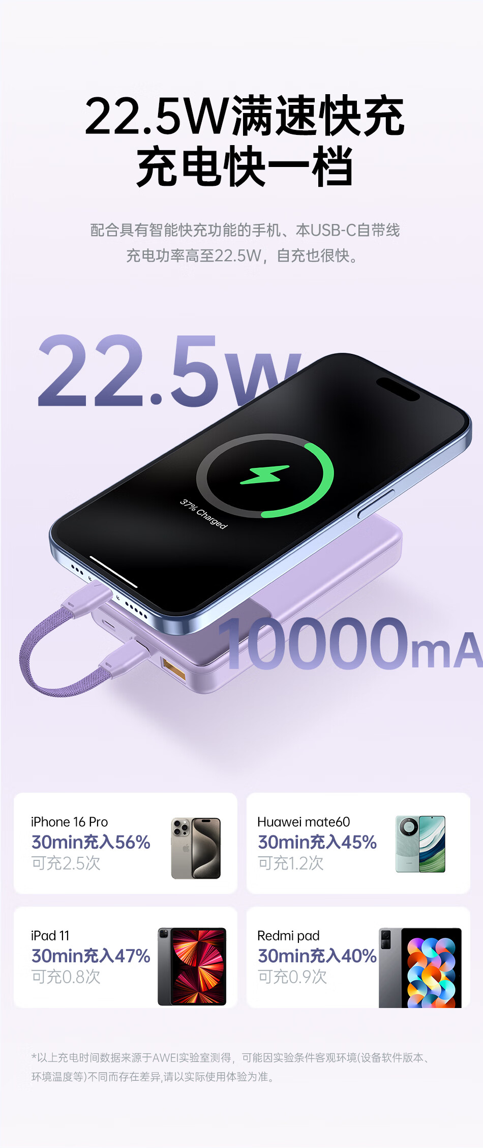 用维(AWEI)充电宝10000毫安大容量自带线小巧便携22.5W超级快充移动电源适用苹果【国家3C认证可上飞机】 魔幻黑丨带线款丨一线搞定苹果/安卓/自充 10000mAh