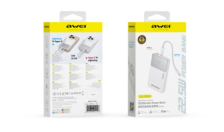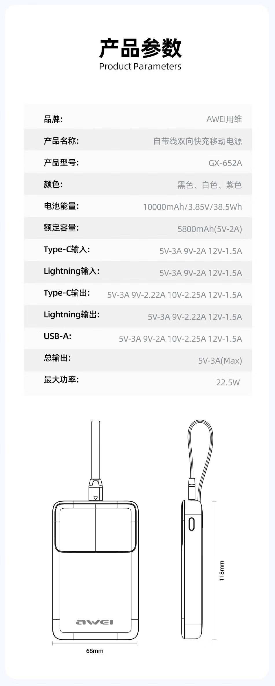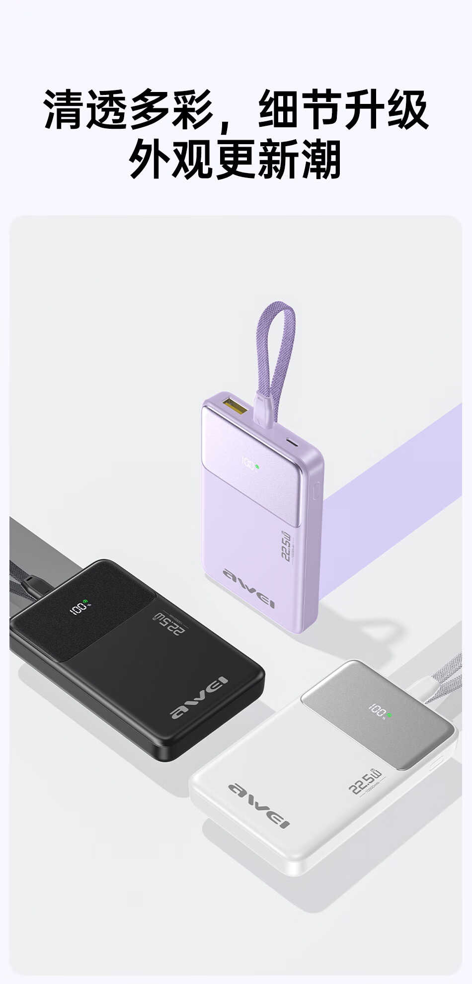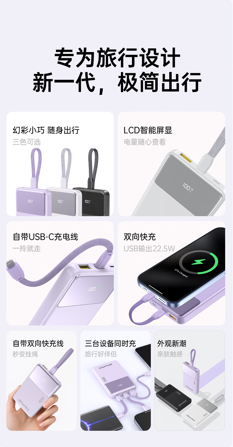 用维(AWEI)充电宝10000毫安大容量自带线小巧便携22.5W超级快充移动电源适用苹果【国家3C认证可上飞机】 魔幻黑丨带线款丨一线搞定苹果/安卓/自充 10000mAh
