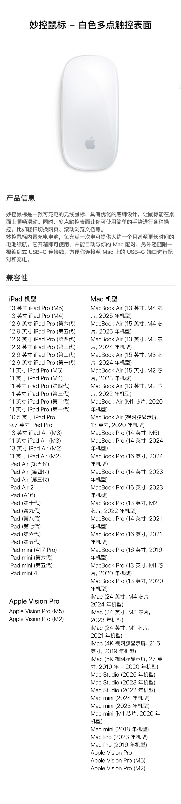 Apple/苹果 妙控鼠标-白色 多点触控表面 苹果鼠标无线蓝牙鼠标无线鼠标办公鼠标静音便携