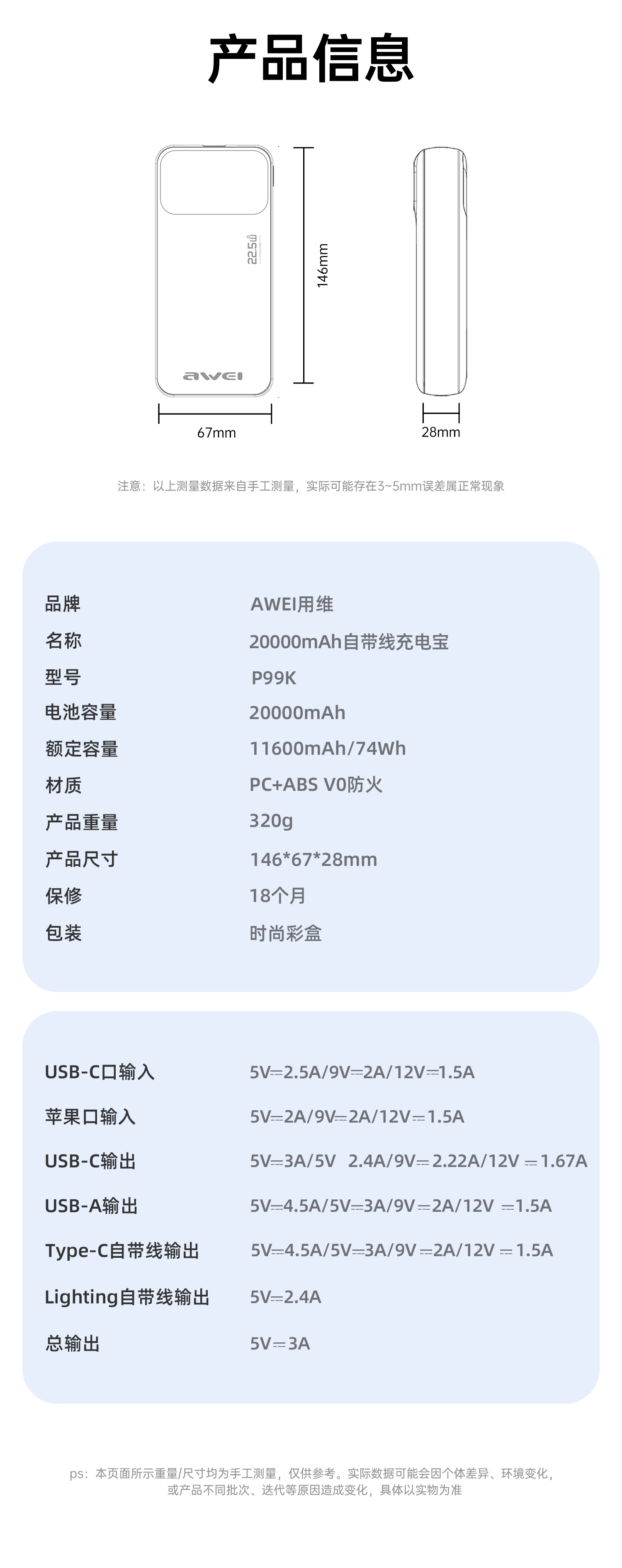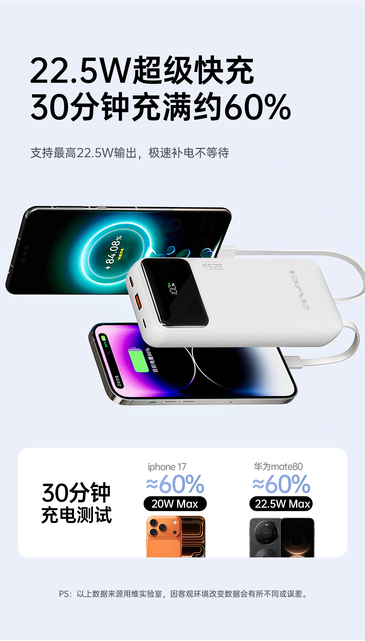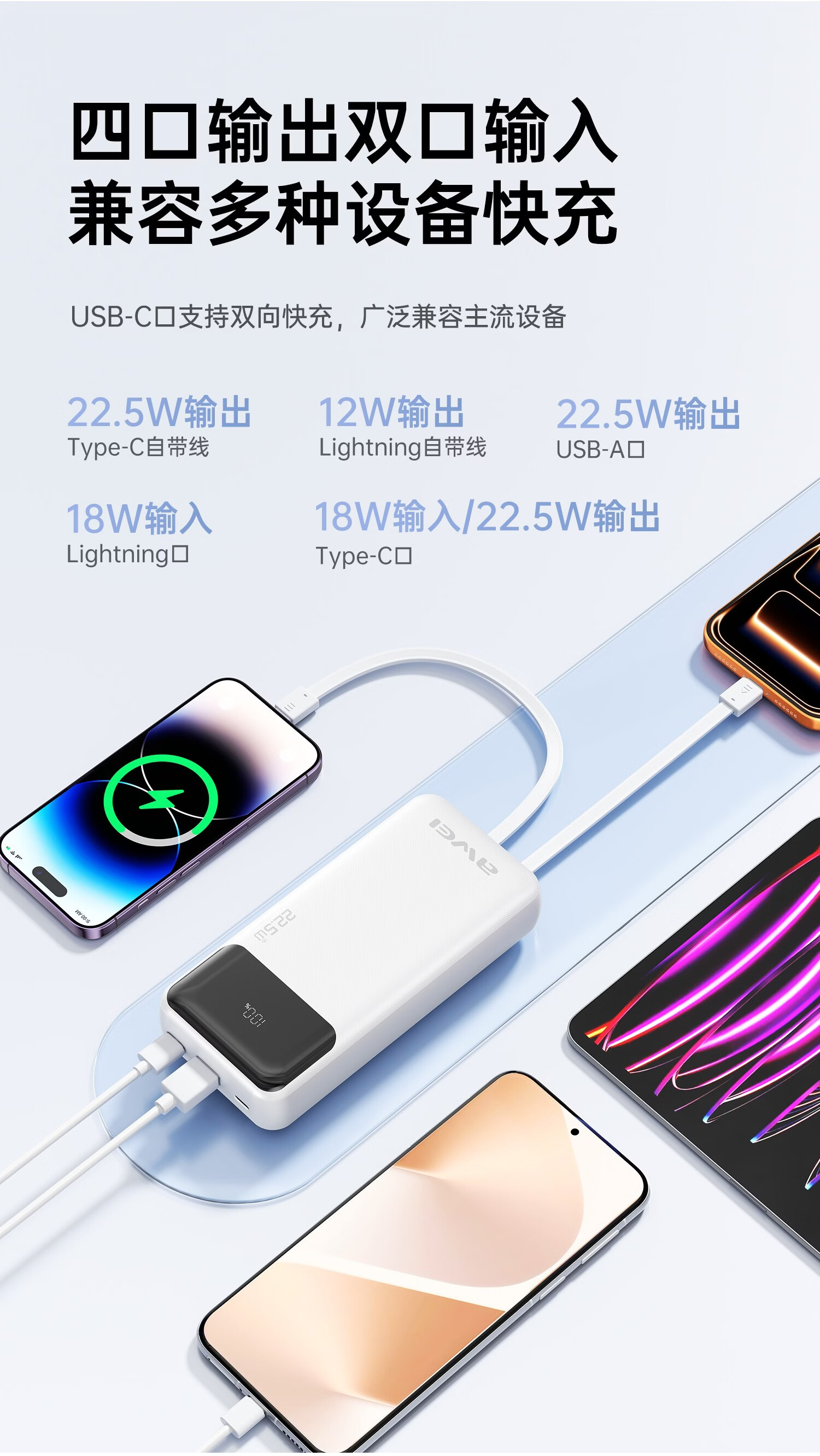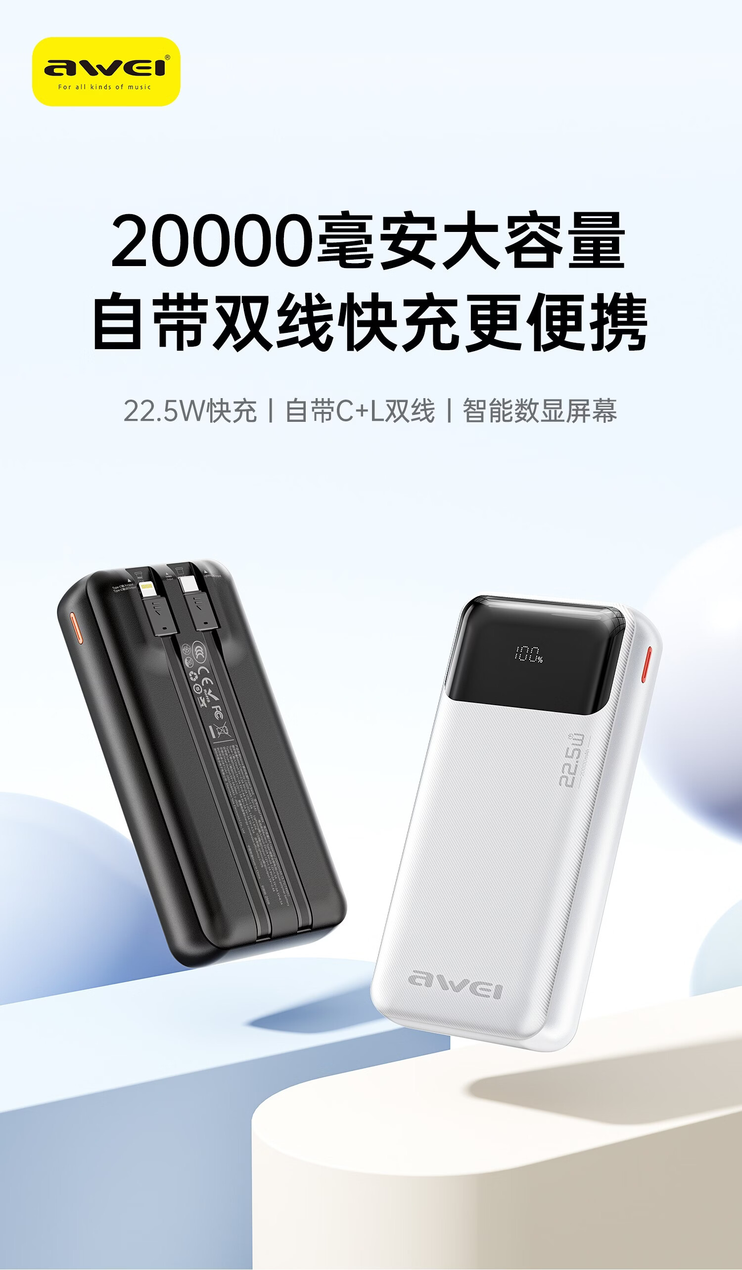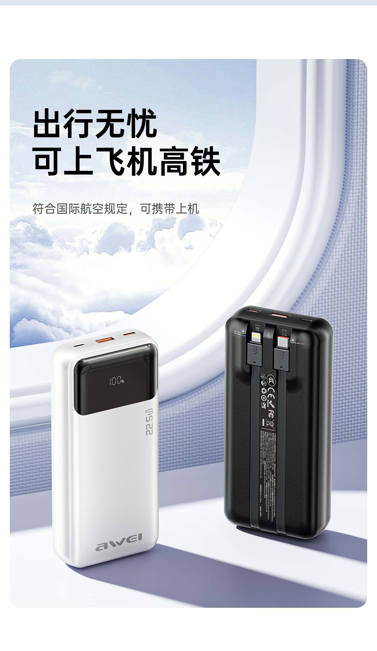 用维(AWEI)20000毫安充电宝自带双线大容量超薄小巧便携移动电源适用苹果17【国家3C认证可上飞机】 黑色 20000mAh