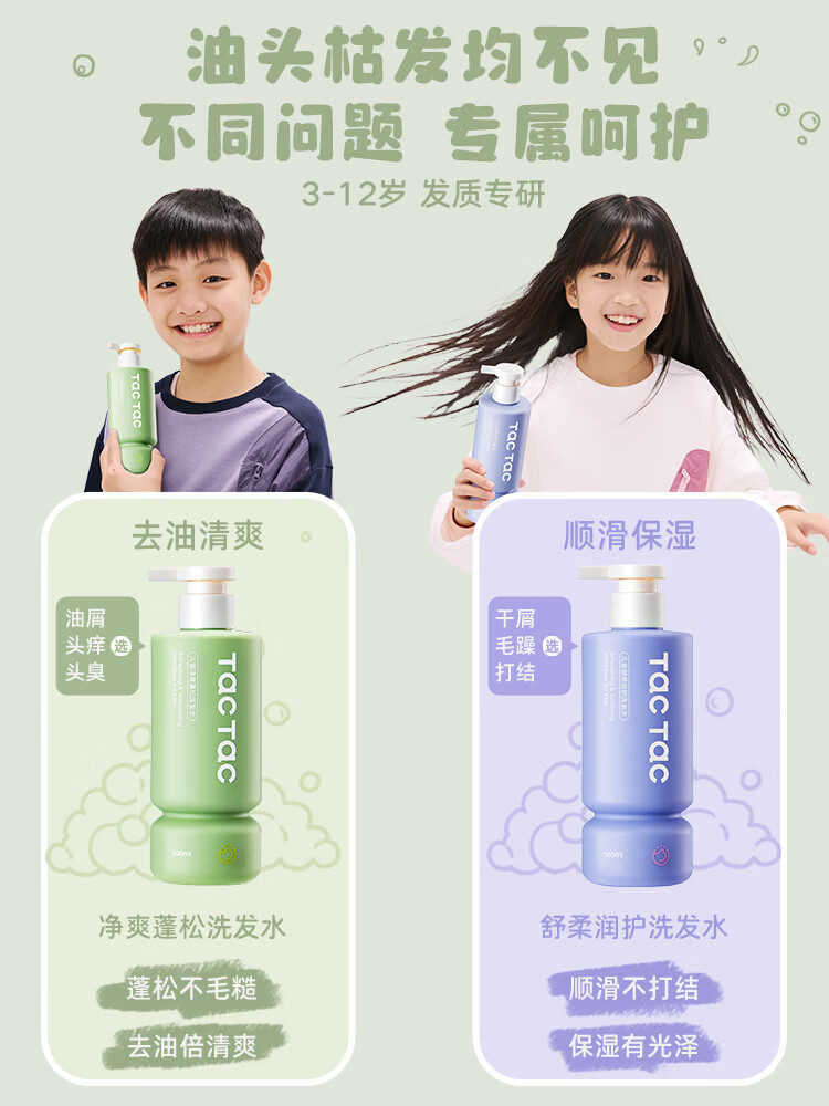 Tac Tac儿童去油顺滑洗发水男孩女孩洗发专用保湿清洁洗护一体洗发水 净爽蓬松洗发水+同款替换装*2袋