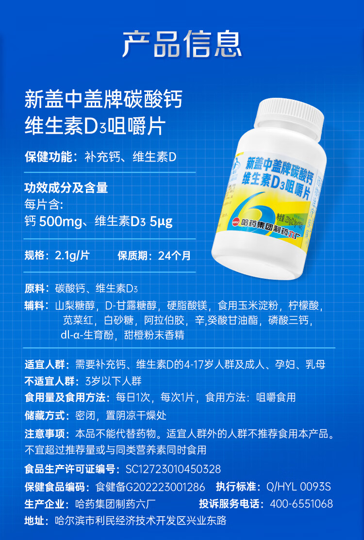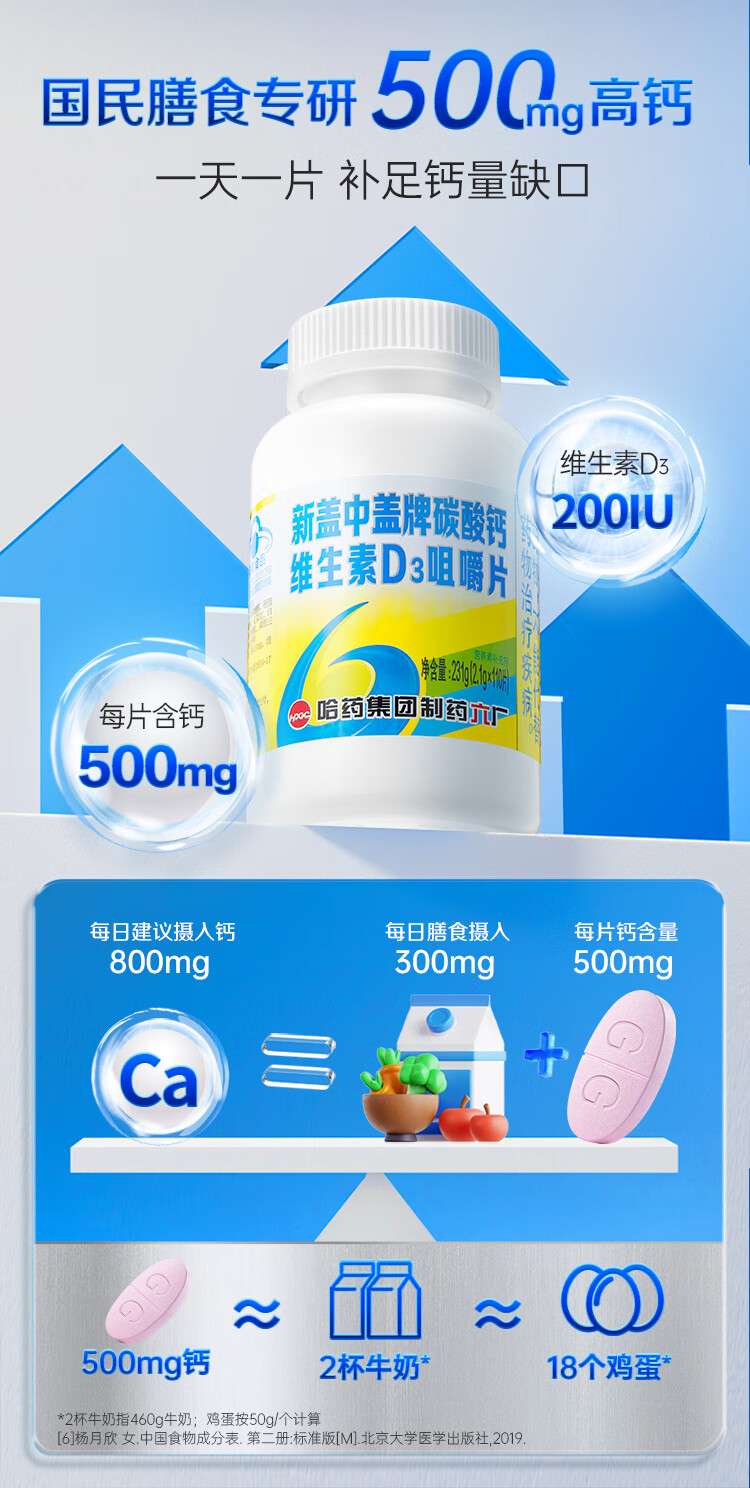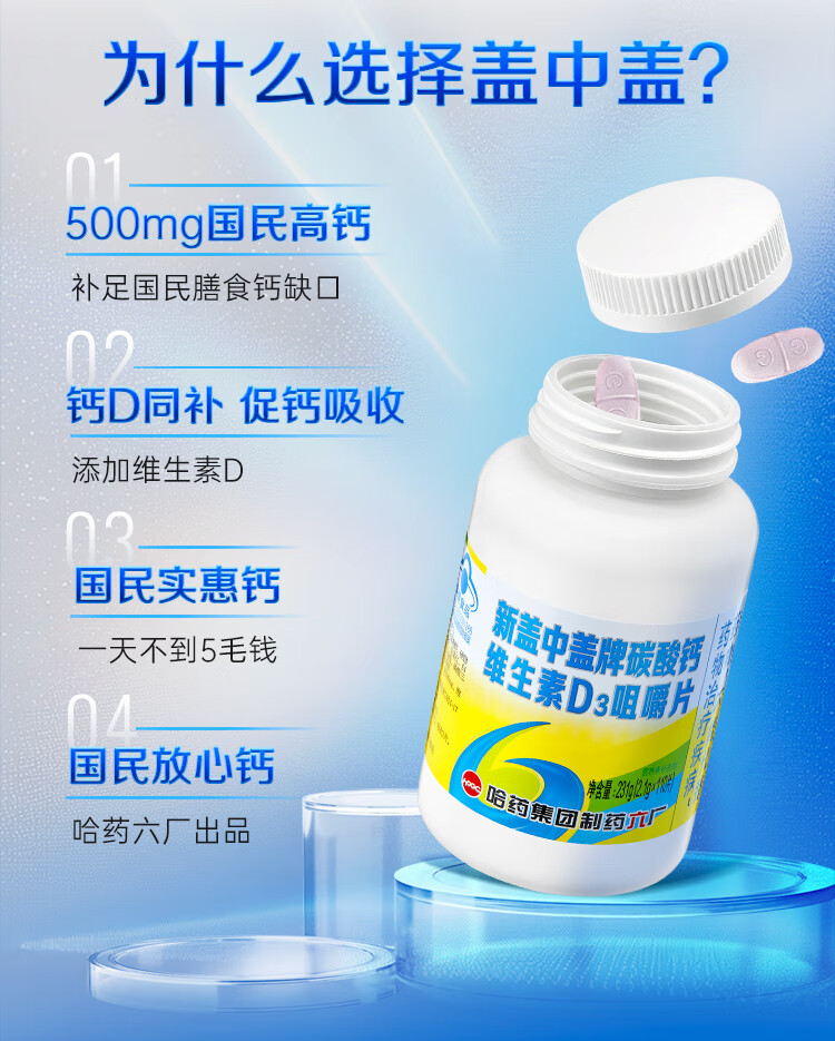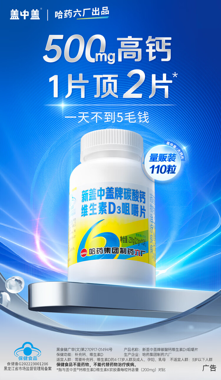 哈药盖中盖牌高钙片 成人学生青少年中老年补钙 添加维生素D 【高钙片礼盒】 110片*3瓶