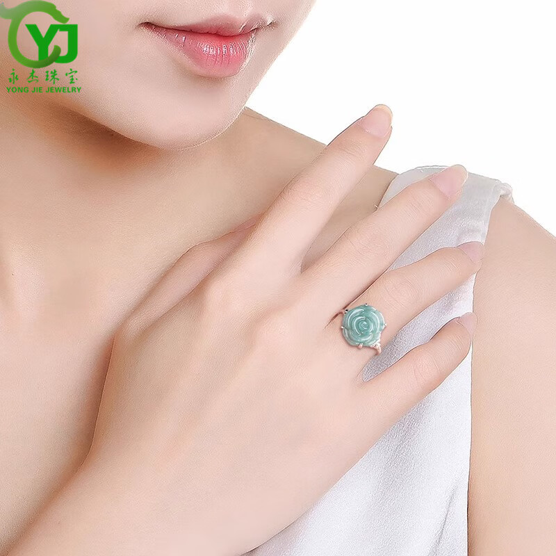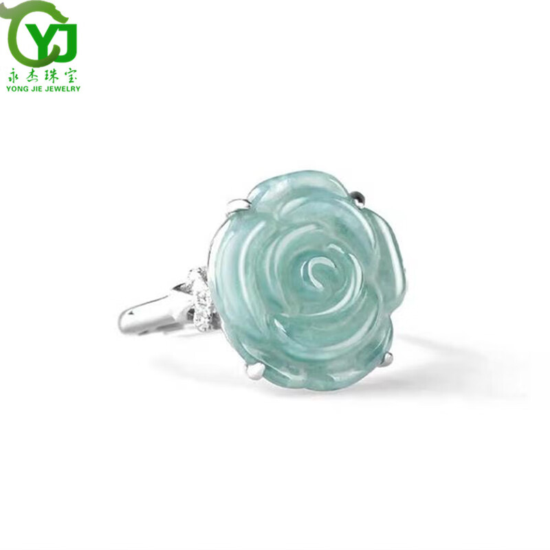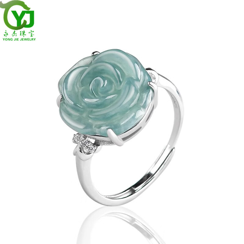 杰嘉宝玉A货翡翠蓝水玫瑰花戒指冰种玉石时尚指环女戒可调节带证书