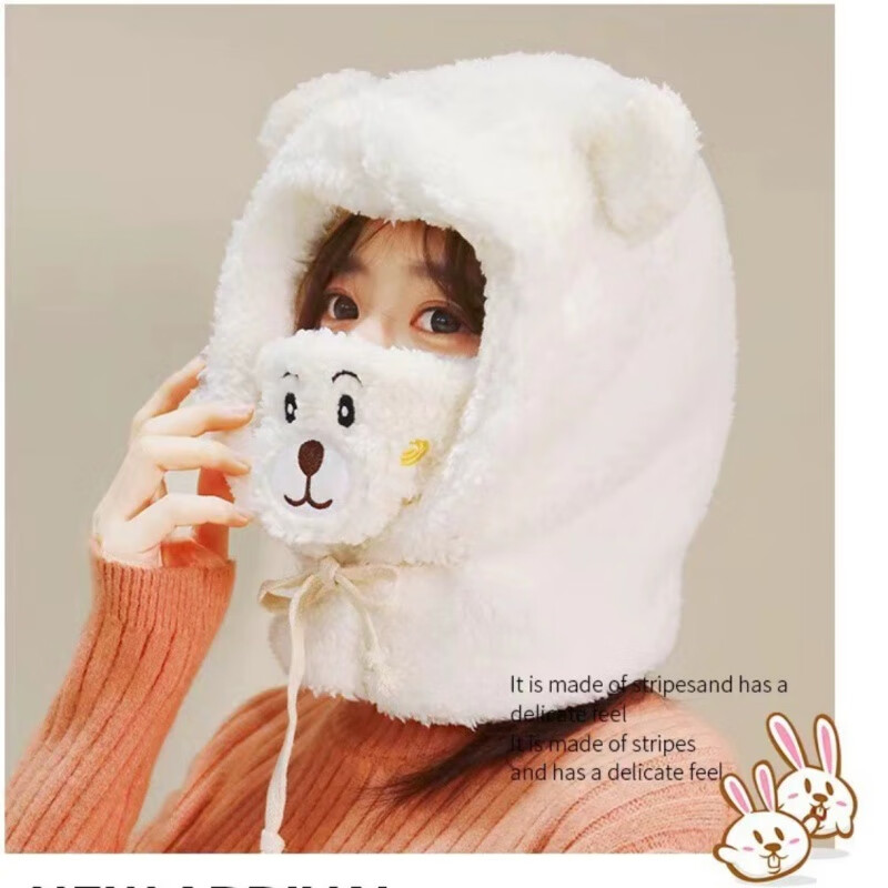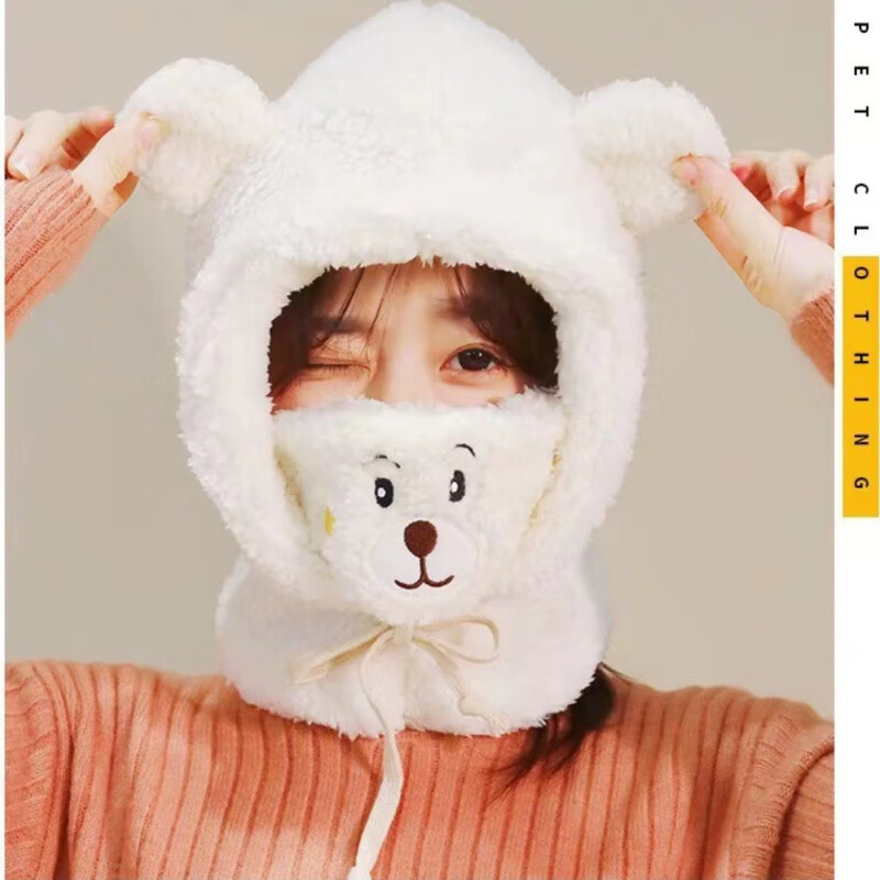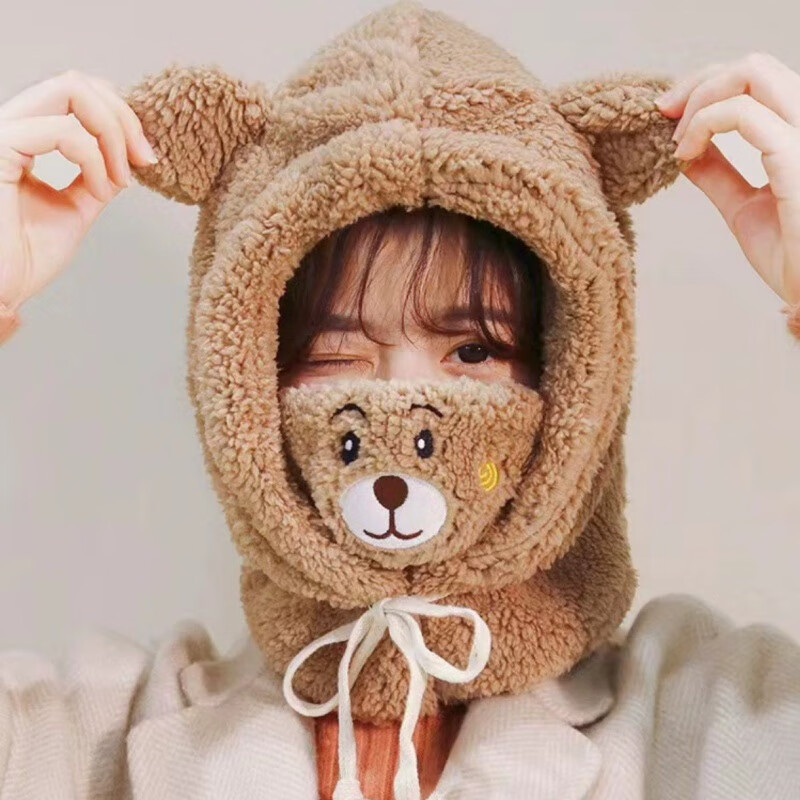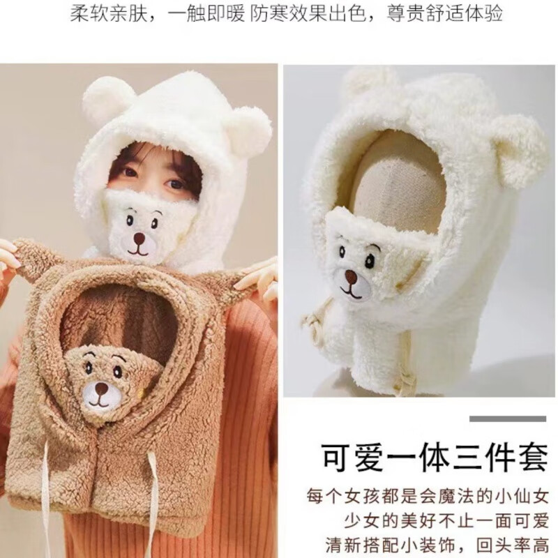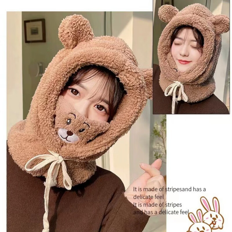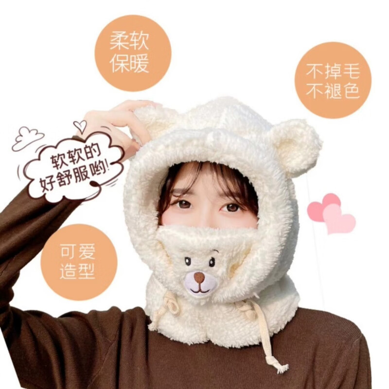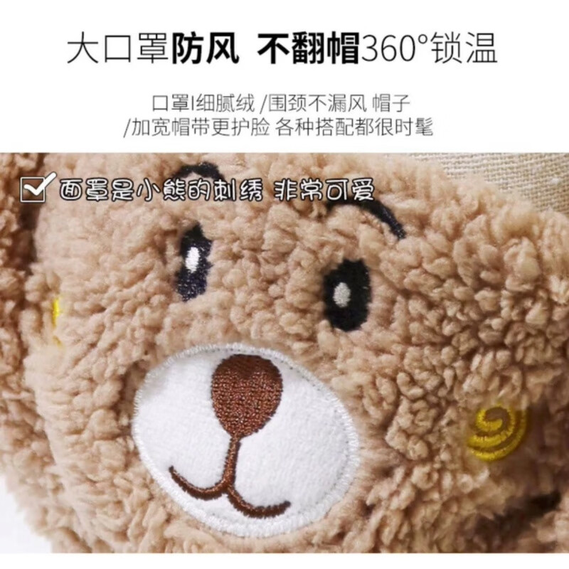 帽子冬季女保暖面罩围脖一体帽防风防寒护耳小熊帽可爱卡通帽 卡其色