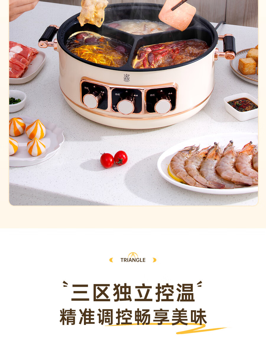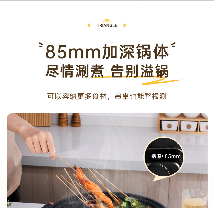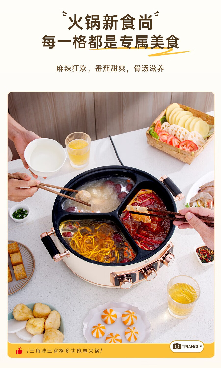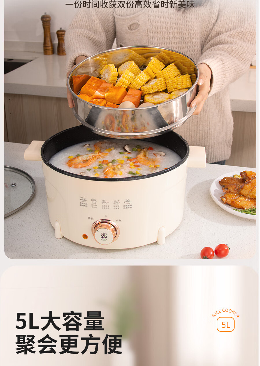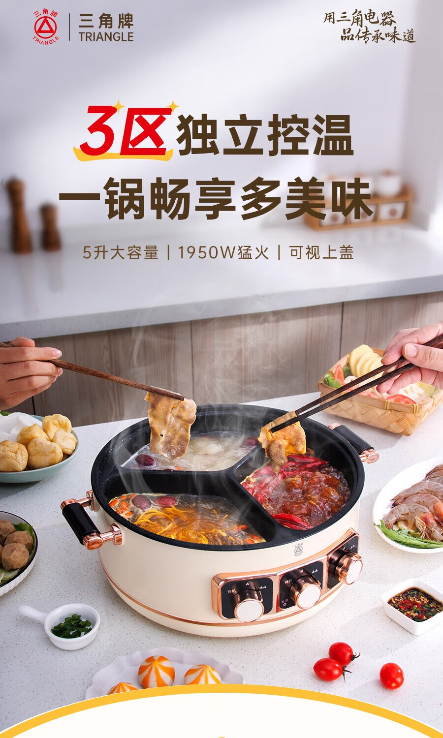 三角牌 一体电火锅 火锅专用锅 电煮锅电炒锅电热锅蒸煮家用多功能电锅 5L 【1300W大功率】配不锈钢蒸笼京东自营