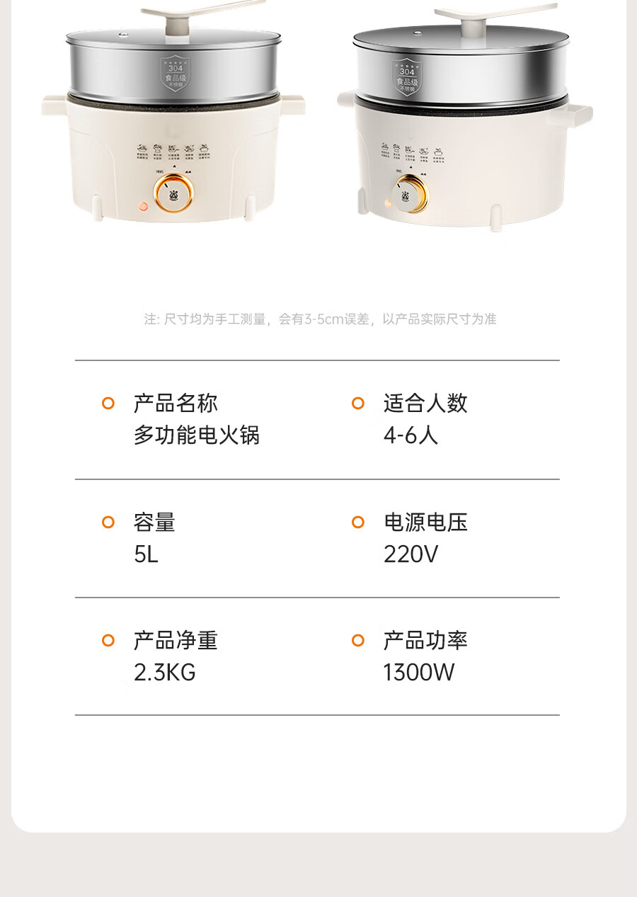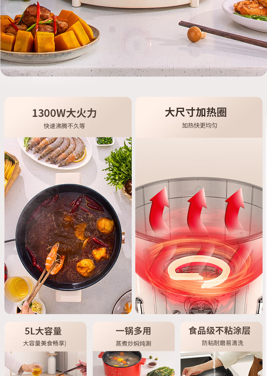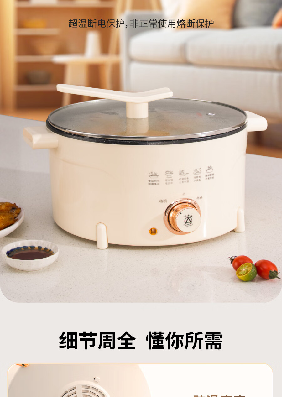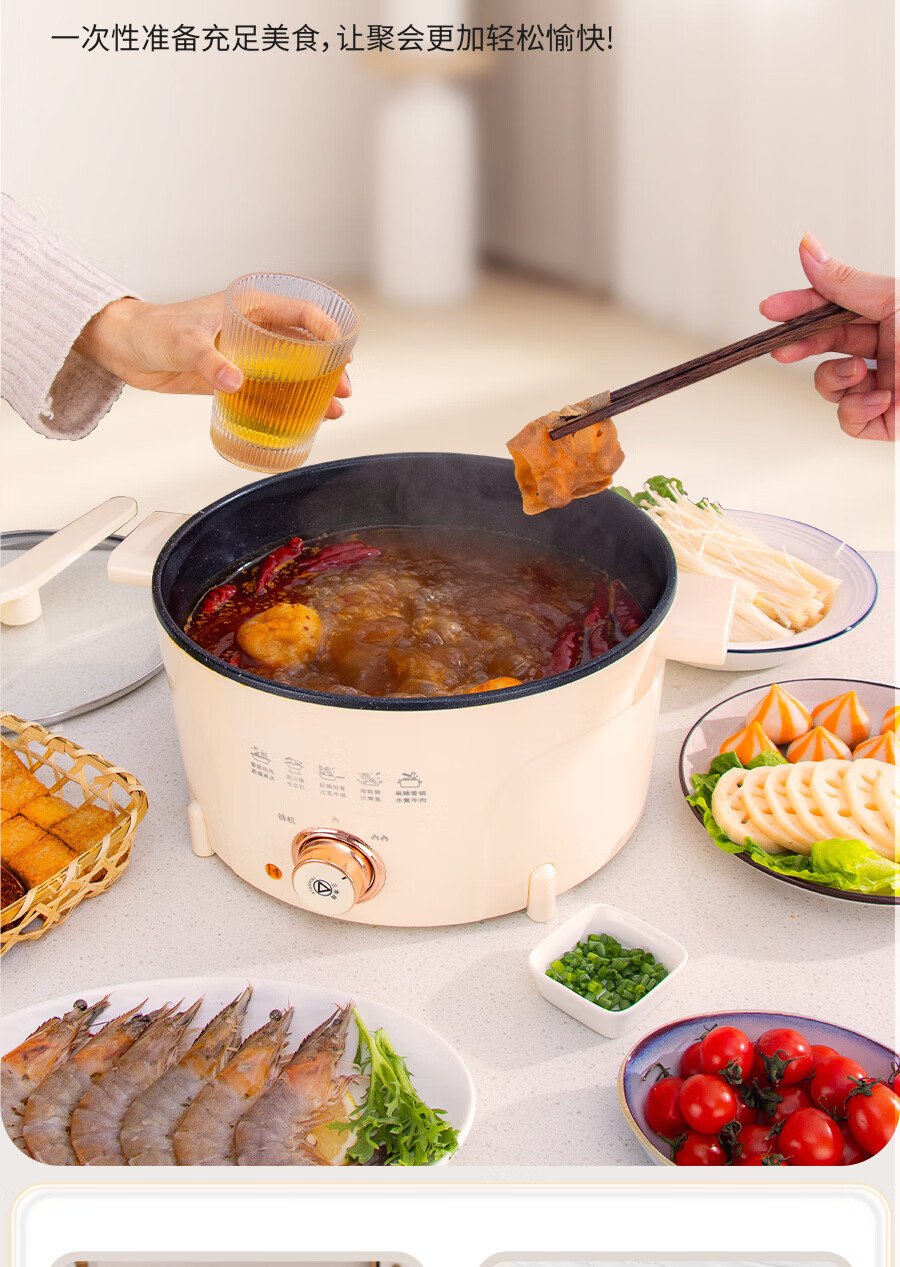三角牌 一体电火锅 火锅专用锅 电煮锅电炒锅电热锅蒸煮家用多功能电锅 5L 【1300W大功率】配不锈钢蒸笼