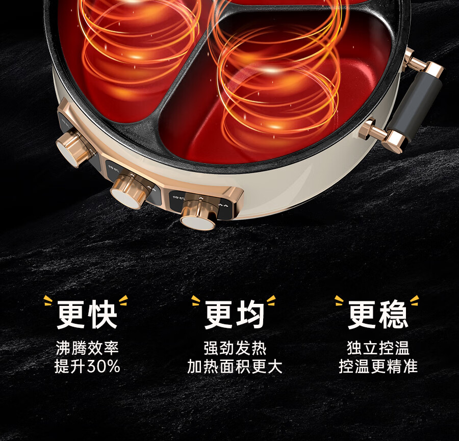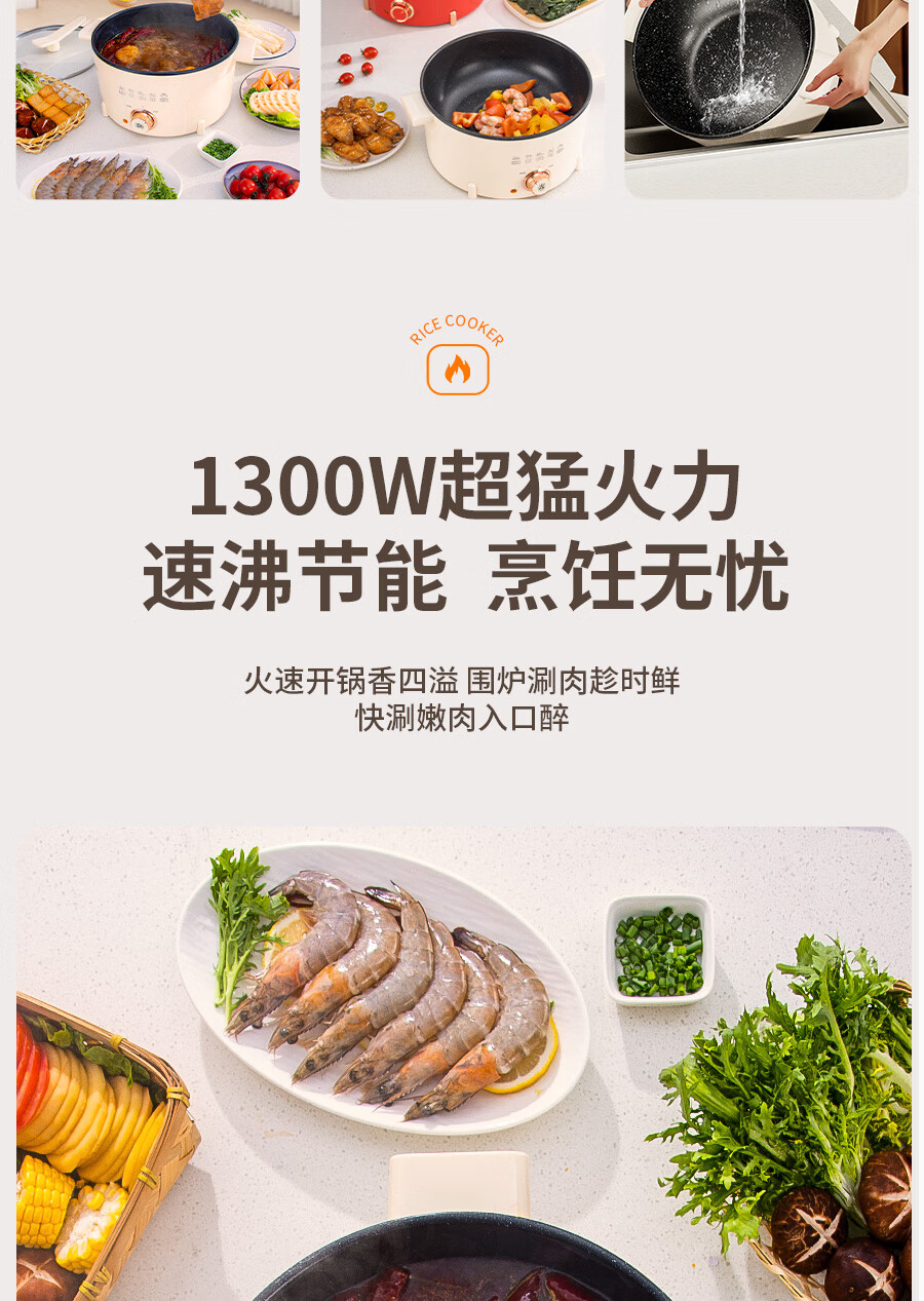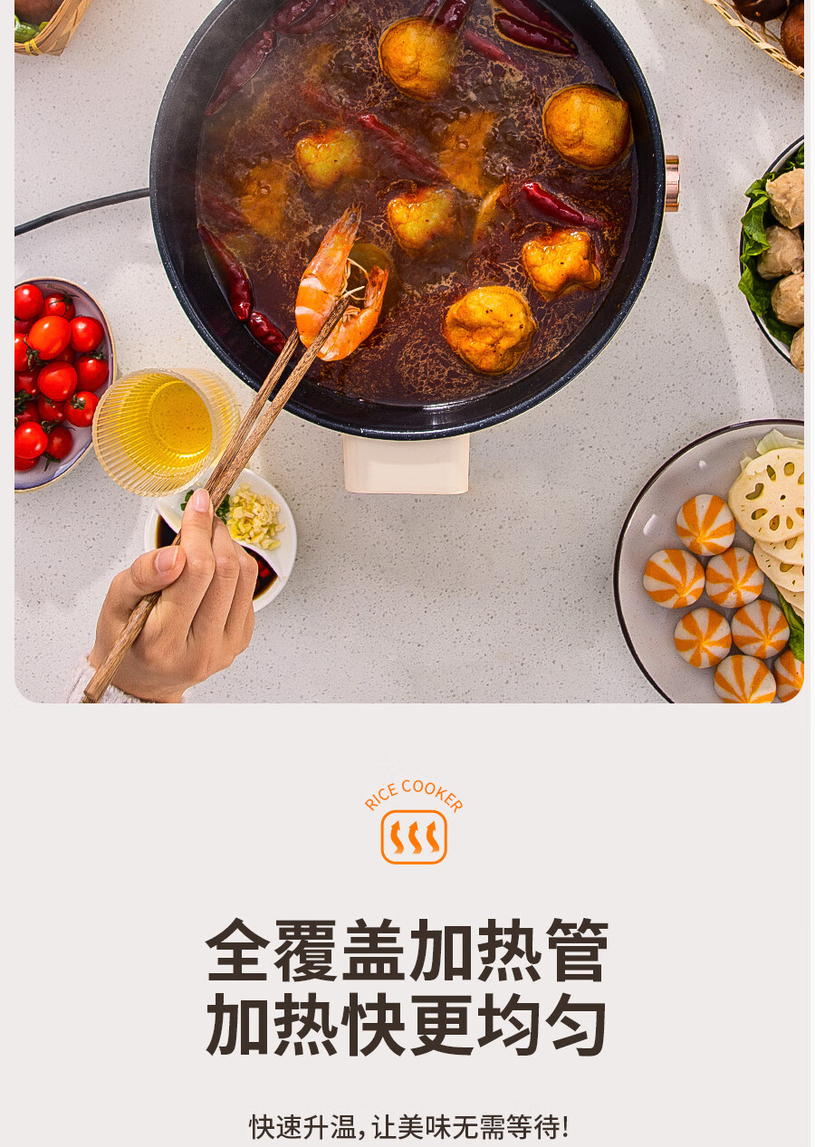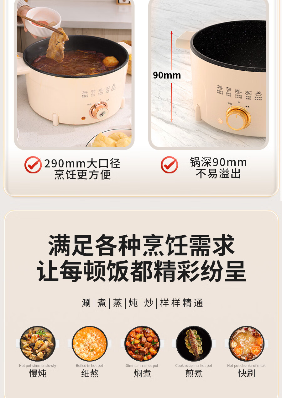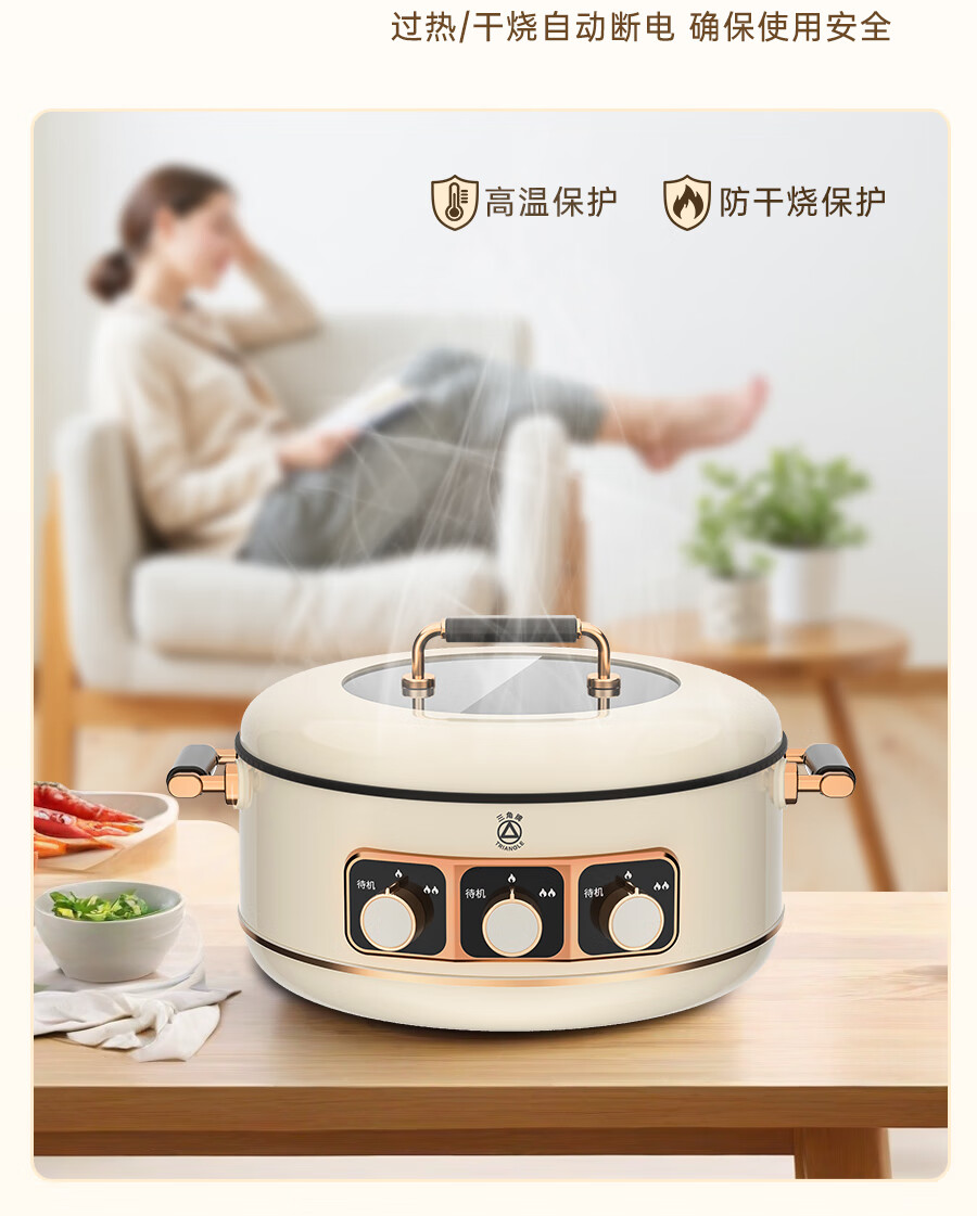 三角牌 一体电火锅 火锅专用锅 电煮锅电炒锅电热锅蒸煮家用多功能电锅 5L 【1300W大功率】配不锈钢蒸笼