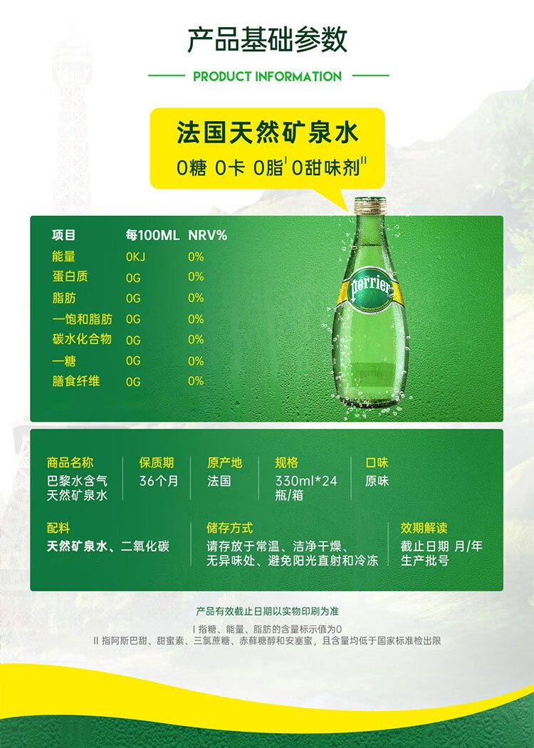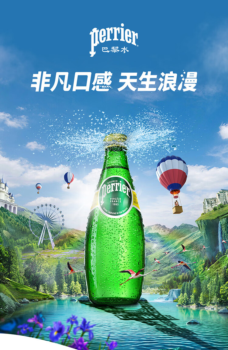 Perrier巴黎水 原装进口气泡水 0糖0卡原味天然矿泉水330ml*24瓶