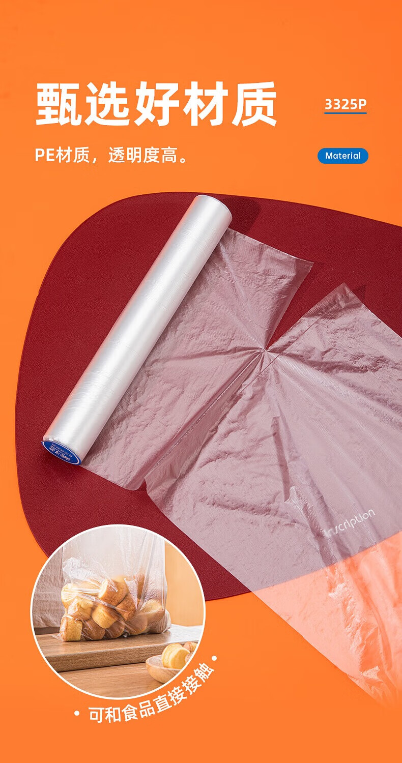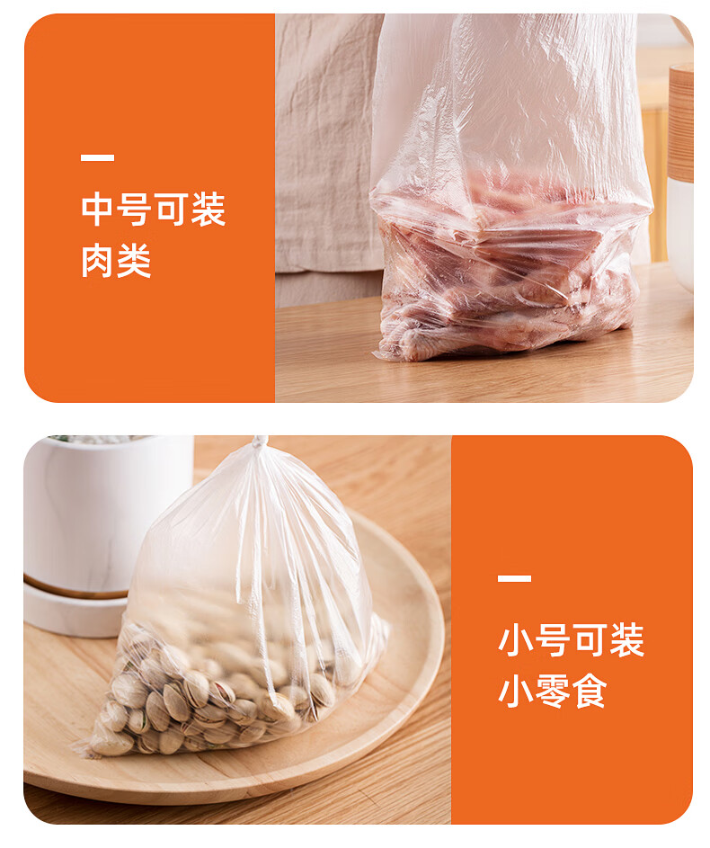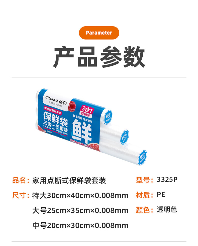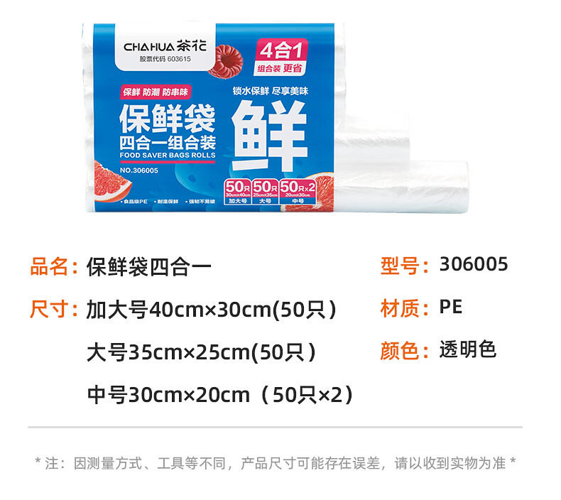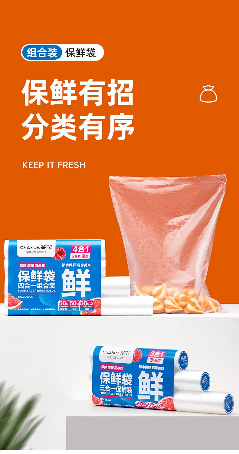 茶花(CHAHUA)食品级加厚保鲜袋家用透明点断式松紧塑料袋 【点断式】加大*50+大*50+中*100只