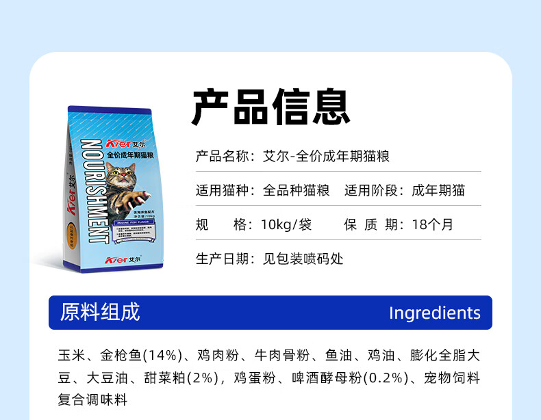 艾尔猫粮海洋鱼配方成猫粮全价鱼肉味10kg流浪猫救助粮20斤 10kg20斤