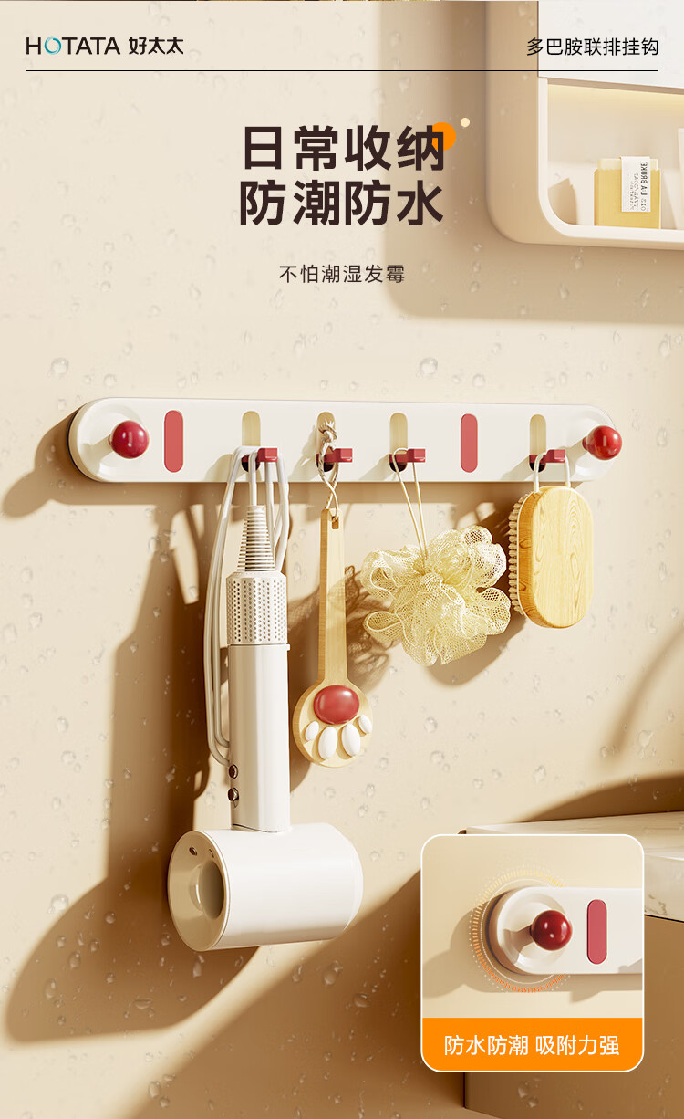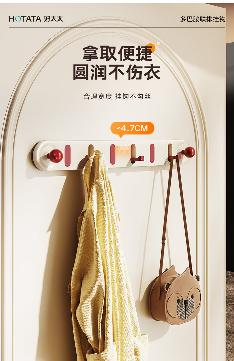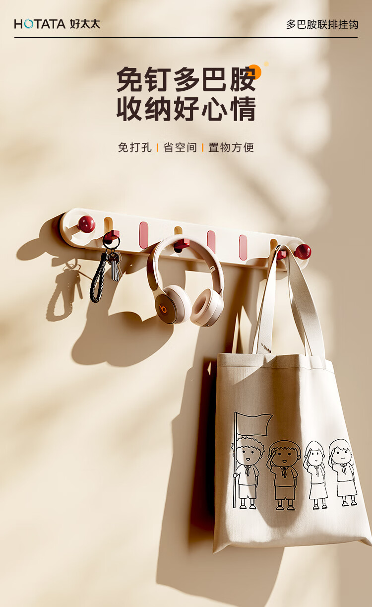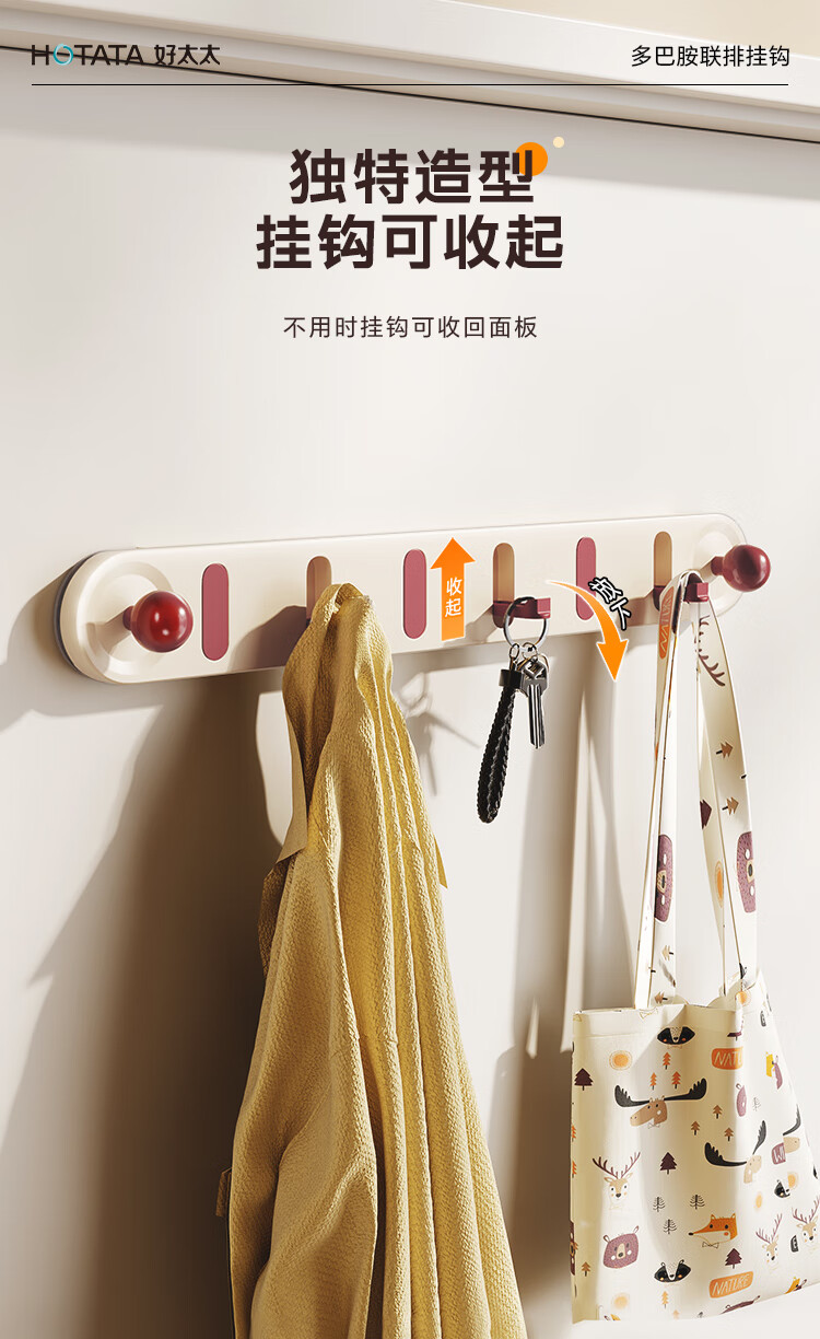 好太太(Hotata)联排挂钩家用多巴胺吸盘可折叠门后多功能衣物钥匙毛巾收纳挂钩 【单支装】红色-联排4钩