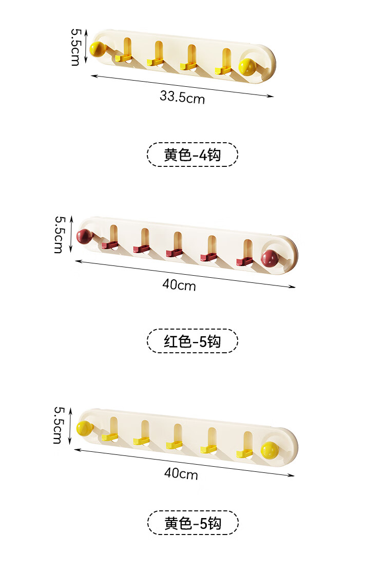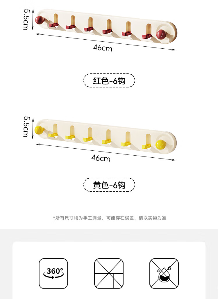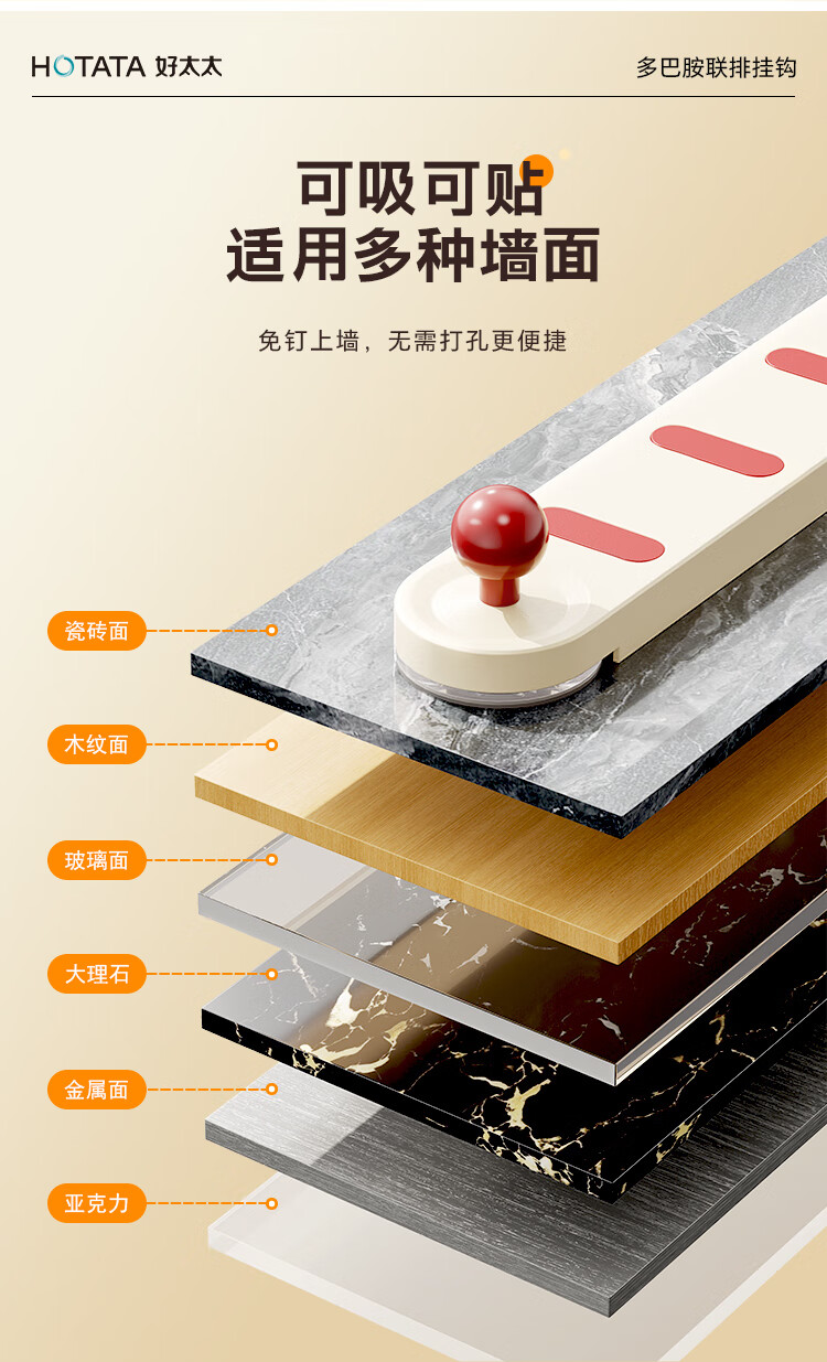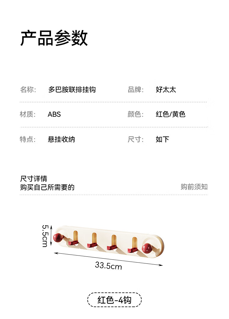 好太太(Hotata)联排挂钩家用多巴胺吸盘可折叠门后多功能衣物钥匙毛巾收纳挂钩 【单支装】红色-联排4钩