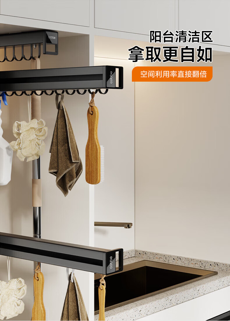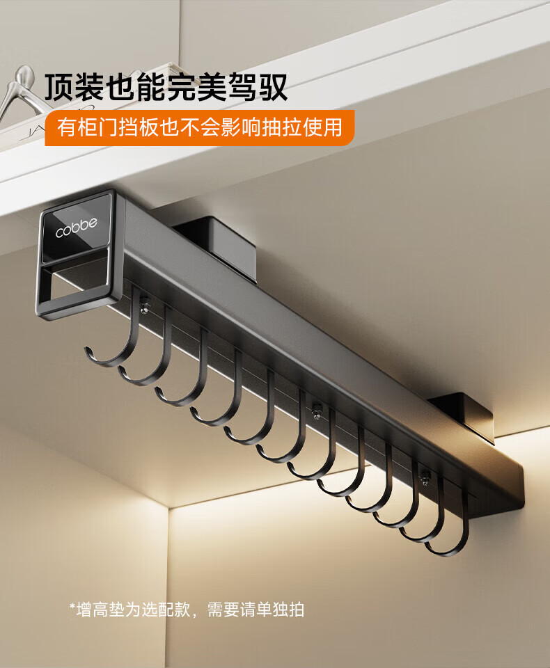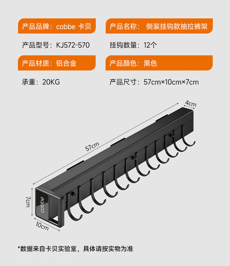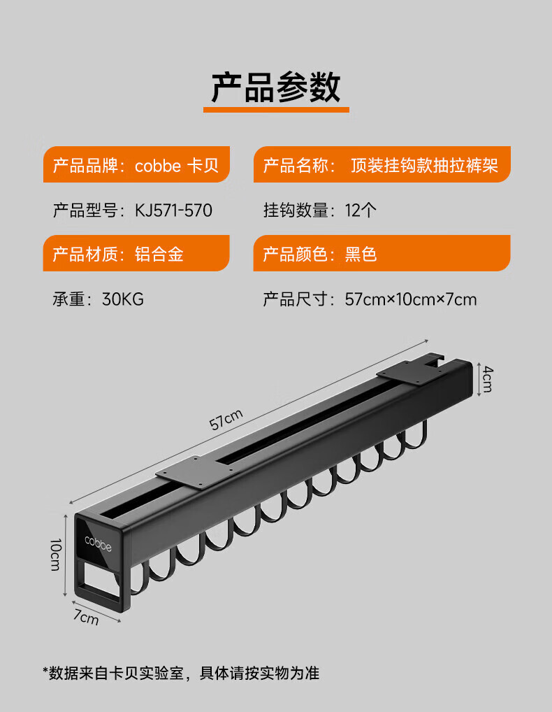 卡贝(cobbe)抽拉衣架伸缩滑轨阳台洗衣机拖把挂钩抽拉式收纳家政柜裤架拉轨道 【顶装】挂钩款裤架-12钩 黑色