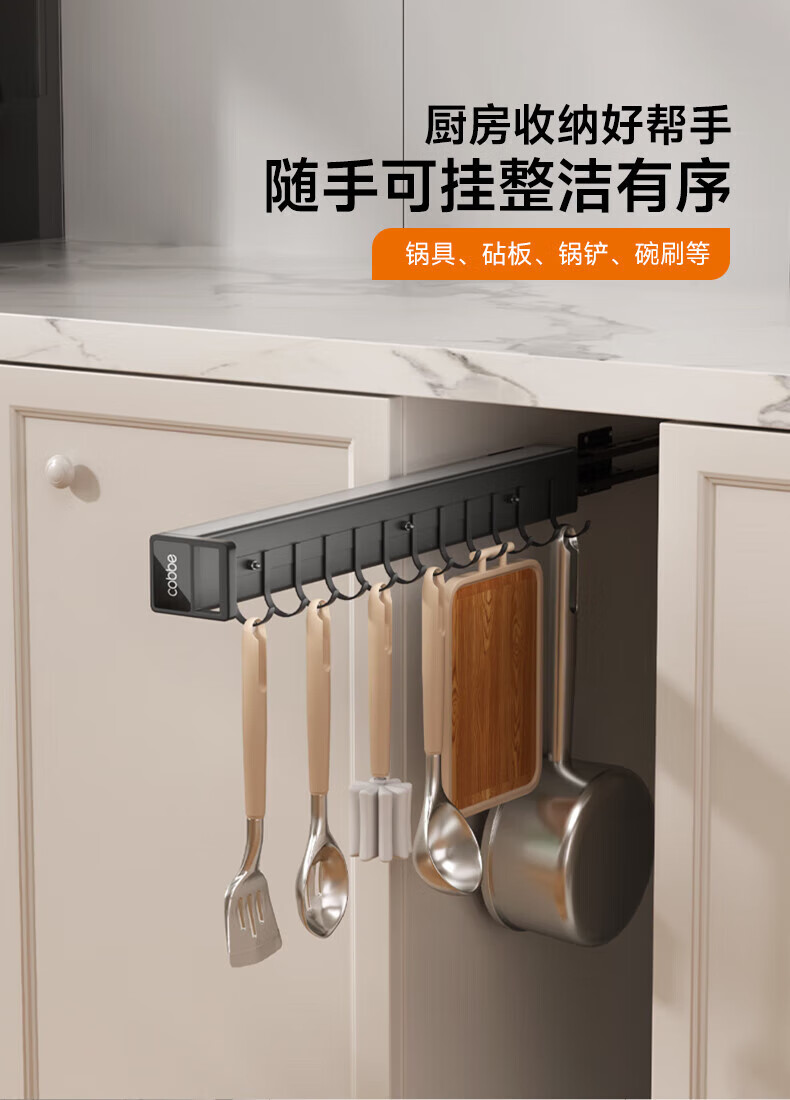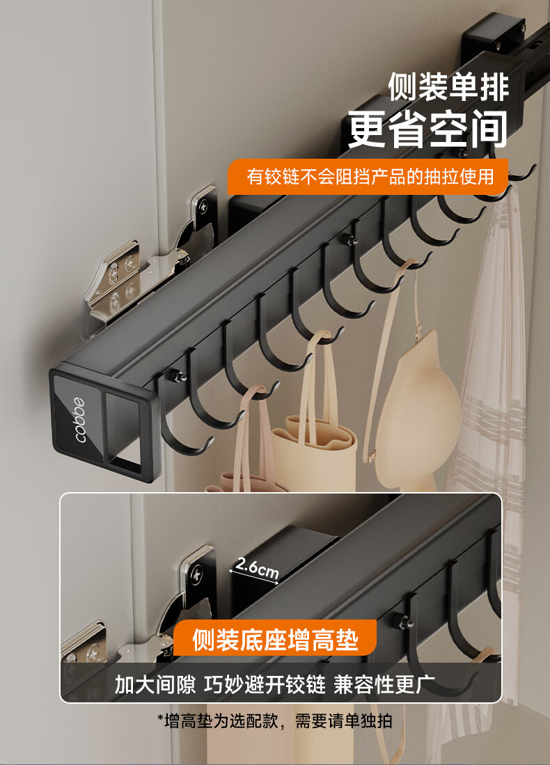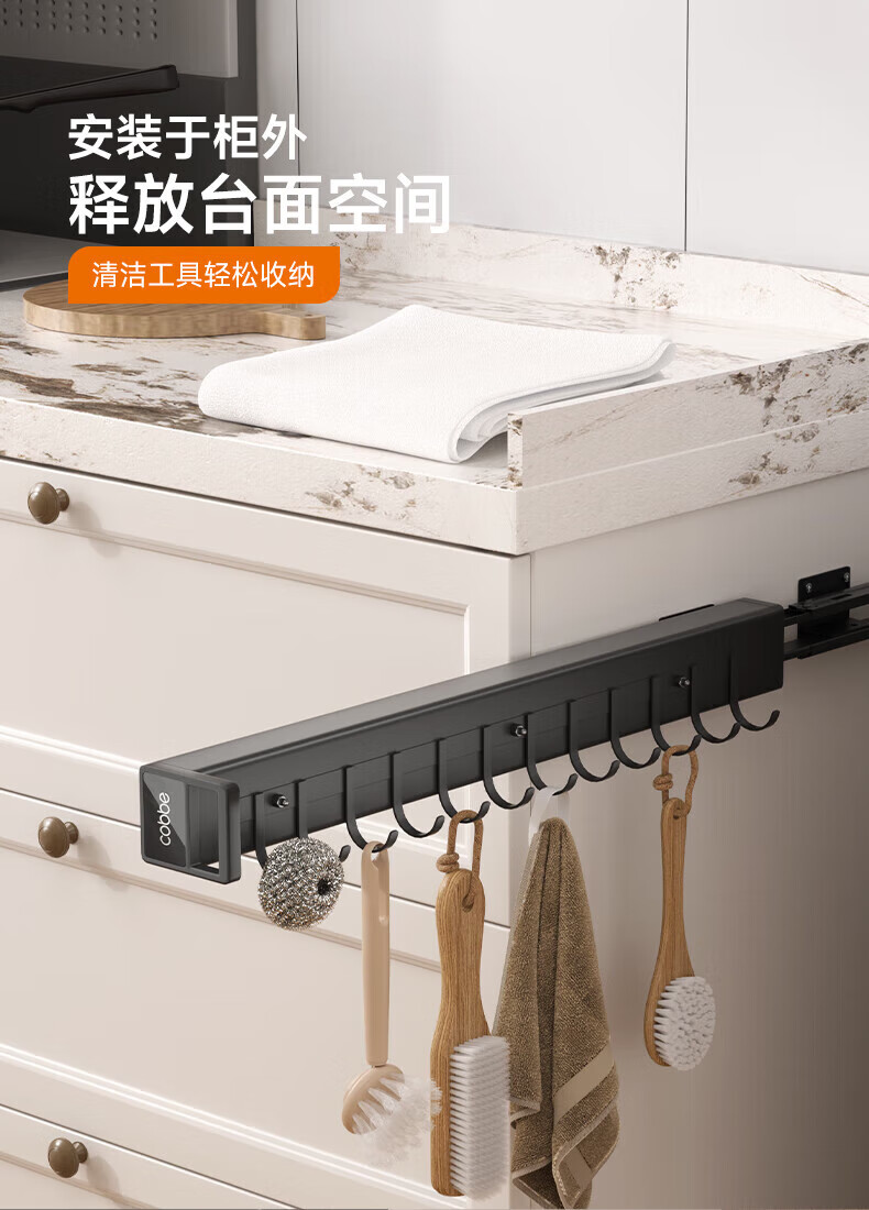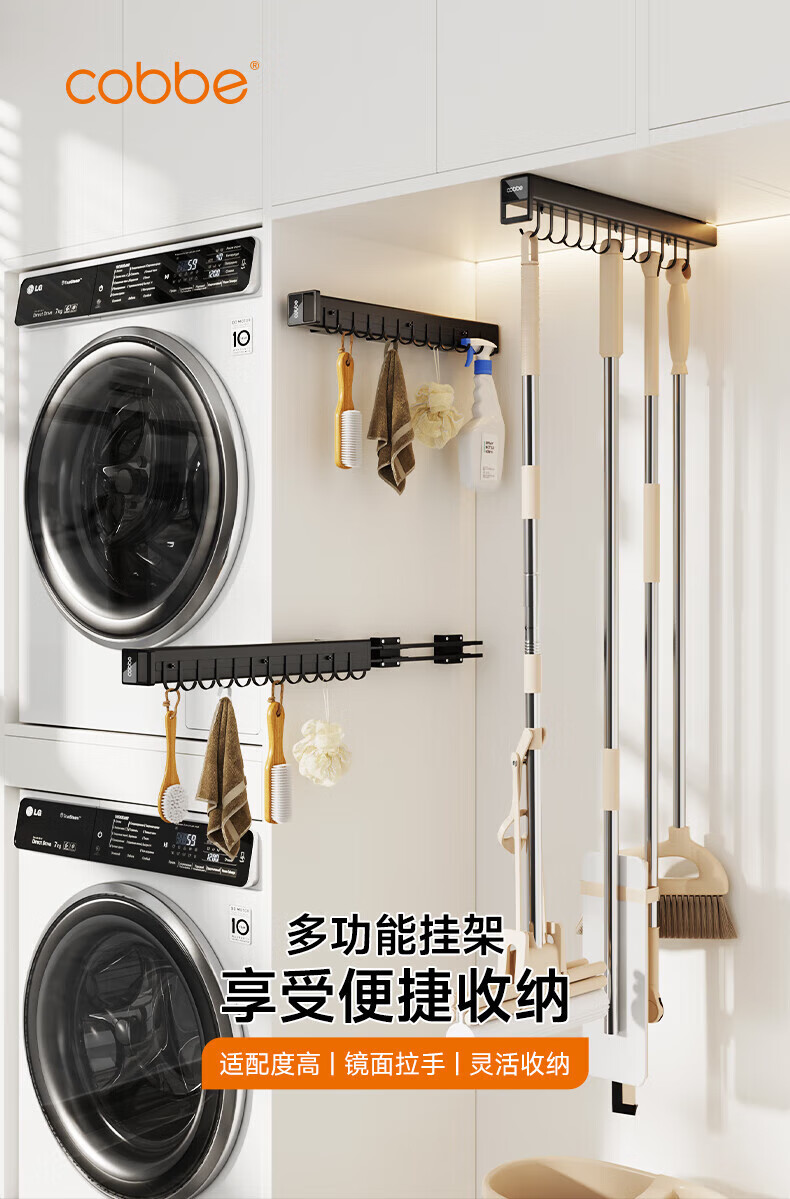 卡贝(cobbe)抽拉衣架伸缩滑轨阳台洗衣机拖把挂钩抽拉式收纳家政柜裤架拉轨道 【顶装】挂钩款裤架-12钩 黑色