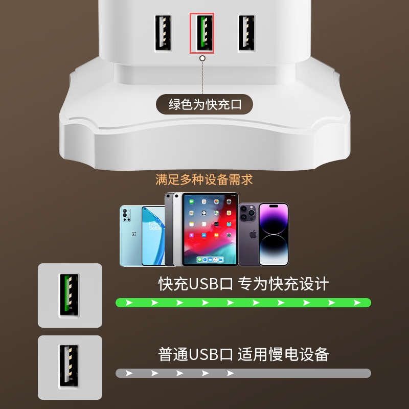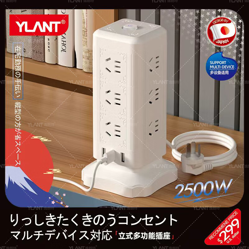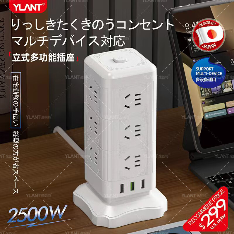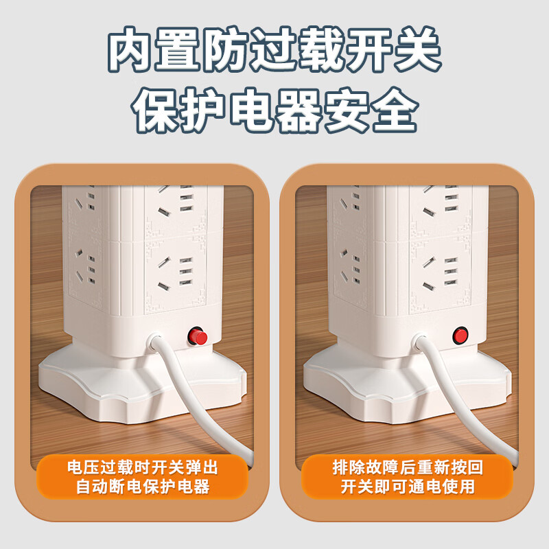 【京东物流】立式防过载过充 USB多功能转换器塔式快充插座排插办公室客厅卧室宿舍 三层12插位带USB+1.8米 立式充电塔【防过载+3C认证+加粗纯桐】