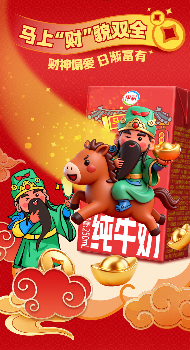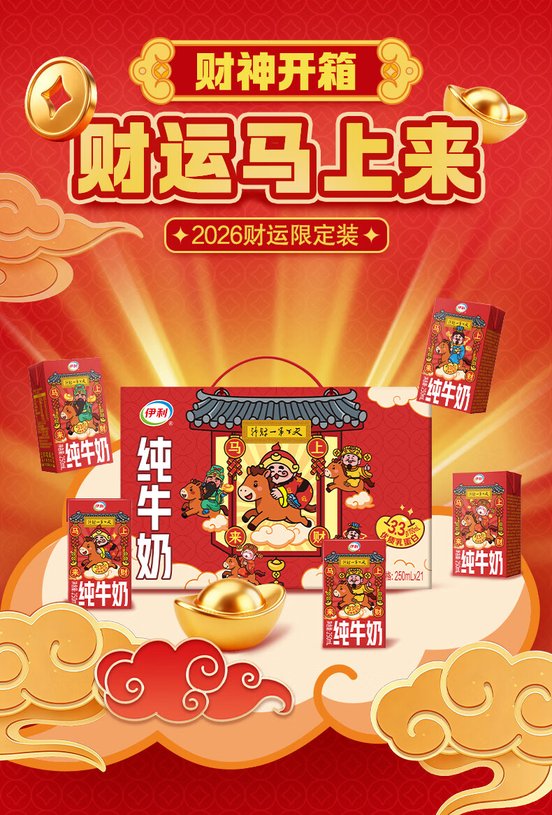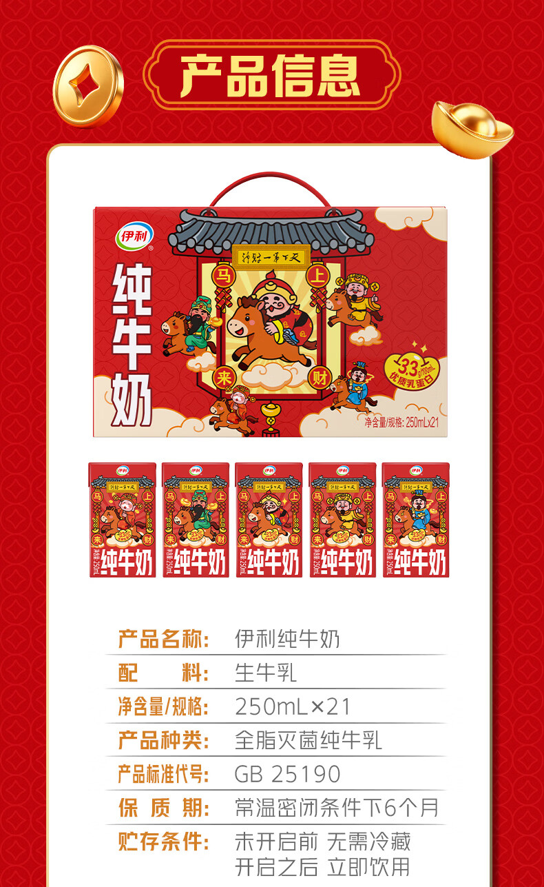 伊利【新鲜日期】纯牛奶250ml*21盒 年货送礼 财神年货礼盒装