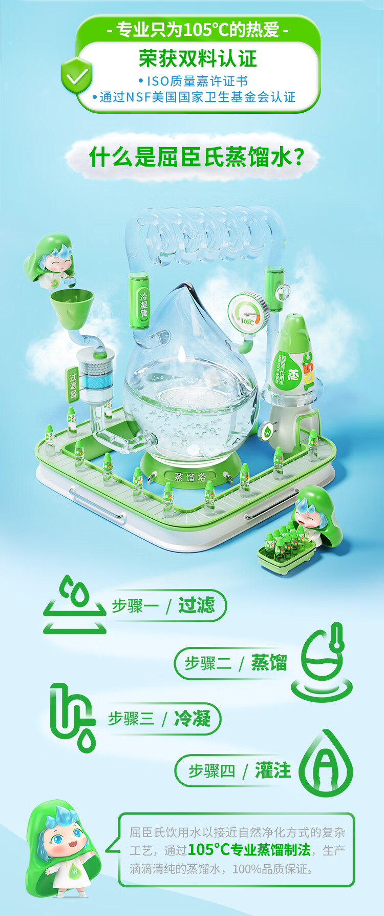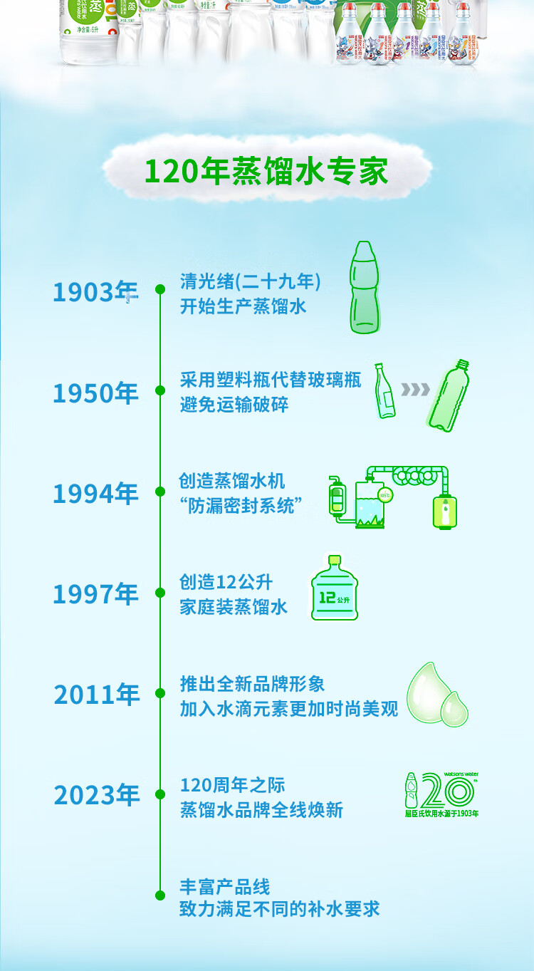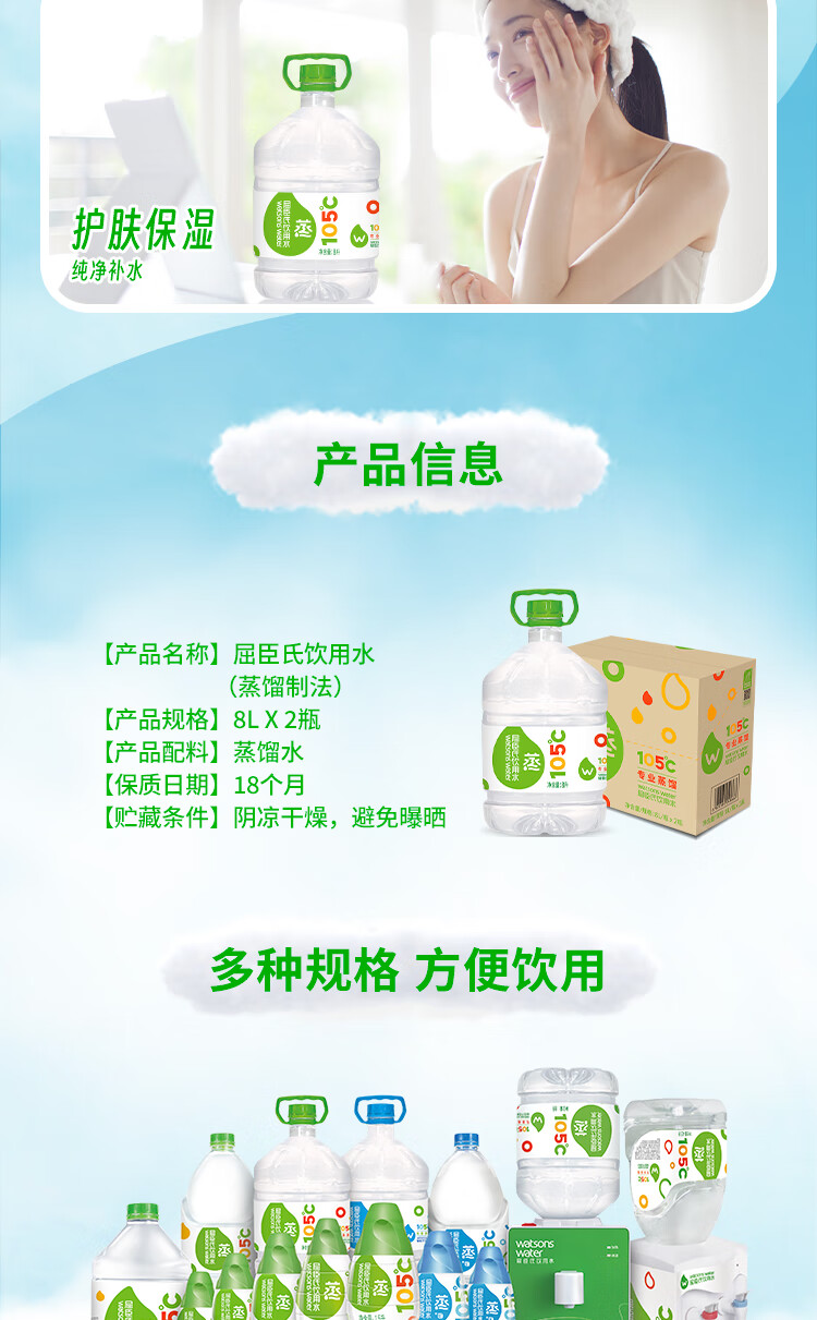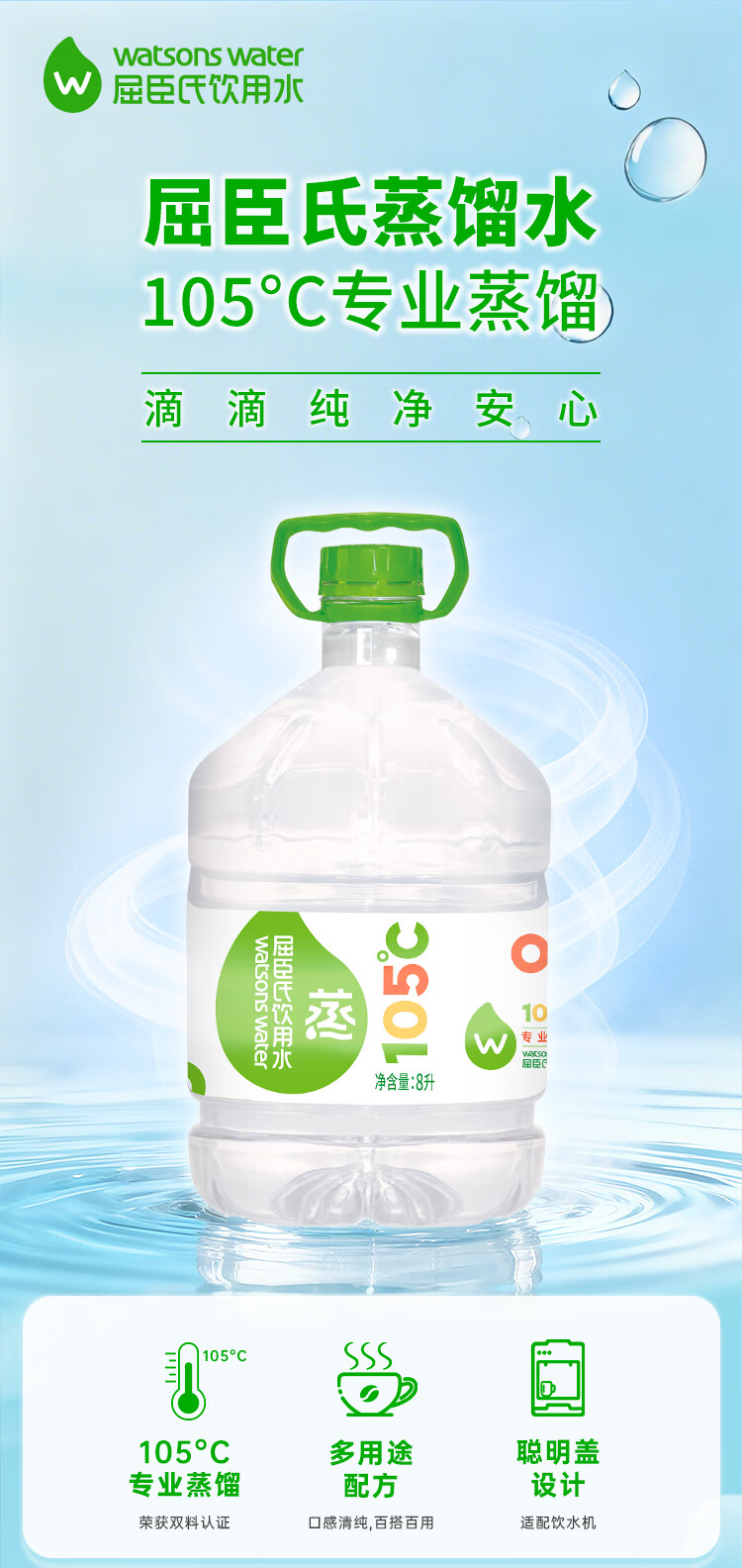 屈臣氏蒸馏水纯净水8L*2桶整箱大桶装水饮用水家庭装泡茶煲汤