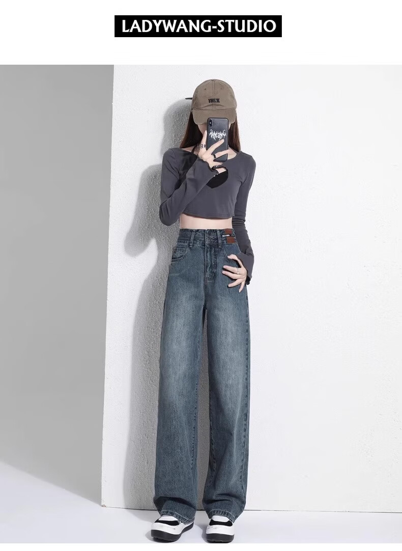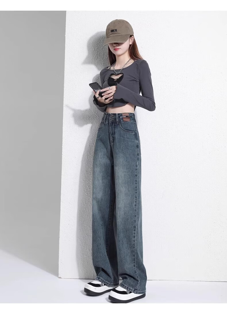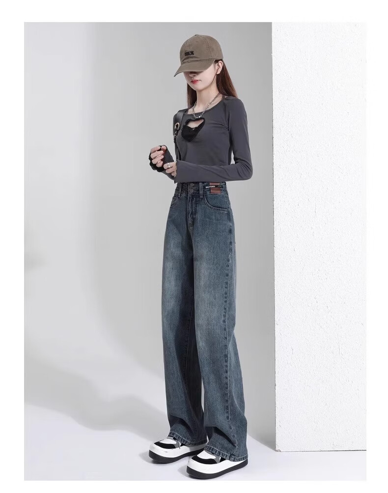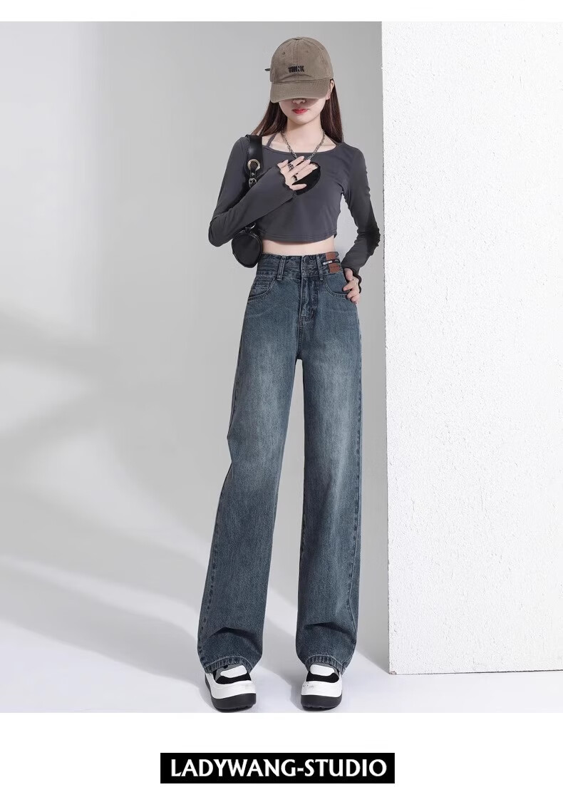 翊尚美牛仔裤女复古高腰显瘦宽松阔腿裤子女小个子2025秋冬新款休闲裤 蓝灰色 【遮胯抗起球加绒款】 M 【适合95-110斤】