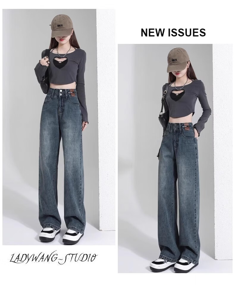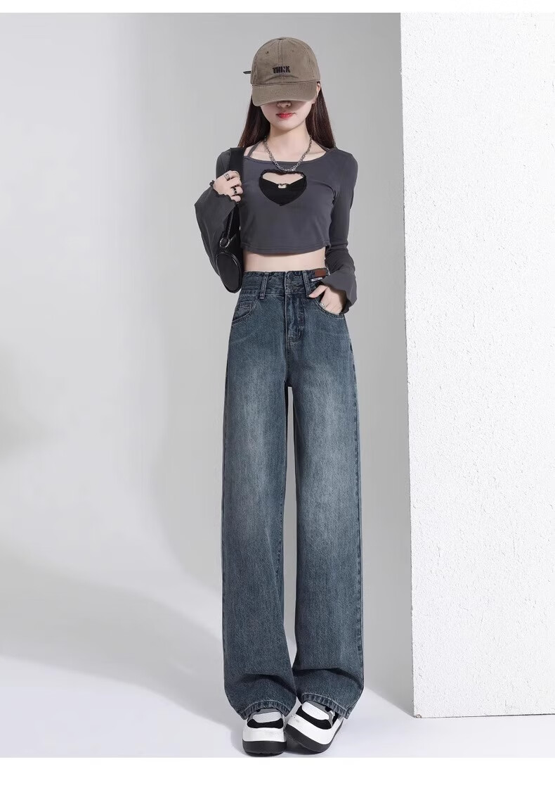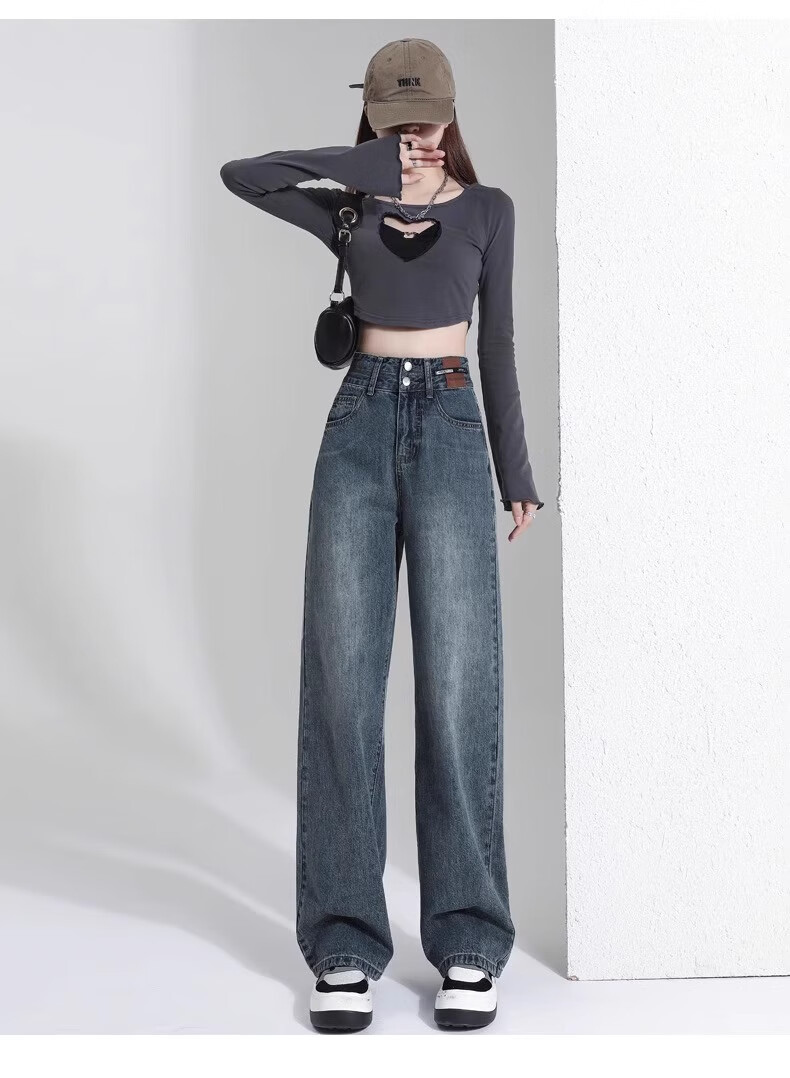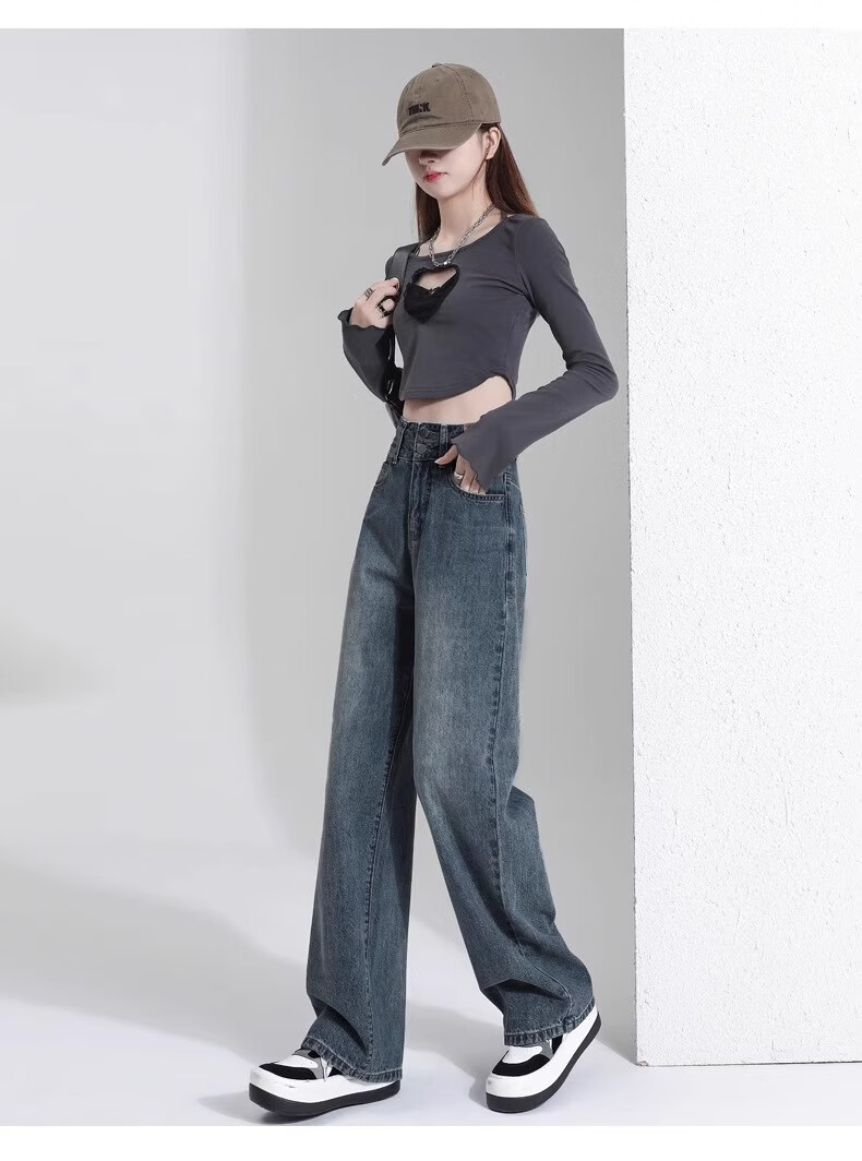 翊尚美牛仔裤女复古高腰显瘦宽松阔腿裤子女小个子2025秋冬新款休闲裤 蓝灰色 【遮胯抗起球加绒款】 M 【适合95-110斤】
