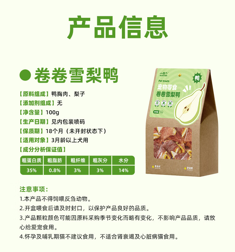 小鲜引;FOLLOW FRESH狗零食风干鸭肉雪梨宠物磨牙棒耐咬训犬奖励咬胶狗饼干 【清热食材】鸭肉绕雪梨100g