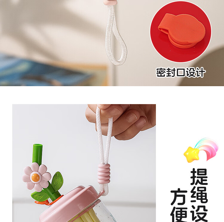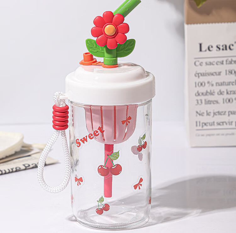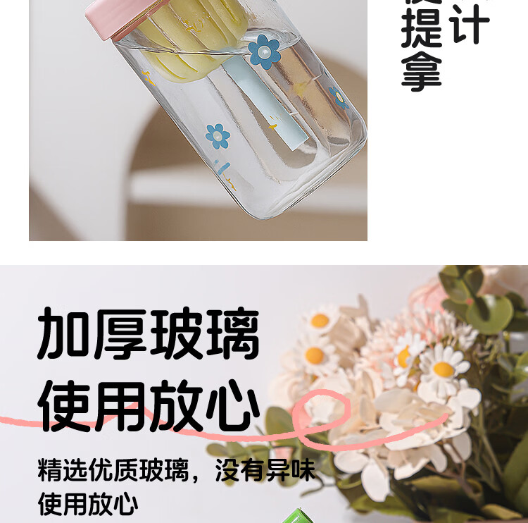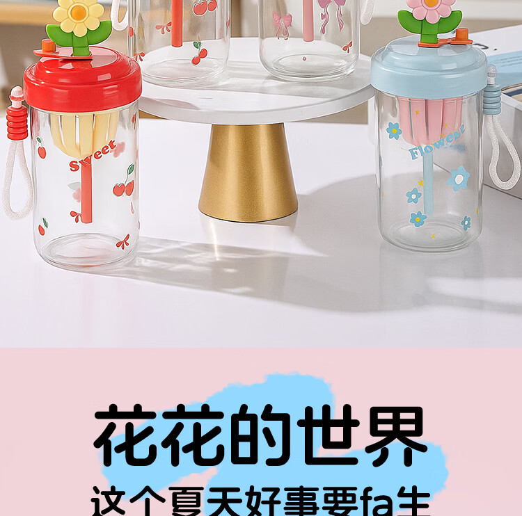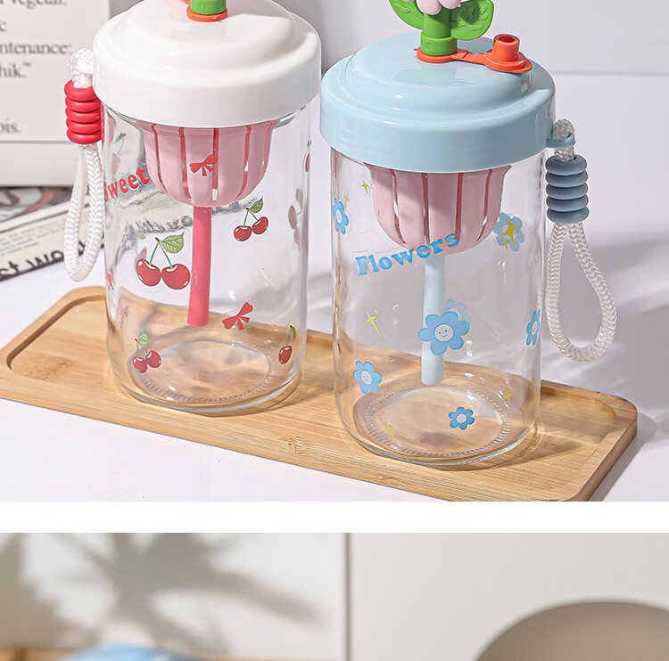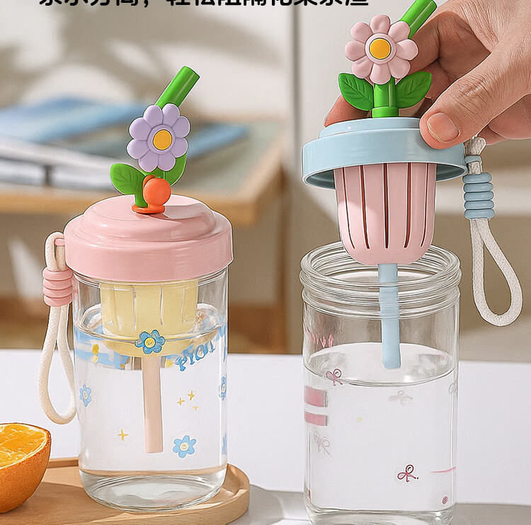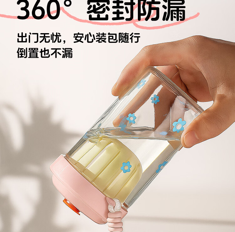 网红吸管杯便携式茶水分离杯带提绳玻璃杯高档花茶杯新款果汁杯子 蓝色杯子送DIY贴纸 单只装500ml