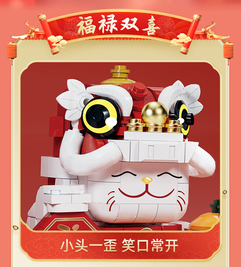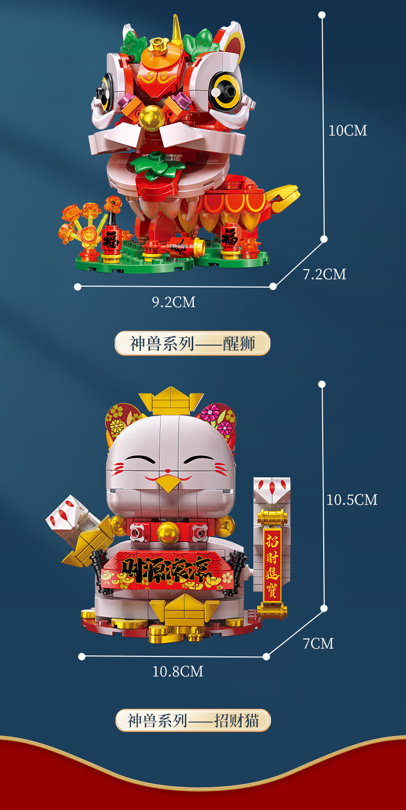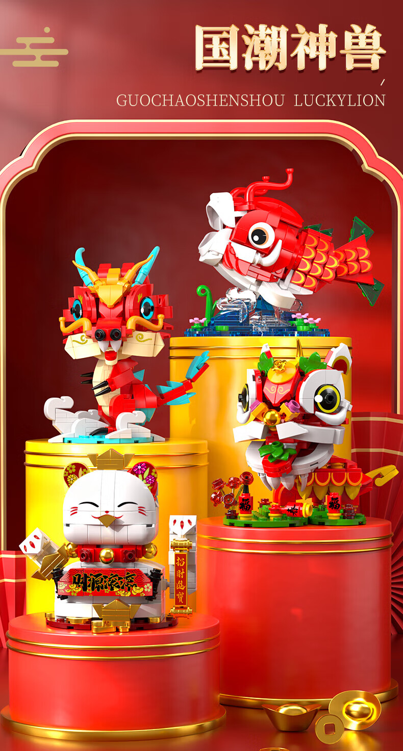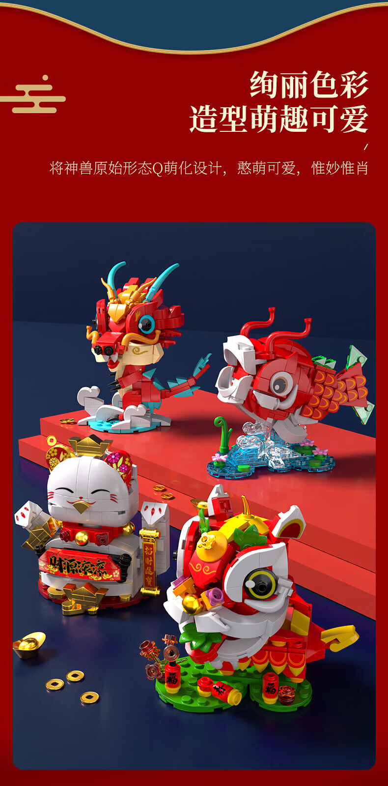 乐凑(L)中国四大神兽积木拼装模型儿童玩具摆件男孩6-12岁过年礼物礼盒 醒狮招财猫800+Pcs